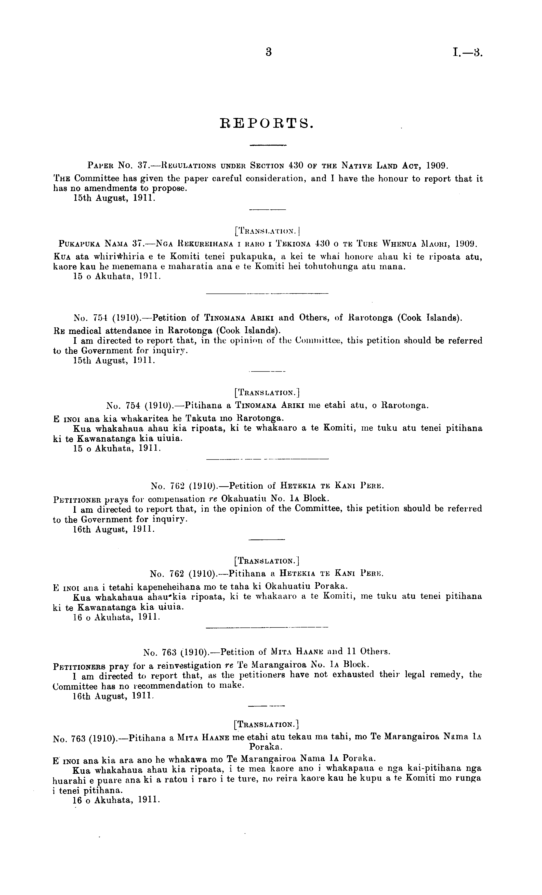 [Translation.] No. 762 (1910). -Pitihana a Hetekia te Kani Pere. E iNOi ana i tetahi kapeneheihana mo te taha ki Okahuatiu Poraka. Kua whakahaua ahau'kia ripoata, kite whakaaro a te Komiti, me tuku atu tenei pitihana kite Kawanatanga kia uiuia. 16 o Akuhata, 1911.