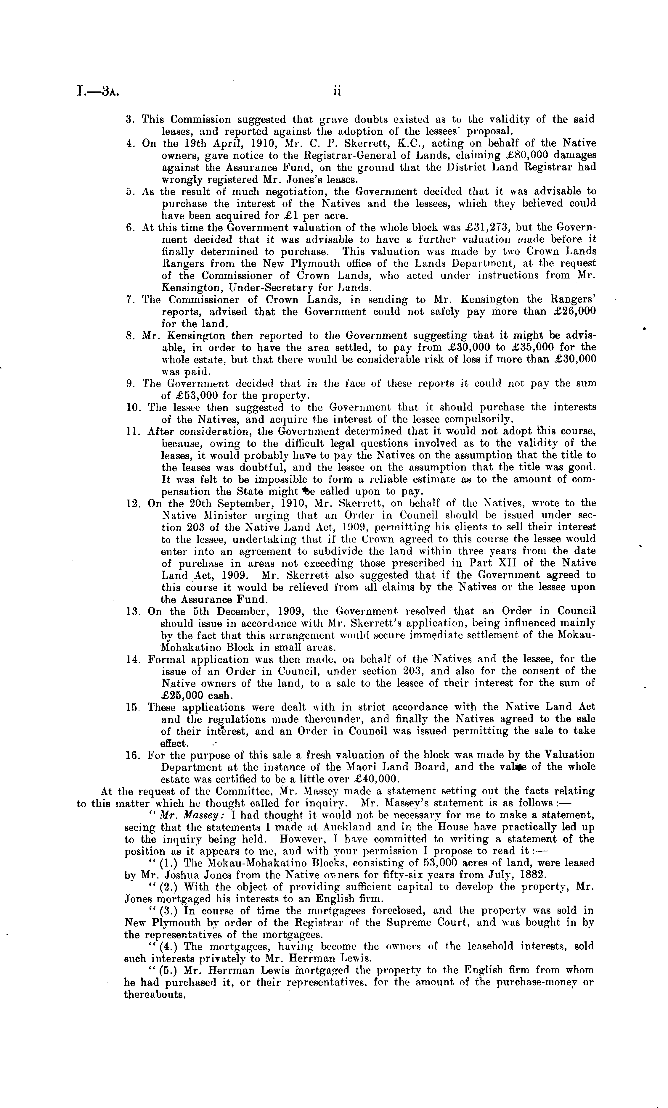 3. This Commission suggested that grave doubts existed as to the validity of the said leases, and reported against the adoption of the lessees' proposal. 4. On the 19th April, 1910, Mr. C. P. Skerrett, K.C., acting on behalf of the Native owners, gave notice to the Registrar-General of Lands, claiming .£BO,OOO damages against the Assurance Fund, on the ground that the District Land Registrar had wrongly registered Mr. Jones's leases. 5. As the result of much negotiation, the Government decided that it was advisable to purchase the interest of the Natives and the lessees, which they believed could have been acquired for £1 per acre. 6. At this time the Government valuation of the whole block was £31,273, but the Government decided that it was advisable to have a further valuation made before it finally determined to purchase. This valuation was made by two Crown Lands Rangers from the New Plymouth office of the Lands Department, at the request of the Commissioner of Crown Lands, who acted under instructions from Mr. Kensington, Under-Secretary for Lands. 7. The Commissioner of Crown Lands, in sending to Mr. Kensington the Rangers' reports, advised that the Government could not safely pay more than £26,000 for the land. 8. Mr. Kensington then reported to the Government suggesting that it might be advisable, in order to have the area settled, to pay from £30,000 to £35,000 for the whole estate, but that there would be considerable risk of loss if more than £30,000 was paid. 9. The Government decided that in the face of these reports it could not pay the sum of £53,000 for the property. 10. The lessee then suggested to the Government that it should purchase the interests of the Natives, and acquire the interest of the lessee compulsorily. 11. After consideration, the Government determined that it would not adopt tliis course, because, owing to the difficult legal questions involved as to the validity of the leases, it would probably have to pay the Natives on the assumption that the title to the leases was doubtful, and the lessee on tin , assumption that the title was good. It was felt to be impossible to form a reliable estimate as to the amount of compensation the State might tie called upon to pay. 12. On the 20th September, 1910, Mr. Skerrett, on behalf of the Natives, wrote to the Native Minister urging that an Order in Council should be issued under section 203 of the Native Land Act, L 909, permitting his clients to sell their interest to the lessee, undertaking that if the Crown agreed to this course the lessee would enter into an agreement to subdivide the land within three years from the date of purchase in areas not exceeding those prescribed in Part XII of the Native Land Act, 1909. Mr. Skerrett also suggested that if the Government agreed to this course it would be relieved from all claims by the Natives or the lessee upon the Assurance Fund. 13. On the sth December, 1909, the Government resolved that an Order in Council should issue in accord nice with Mr. Skerrett's application, being influenced mainly by the fact that this arrangemeni would secure immediate settlement of the MokauMohakatino Block in small areas. 14. Formal application was then made, on behalf of the Natives and the lessee, for the issue of an Order in Council, under section 203, and also for the consent of the Native owners of the land, to a sale to the lessee of their interest for the sum of £25,000 cash. 15. These applications were dealt with in strict accordance with the Native Land Act and the regulations made thereunder, and finally the Natives agreed to the sale of their interest, and an Order in Council was issued permitting the sale to take effect. 16. For the purpose of this sale a fresh valuation of the block was made by the Valuation Department at the instance of the Maori Land Board, and the value of the whole estate was certified to be a little over £40,000. At the request of the Committee, Mr. Massev made a statement setting out the facts relating to this matter which he thought called for inquiry. Mr. Massey's statement is as follows: — " Mr. Massey: I had thought it would not be necessary for me to make a statement, seeing that the statements I made at Auckland and in the House have practically led up to the inquiry being held. However, I have committed to writing a statement of the position as it appears to me, and with your permission I propose to read it: — " (1.) The Mokau-Mohakatino Blocks, consisting of 53,000 acres of land, were leased by Mr. Joshua Jones from the Native owners for fifty-six years from July, 1882. " (2.) With the object of providing sufficient capital to develop the property, Mr. Jones mortgaged his interests to an English firm. " (3.) In course of time the mortgagees foreclosed, and the property was sold in New Plymouth by order of the Registrar of the Supreme Court, and was bought in by the representatives of the mortgagees. " (4.) The mortgagees, having become the owners of the leasehold interests, sold such interests privately to Mr. Herrman Lewis. " (5.) Mr. Herrman Lewis mortgaged the property to the English firm from whom he had purchased it, or their representatives, for the amount of the purchase-money or thereabouts.