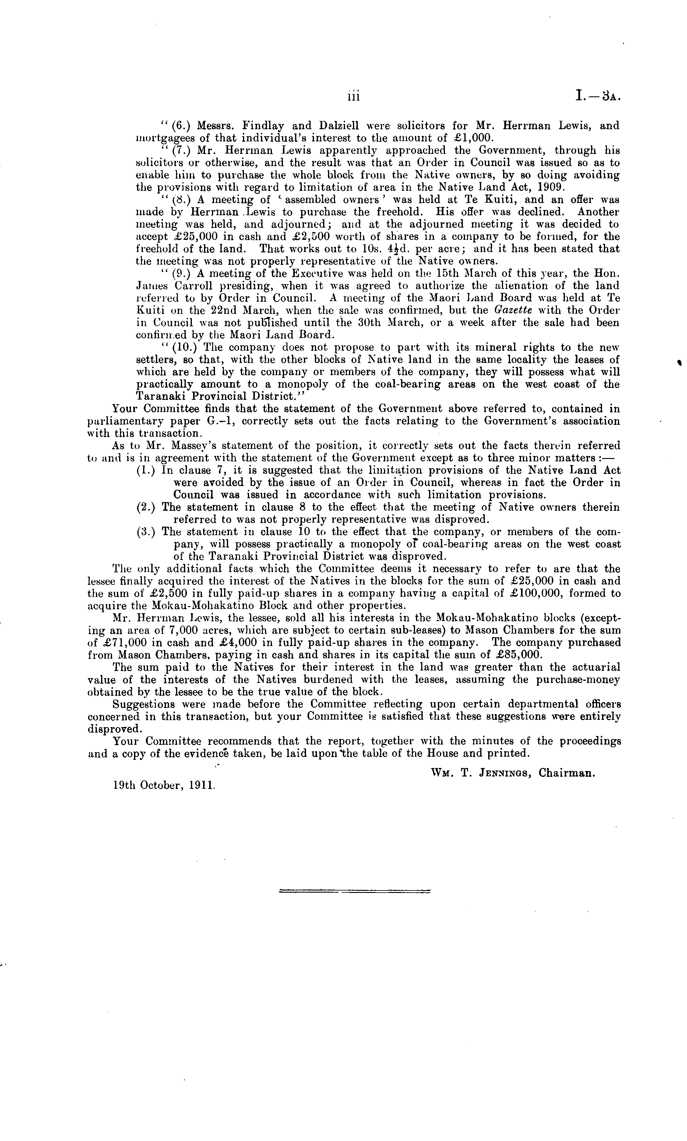 " (6.) Messrs. Findlay and Dalziell were solicitors for Mr. Herrman Lewis, and mortgagees of that individual's interest to the amount of £1,000. " (7.) Mr. Herrman Lewis apparently approached the Government, through his solicitors or otherwise, and the result was that an Order in Council was issued so as to enable him to purchase the whole block from the Native owners, by so doing avoiding the provisions with regard to limitation of area in the Native Land Act, 1909. " (&.) A meeting of ' assembled owners ' was held at Te Kuiti, and an offer was made by Herrman Lewis to purchase the freehold. His offer was declined. Another meeting was held, iind adjourned; and at the adjourned meeting it was decided to accept £25,000 in cash and £2,500 worth of shares in a company to be formed, for the freehold of the land. That works out to 10s. 4id. per acre; and it has been stated that the meeting was not properly representative of the Native owners. " (9.) A meeting of the Executive was held on the 15th March of this year, the Hon. James Carroll presiding, when it was agreed to authorize the alienation of the land referred to by Order in Council. A meeting of the Maori Land Board was held at Te Kuiti on the 22nd March, when the sale was confirmed, but the Gazette with the Order in Counoil was not published until the 30th March, or a week after the sale had been confiru.ed by the Maori Land Board. " (10.) The company does not propose to part with its mineral rights to the new settlers, so that, with the other blocks of Native land in the same locality the leases of « which are held by the company or members of the company, they will possess what will practically amount to a monopoly of the coal-bearing areas on the west coast of the Taranaki Provincial District." Your Committee finds that the statement of the Government above referred to, contained in parliamentary paper G.-l, correctly sets out the facts relating to the Government's association with this transaction. As to Mr. Massey's statement of the position, it correctly sets out the facts therein referred to and is in agreement with the statement of the Government except as to three minor matters : — (1.) In clause 7, it is suggested that the limitation provisions of the Native Land Act were avoided by the issue of an Order in Council, whereas in fact the Order in Council was issued in accordance with such limitation provisions. (2.) The statement in clause 8 to the effect that the meeting of Native owners therein referred to was not properly representative was disproved. (;).) The statement in clause 10 to the effect that the company, or members of the company, will possess practically a monopoly oF coal-bearing areas on the west coast of the Taranaki Provincial District was disproved. The only additional facts which the Committee deems it necessary to refer to are that the lessee finally acquired the interest of the Natives in the blocks for the sum of £25,000 in cash and the sum of £2,500 in fully paid-up shares in a company having a capital of £100,000, formed to acquire the Mokau-Mohakatino Block and other properties. Mr. Herrman Lewis, the lessee, sold all his interests in the Mokau-Mohakatino blocks (excepting an area of 7,000 acres, which are subject to certain sub-leases) to Mason Chambers for the sum of £71,000 in cash and £4,000 in fully paid-up shares in the company. The company purchased from Mason Chambers, paying in cash and shares in its capital the sum of £85,000. The sum paid to the Natives for their interest in the land was greater than the actuarial value of the interests of the Natives burdened with the leases, assuming the purchase-money obtained by the lessee to be the true value of the block. Suggestions were made before the Committee reflecting upon certain departmental officers concerned in this transaction, but your Committee is satisfied that these suggestions were entirely disproved. You) , Committee recommends that the report, together with the minutes of the proceedings and a copy of the evidence taken, be laid upon "the table of the House and printed. Wμ. T. Jennings, Chairman. 19th October, 1911.