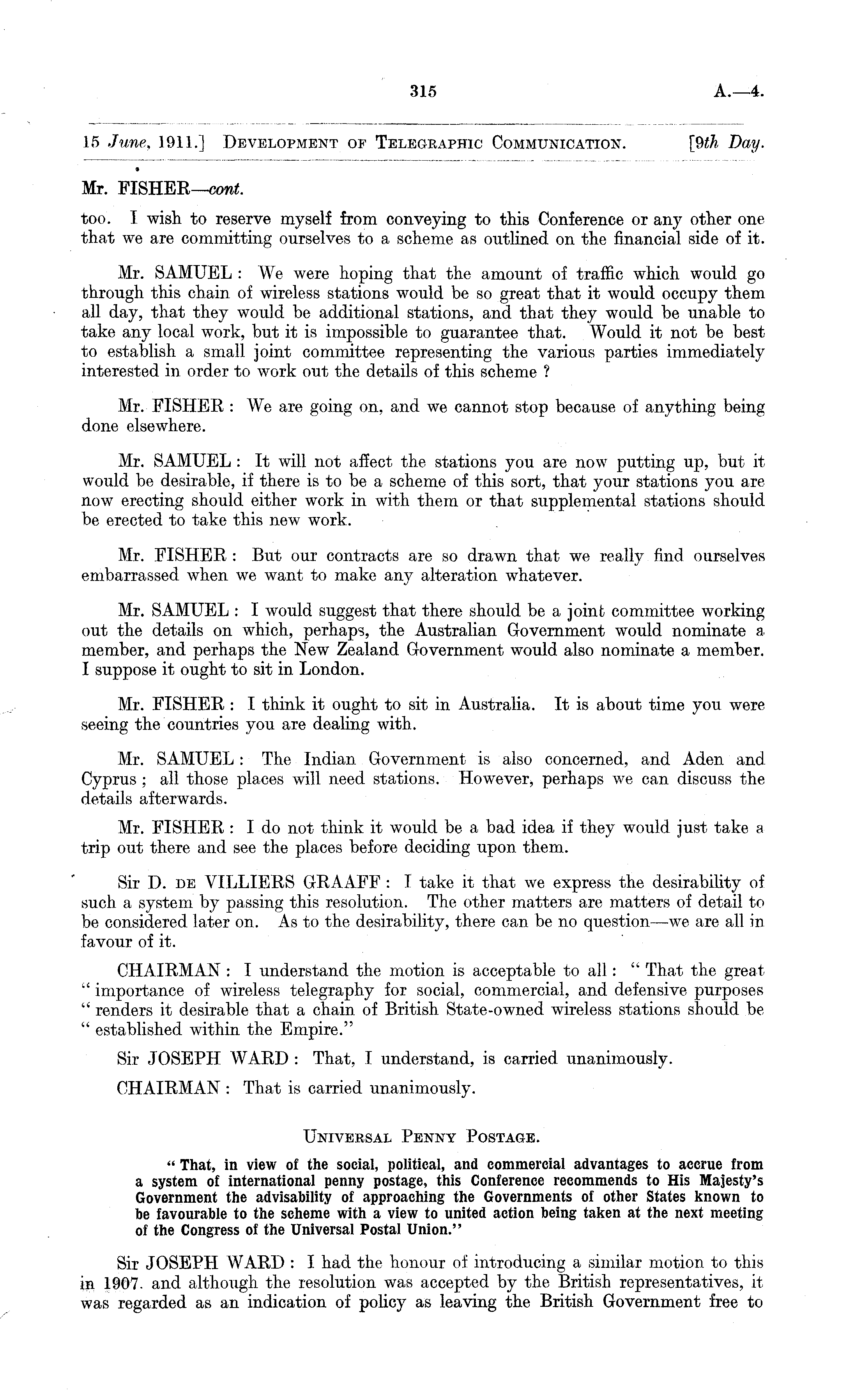 15 June, 1911.] Development of Telegraphic Communication. [9th Day. Mr. FISHER— cont. too. I wish to reserve myself from conveying to this Conference or any other one that we are committing ourselves to a scheme as outlined on the financial side of it. Mr. SAMUEL : We were hoping that the amount of traffic which would go through this chain of wireless stations would be so great that it would occupy them all day, that they would be additional stations, and that they would be unable to take any local work, but it is impossible to guarantee that. Would it not be best to establish a small joint committee representing the various parties immediately interested in order to work out the details of this scheme ? Mr. FISHER : We are going on, and we cannot stop because of anything being done elsewhere. Mr. SAMUEL : It will not affect the stations you are now putting up, but it would be desirable, if there is to be a scheme of this sort, that your stations you are now erecting should either work in with them or that supplemental stations should be erected to take this new work. Mr. FISHER : But our contracts are so drawn that we really find ourselves embarrassed when we want to make any alteration whatever. Mr. SAMUEL : I would suggest that there should be a joint committee working out the details on which, perhaps, the Australian Government would nominate a member, and perhaps the New Zealand Government would also nominate a member. I suppose it ought to sit in London. Mr. FISHER : I think it ought to sit in Australia. It is about time you were seeing the countries you are dealing with. Mr. SAMUEL: The Indian Government is also concerned, and Aden and Cyprus ; all those places will need stations. However, perhaps we can discuss the details afterwards. Mr. FISHER : I do not think it would be a bad idea if they would just take a trip out there and see the places before deciding upon them. Sir D. de VILLIERS GRAAFF : I take it that we express the desirability of such a system by passing this resolution. The other matters are matters of detail to be considered later on. As to the desirability, there can be no question—we are all in favour of it. CHAIRMAN : I understand the motion is acceptable to all: " That the great " importance of wireless telegraphy for social, commercial, and defensive purposes " renders it desirable that a chain of British State-owned wireless stations should be " established within the Empire." Sir JOSEPH WARD : That, I understand, is carried unanimously. CHAIRMAN : That is carried unanimously. Universal Penny Postage. " That, in view of the social, political, and commercial advantages to accrue from a system of international penny postage, this Conference recommends to His Majesty's Government the advisability of approaching the Governments of other States known to be favourable to the scheme with a view to united action being taken at the next meeting of the Congress of the Universal Postal Union." Sir JOSEPH WARD : I had the honour of introducing a similar motion to this in 1907. and although the resolution was accepted by the British representatives, it was regarded as an indication of policy as leaving the British Government free to