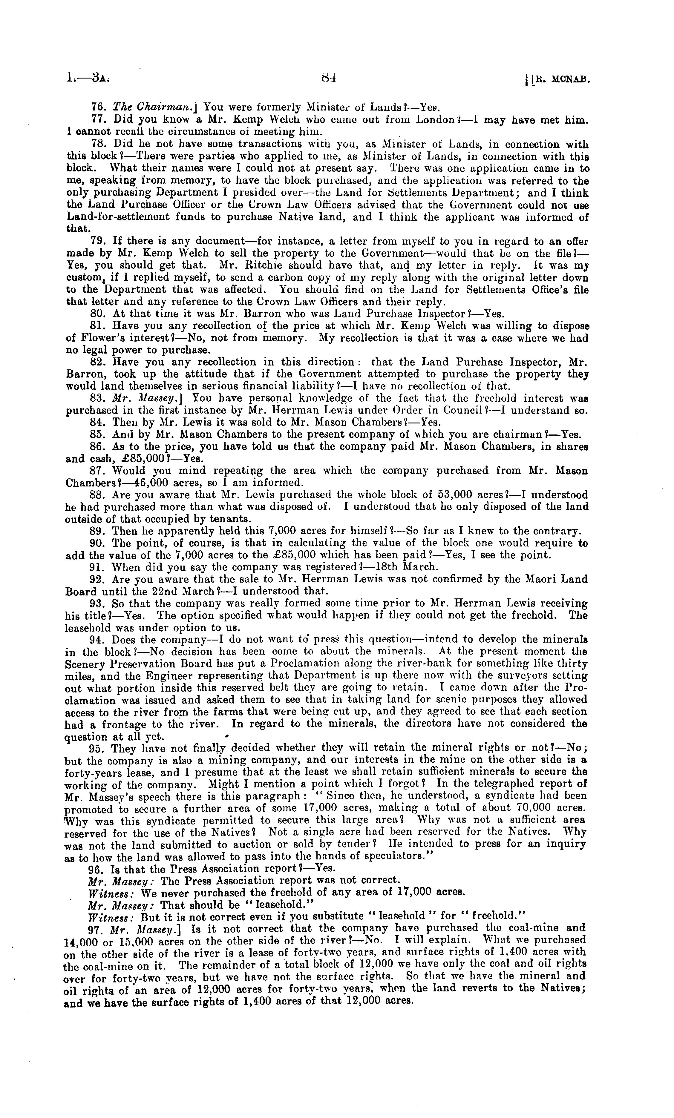 76. The Chairman. J You were formerly Minister of Lands? —Yes. 77. Did you know a Mr. Kemp Welch who came out from London f —l may have met him. 1 cannot recall the circumstance of meeting him. 78. Did he not have some transactions with you, as Minister of Lands, in connection with this block'/ —There were parties who applied to me, as Minister of Lands, in connection with this block. What their names were I could not at present say. There was one application came in to me, speaking from memory, to have the block purchased, and the application was referred to the only purchasing Department I presided over—the Land for Settlements Department; and I think the Land Purchase Officer or the Crown Law Officers advised that the Government could not use Land-for-settlemeiit funds to purchase Native land, and I think the applicant was informed of that. 79. If there is any document—for instance, a letter from myself to you in regard to an offer made by Mr. Kemp Welch to sell the property to the Government —would that be on the file J — Yes, you should get that. Mr. Ritchie should have that, and my letter in reply. It was my custom, if I replied myself, to send a carbon copy of my reply along with the original letter down to the Department that was affected. You should find on the Land for Settlements Office's file that letter and any reference to the Crown Law Officers and their reply. 80. At that time it was Mr. liarron who was Land Purchase Inspector'/—Tes. 81. Have you any recollection of the price at which Mr. Kemp Welch was willing to dispose of Flower's interest? —No, not from memory. My recollection is that it was a case where we had no legal power to purchase. 82. Have you any recollection in this direction : that the Land Purchase Inspector, Mr. Barron, took up the attitude that if the Government attempted to purchase the property they would land themselves in serious financial liability? —I have no recollection of that. 83. Mr. Massey.] You have personal knowledge of the fact that the freehold interest was purchased in the first instance by Mr. Herrman Lewis under Order in Council?—l understand so. 84. Then by Mr. Lewis it was sold to Mr. Mason Chambers?— Yes. 85. And by Mr. Mason Chambers to the present company of which you are chairman? —Yes. 86. As to the price, you have told us that the company paid Mr. Mason Chambers, in shares and cash, £85,000?— Yes. 87. Would you mind repeatipg the area which the company purchased from Mr. Mason Chambers? —46,000 acres, so I am informed. 88. Are you aware that Mr. Lewis purchased the whole block of 53,000 acres?—l understood he had purchased more than what was disposed of. I understood that he only disposed of the land outside of that occupied by tenants. 89. Then he apparently held this 7,000 acres for himself? —So far as I knew to the contrary. 90. The point, of course, is that in calculating the value of the block one would require to add the value of the 7,000 acres to the £85,000 which has been paid? —Yes, I see the point. 91. When did you say the company was registered? —18th March. 92. Are you aware that the sale to Mr. Herrman Lewis was not confirmed by the Maori Land Board until the 22nd March? —I understood that. 93. So that the company was really formed some time prior to Mr. Herrman Lewis receiving his title? —Yes. The option specified what would happen if they could not get the freehold. The leasehold was under option to us. 94. Does the company —I do not want to" press this question —intend to develop the minerals in the block?—No decision has been come to about the minerals. At the present moment the Scenery Preservation Board has put a Proclamation along the river-bank for something like thirty miles, and the Engineer representing that Department is up there now with the surveyors setting out what portion inside this reserved belt they are going to retain. I came down after the Proclamation was issued and asked them to see that in taking land for scenic purposes they allowed access to the river from the farms that were being cut up, and they agreed to see that each section had a frontage to the river. In regard to the minerals, the directors have not considered the question at all yet. * 95. They have not finally decided whether they will retain the mineral rights or not?—No; but the company is also a mining company, and our interests in the mine on the other side is a forty-years lease, and I presume that at the least we shall retain sufficient minerals to secure the working of the company. Might I mention a point which I forgot? In the telegraphed report of Mr. Massey's speech there is this paragraph: " Since then, he understood, a syndicate had been promoted to secure a further area of some 17,000 acres, making a total of about 70,000 acres. Why was this syndicate permitted to secure this large area? Why was not a sufficient area reserved for the use of the Natives? Not a single acre had been reserved for the Natives. Why was not the land submitted to auction or sold by tender? He intended to press for an inquiry as to how the land was allowed to pass into the hands of speculators." 96. Is that the Press Association report?— Yes. Mr. Masse?/: The Press Association report was not correct. Witness: We never purchased the freehold of any area of 17,000 acres. Mr. Massey: That should be "leasehold." Witness: But it is not correct even if you substitute " leasehold " for " freehold." 97. Mr. Massey.] Is it not correct that the company have purchased the coal-mine and 14,000 or 15,000 acres on the other side of the river?— No. I will explain. What we purchased on'the other side of the river is a lease of forty-two years, and surface rights of 1.400 acres with the coal-mine on it. The remainder of a total block of 12,000 we have only the coal and oil rights over for forty-two years, but we have not the surface rights. So that we have the mineral and oil rights of an area of 12,00
