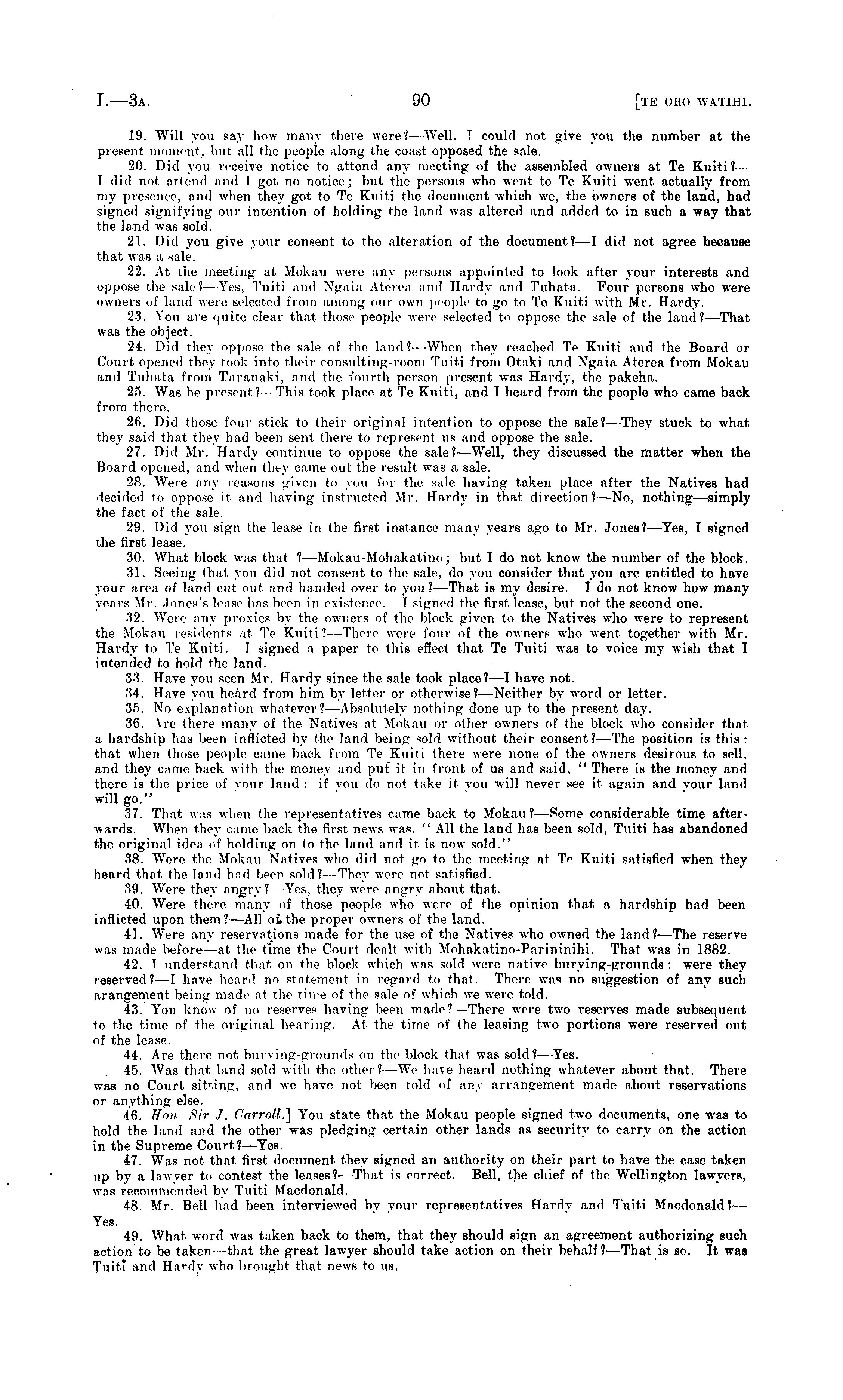19. Will you say how many there were?— Well, \ could not give you the number at the present moment, but all the people along the coast opposed the sale. 20. Did you receive notice to attend any meeting of the assembled owners at Te Kuiti? — T did not attend and I got no notice; but the persons who went to Te Kuiti went actually from my present c, and when they got to Te Kuiti the document which we, the owners of the land, had .signed signifying our intention of holding the land was altered and added to in such a way that the land was sold. 21. Did you give your consent to the alteration of the document? —I did not agree because that was a sale. 22. At the meeting at Mokau were any persona appointed to look after your interests and oppose the sale.' Yes. Tuiti and Ngaia Aterea and Hardy and Tuhata. Four persons who were owners of land were selected from among our own people to go to Te Kuiti with Mr. Hardy. 23. You are quite clear that those people were selected to oppose the sale of the land? —That was the object. 24. Did they oppose the sale of the land?- When they reached Te Kuiti and the Board or Court opened they tool; into their consulting-room Tuiti from Otaki and Ngaia Aterea from Mokau and Tuhata from Taranaki, and the fourth person present was Hardy, the pakeha. 25. Was he present? — This took place at Te Kuiti, and I heard from the people who came back from there. 26. Did those four stick to their original intention to oppose the sale?— They stuck to what they said that they had been sent there to represent Uβ and oppose the sale. 27. Did Mr. Hardy continue to oppose the sale?— Well, they discussed the matter when the Board opened, and when tiny came out the result was a sale. 28. Were any reasons given to you for tin , sale having taken place after the Natives had decided to oppose it and having instructed Mr. Hardy in that direction? —No, nothing —simply the fact of the sale. 29. Did you sign the lease in the first instance many years ago to Mr. Jones? —Yes, I signed the first lease. 30. What block was that ?— Mokau-Mohakatino ; but I do not know the number of the block. 31. Seeing that you did not consent to the sale, do you consider that you are entitled to have your area of land cut out and handed over to you? —That is my desire. Ido not know how many years Mr. Jones's lease lias been in existence. 1 signed the first lease, but not the second one. 32. Were any proxies by the owners of the block given to the Natives who were to represent the Mokau residents at Te Kuiti?— There were four of the owners who went together with Mr. Hardy to Te Kuiti. 1 signed a paper t" this effect that Te Tuiti was to voice my wish that I intended to hold the land. 33. Have you seen Mr. Hardy siiice the sale took place? —I have not. 34-. Have you hoard from him by letter or otherwise? —Neither by word or letter. 35. Xo explanation whatever?— Absolutely nothing done up to the present day. 36. Are there many of the Natives at Mokau or other owners of the block who consider that a hardship lias bees inflicted by the land being sold without their consent?— The position is this: that when those people came back from Te Kuiti there were none of the owners desirous to sell, and they came back with the money and put it in front of us and said. " There is the money and there is the price of your land : if you do not tflke it you will never see it again and your land will go." 37. That was when the representatives came back to Mokau ?—Some considerable time afterwards. When they came back the first news was. " All the land has been sold, Tuiti has abandoned the original idea of holding on to the land and it is now sold." 38. Were the Mokau Natives who did not go to the meeting at Te Kuiti satisfied when they heard that the land had been sold?— They were not satisfied. 39. Were they amjry? —Yes, they were angry about that. 40. Were there many of those people who were of the opinion that a hardship had been inflicted upon them?— All ou the proper owners of the land. 41. Were any reservations made for the use of the Natives who owned the land?— The reserve was made before —at the time the Court dealt with Mohakatino-Parininihi. That was in 1882. 42. 1 understand that on the block which was sold were native burying-grounds : were they reserved? — 1 have heard no statement in regard to that. There was no suggestion of any such arangernent being made at the time of the sale of which we were told. 43. You know of no reserves having been made?— There were two reserves made subsequent to the time of the original hearing. At the time of the leasing two portions were reserved out of the lease. 44. Are there not burying-grounds on the block that was sold 1— Yes. 45. Was that land sold with the other?—We have heard nothing whatever about that. There was no Court sitting, and we have not been told of any arrangement made about reservations or anything else. 46. lion Si?' J. Carroll.] You state that the Mokau people signed two documents, one was to hold the land and the other was pledging certain other lands as security to carry on the action in the Supreme Court?— Yes. 47. Was not that first document they signed an authority on their part to have the case taken up by a lawyer to contest the leases? —That is correct. Bell, the chief of the Wellington lawyers, was recommended by Tuiti Macdonald. 48. Mr. Bell had been interviewed by your representatives Hardy and Tuiti Macdonald? — Yes. 49. What word was taken back to them, that they should sign an agreement authorizing such action to be taken —that the great lawyer should take action on their behalf?— That is so. It was Tuiti and Hardy who brought that news to us.