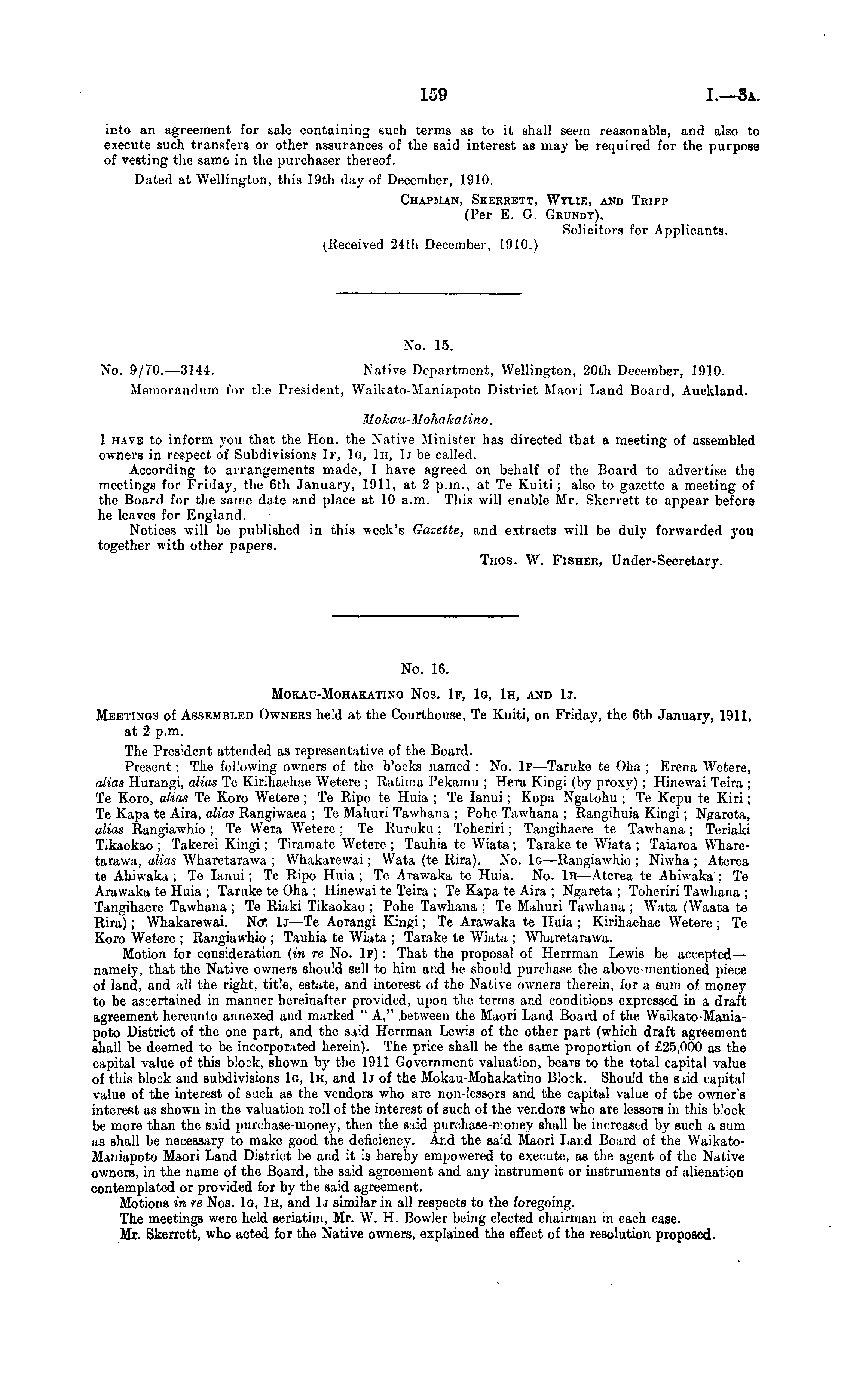 No. 15. No. 9/70. —3144. Native Department, Wellington, 20th December, 1910. Memorandum for the President, Waikato-Maniapoto District Maori Land Board, Auckland. Mokau-Mohakatino. I have to inform you that the Hon. the Native Minister has directed that a meeting of assembled owners in respect of Subdivisions If, 10, Ih, 1j be called. According to arrangements made, I have agreed on behalf of the Board to advertise the meetings for Friday, the 6th January, 1911, at 2 p.m., at Te Kuiti; also to gazette a meeting of the Board for the same date and place at 10 a.m. This will enable Mr. Skerrett to appear before he leaves for England. Notices will be published in this -week's Gazette, and extracts will be duly forwarded you together with other papers. Thos. W. Fisher, Under-Secretary.
