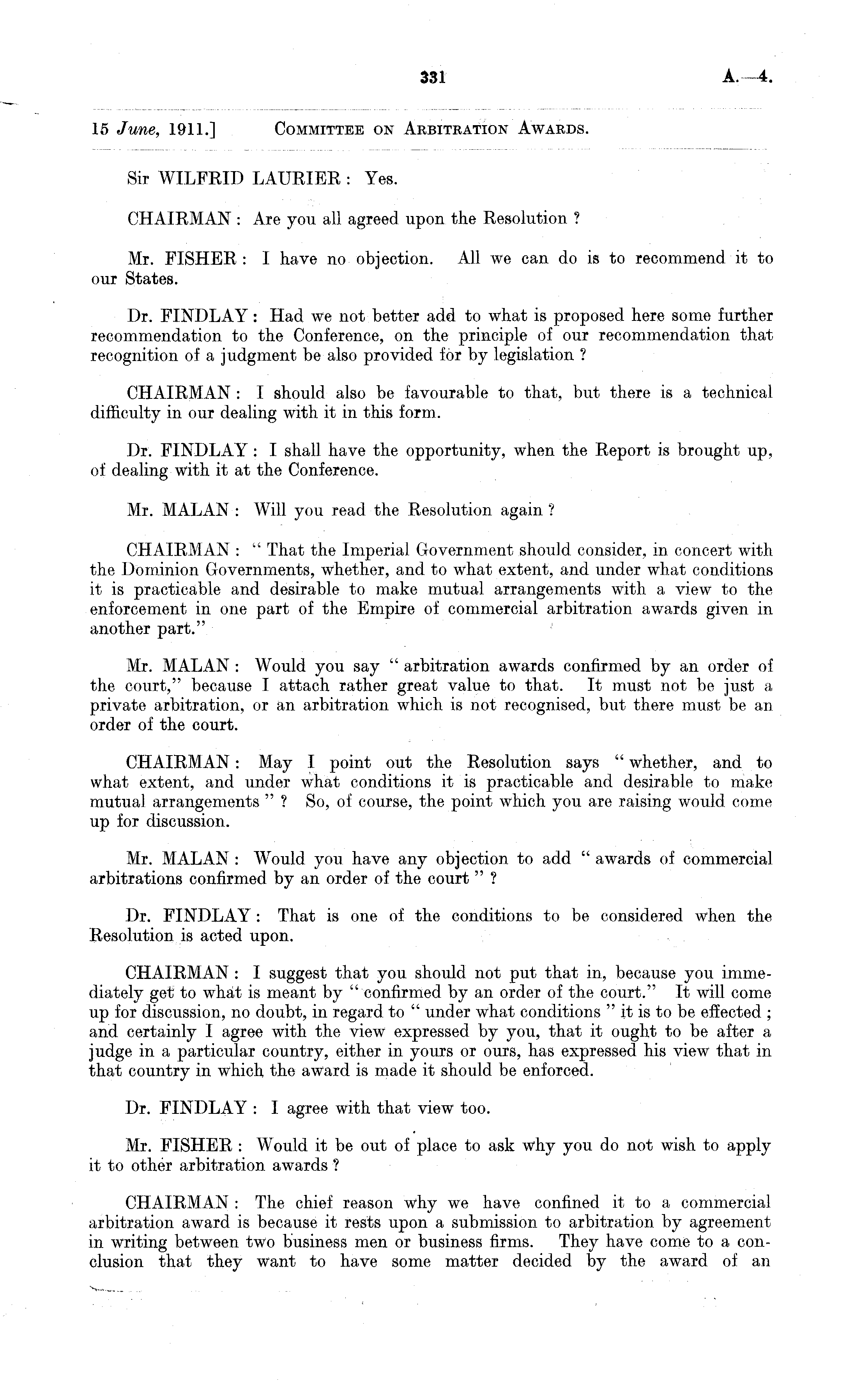 15 June, 1911.] Committee on Arbitration Awards. Sir WILFRID LAURIER : Yes. CHAIRMAN : Are you all agreed upon the Resolution ? Mr. FISHER : I have no objection. All we can do is to recommend it to our States. Dr. FINDLAY : Had we not better add to what is proposed here some further recommendation to the Conference, on the principle of our recommendation that recognition of a judgment be also provided for by legislation ? CHAIRMAN : I should also be favourable to that, but there is a technical difficulty in our dealing with it in this form. Dr. FINDLAY: I shall have the opportunity, when the Report is brought up, of dealing with it at the Conference. Mr. MALAN : Will you read the Resolution again ? CHAIRMAN : " That the Imperial Government should consider, in concert with the Dominion Governments, whether, and to what extent, and under what conditions it is practicable and desirable to make mutual arrangements with a view to the enforcement in one part of the Empire of commercial arbitration awards given in another part." Mr. MALAN : Would you say " arbitration awards confirmed by an order of the court," because I attach rather great value to that. It must not be just a private arbitration, or an arbitration which is not recognised, but there must be an order of the court. CHAIRMAN: May I point out the Resolution says " whether, and to what extent, and under what conditions it is practicable and desirable to make mutual arrangements " ? So, of course, the point which you are raising would come up for discussion. Mr. MALAN : Would you have any objection to add " awards of commercial arbitrations confirmed by an order of the court " ? Dr. FINDLAY: That is one of the conditions to be considered when the Resolution is acted upon. CHAIRMAN : I suggest that you should not put that in, because you immediately get to what is meant by " confirmed by an order of the court." It will come up for discussion, no doubt, in regard to " under what conditions " it is to be effected ; and certainly I agree with the view expressed by you, that it ought to be after a judge in a particular country, either in yours or ours, has expressed his view that in that country in which the award is made it should be enforced. Dr. FINDLAY : I agree with that view too. Mr. FISHER : Would it be out of place to ask why you do not wish to apply it to other arbitration awards ? CHAIRMAN : The chief reason why we have confined it to a commercial arbitration award is because it rests upon a submission to arbitration by agreement in writing between two business men or business firms. They have come to a conclusion that they want to have some matter decided by the award of an