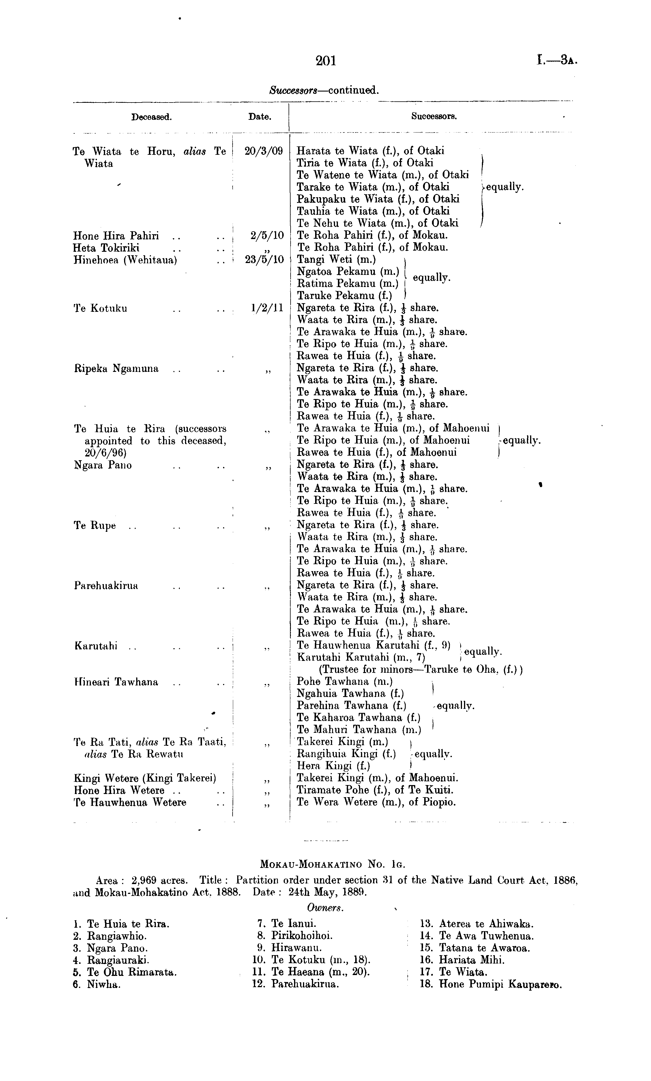 MOKAU-MOHAKATINO No. lG. Area : 2,969 acres. Title : Partition order under section 31 of the Native Land Court Act. 1886. and Mokau-Mohakatino Act. 1888. Date : 24th May, 1889. Owners. ■• 1. Te Huia te Rira. 7. Te lanui. 13. Aterea te Ahiwaka. 2. Rangiawhio. 8. Pirikohoihoi. 14. Te Awa Tuwhenua. 3. Ngara Pano. 9. Hirawanu. 15. Tatana te Awaroa. 4. Rangiauraki. 10. Te Kotuku (m., 18). 16. Hariata Mihi. 5. Te Ohu Rimarata. 11. Te Haeana (m., 20). 17. Te Wiata. 6. Niwha. 12. Parehuakirua. 18. Hone Pumipi Kauparero.
