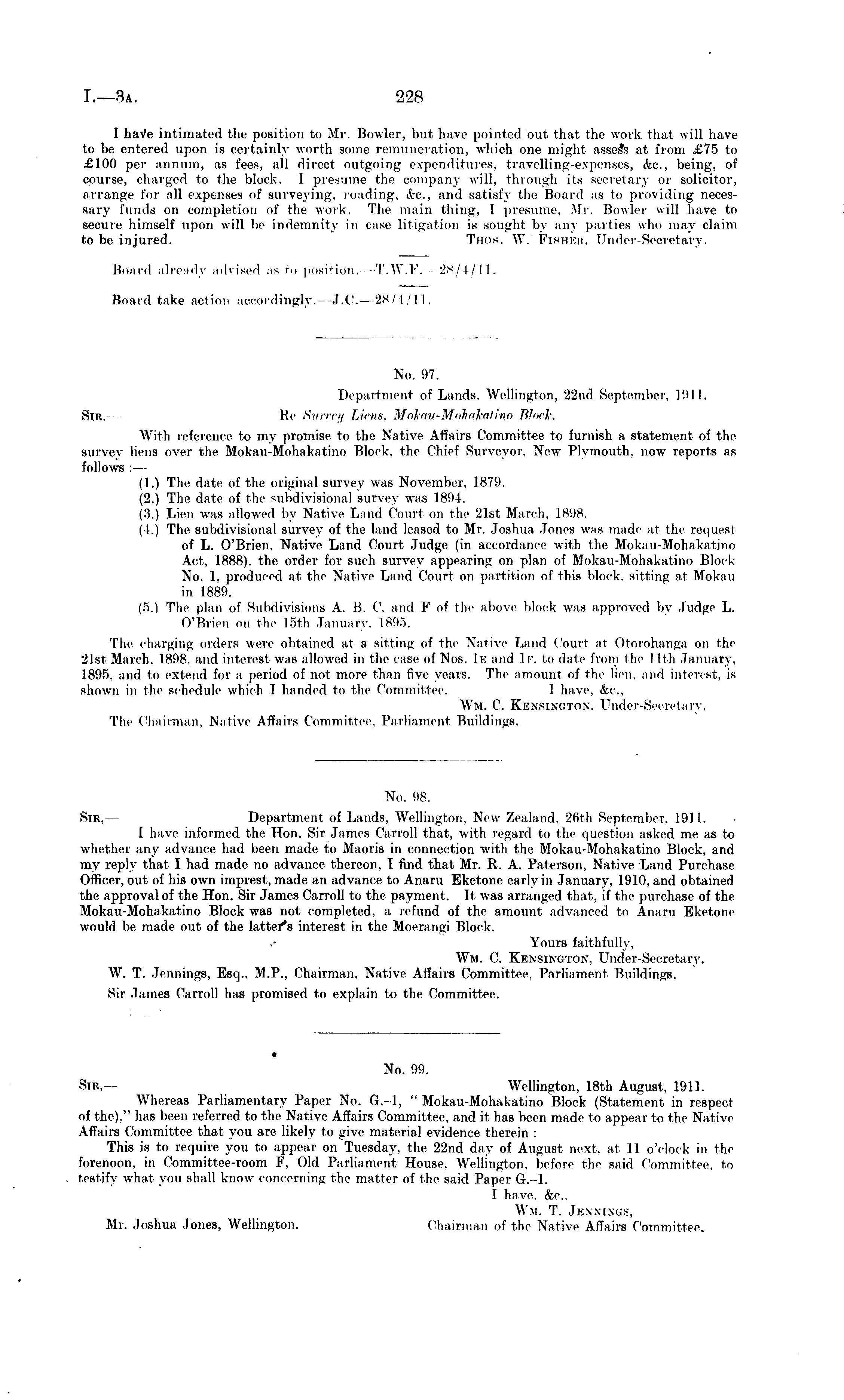 No. 99. Sir.- Wellington, 18th August. 1911. Whereas Parliamentary Paper No. G. I. "Mokau-Mohakatino Block (Statement in respect of the)," has been referred to the Native Affairs Committee, and it has been made to appear to the Native Affairs Committee that you are likely to give material evidence therein : This is to require yon bo appeal- on Tuesday, the 22nd day of August next, at 11 o'clock in the forenoon, in Committee-room F, Old Parliament House. Wellington, before the said Committee, to testify what you shall know concerning the matter of the said Paper C 1. I have. &c. Wμ. T. Jennings, Mr. Joshua Jones, Wellington. Chairman of the Native Affairs Committee.