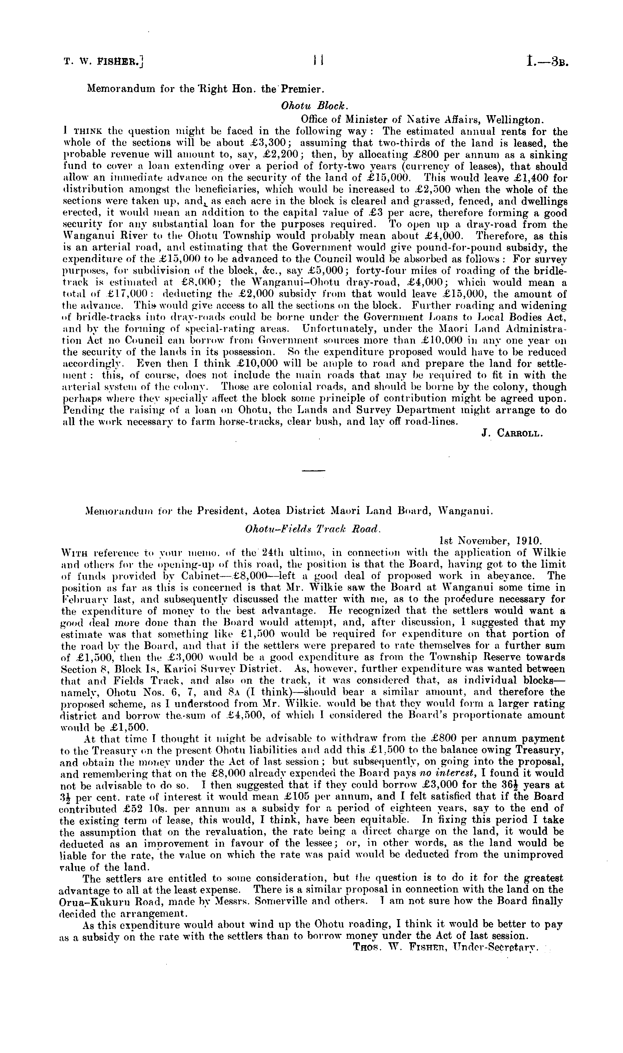 Memorandum for the Right Hon. the Premier. Ohotu Block. Office of Minister of Native Affairs, Wellington. 1 think the question might be faced in the following way : The estimated annual rents for the whole of the sections will be about £3,300; assuming that two-thirds of the land is leased, the probable revenue will amount to, say, £2,200; then, by allocating £800 per annum as a sinking fund to cover a loan extending over a period of forty-two years (currency of leases), that should allow an immediate advance on the security of the land of £15,000. This would leave £1,400 for distribution amongst the beneficiaries, which would be increased to £2,500 when the whole of the sections were taken up. and x as each acre in the block is cleared and grassed, fenced, and dwellings erected, it would mean all addition to the capital value of ,£3 per acre, therefore forming a good security for any substantial loan for the purposes required. To open up a dray-road from the Wanganui River to the Ohotu Township would probably mean about £4,000. Therefore, as this is an arterial road, and estimating that the Government would give pound-for-pound subsidy, the expenditure of the £15,000 to be advanced to the Council would be absorbed as follows : For survey purposes, for subdivision of the block, &c, say .£5,000; forty-four miles of roading of the bridletrack is estimated at £8,000; the Wanganui—Ohotu dray-road, £4.000; which would mean a total of £17,000: deducting the £2,000 subsidy from that would leave £15,000, the amount of the advance. This-would give access to all the sections on the block. Further reading and widening of bridle-tracks into dray-roads could be borne under the Government Loans to Local Bodies Act, ami by the forming of special-rating areas. Unfortunately, under the Maori Land Administration Act no Council can borrow from Government sources more than £10,000 in any one year on the security of the lands in its possession. So the expenditure proposed would have to be reduced accordingly. Even then I think £10,(tOO will be ample to road and prepare the land for settlement : this, of course, docs not include the main roads that may be required to fit in with the arterial svstein of the colony. Those are colonial roads, and should be borne by the colony, though perhaps where they specially affect the block some principle of contribution might be agreed upon. Pending the raising of a loan on Ohotu, the Lands and Survey Department might arrange to do all the work necessary to farm horse-tracks, clear bush, and lay off road-lines. J. Carroll.