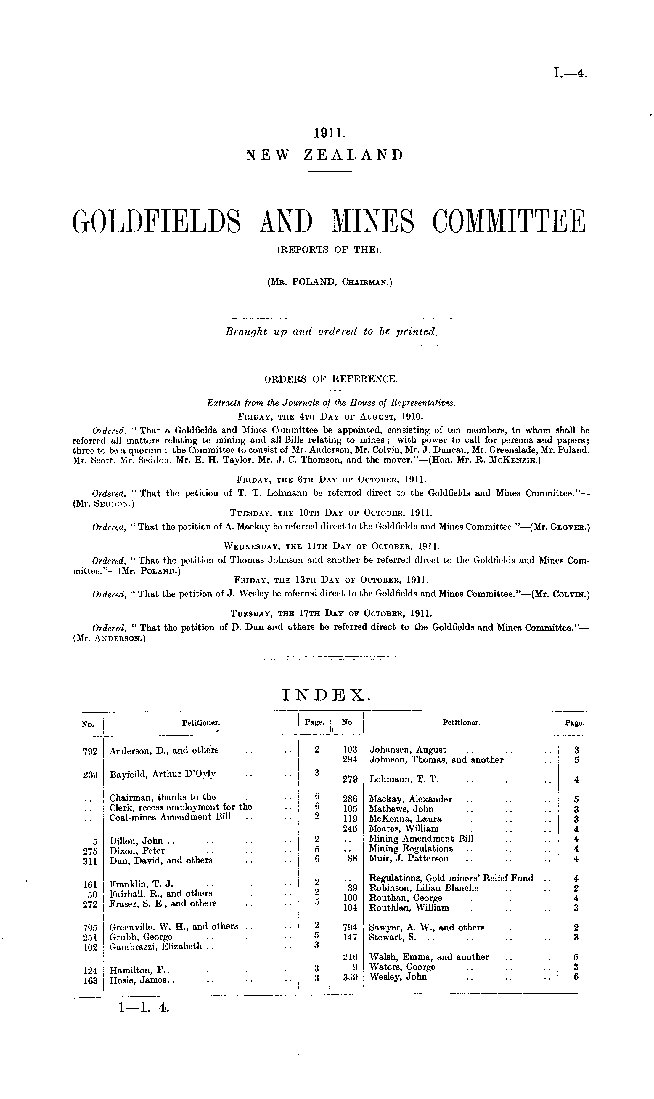 ORDERS OF REFERENCE. Extracts from the Journals of the House of Representatives. Friday, the 4th Day op August, 1910. Ordered, " That a Goldfields and Mines Committee be appointed, consisting of ten members, to whom shall be referred all matters relating to mining and all Bills relating to mines ; with power to call for persons and papers; three to be a quorum : the Committee to consist of Mr. Anderson, Mr. Colvin, Mr. J. Duncan, Mr. Greenslade, Mr. Poland. Mr. Scott, Mr. Seddon, Mr. E. H. Taylor, Mr. J. C. Thomson, and the mover."—(Hon. Mr. R. McKenzie.) I* l< IDA V, THE 6TH DAY OF OCTOBER, 1911. Ordered, " That tho petition of T. T. Lohmann be referred direct to the Goldfields and Mines Committee."— (Mr. Seddon.) Tuesday, the 10th Day of October, 1911. Ordered, " That the petition of A. Mackay bo referred direct to tho Goldfields and Mines Committee."—(Mr. Glover.) Wednesday, the 11th Day of October. 1911. Ordered, " That the petition of Thomas Johnson and another be referred direct to the Goldfields and Mines Com-mittee-."—(Mr. Poland.) Friday, the 13th Day of October, 1911. Ordered, " That the petition of J. Wesley be referred direct to the Goldfields and Mines Committee."—(Mr. Colvin.) Tuesday, the 17th Day of October, 1911. Ordered, " That the petition of D. Dun and others bo referred direct to the Goldfields and Mines Committee."— (Mr. Anderson.)