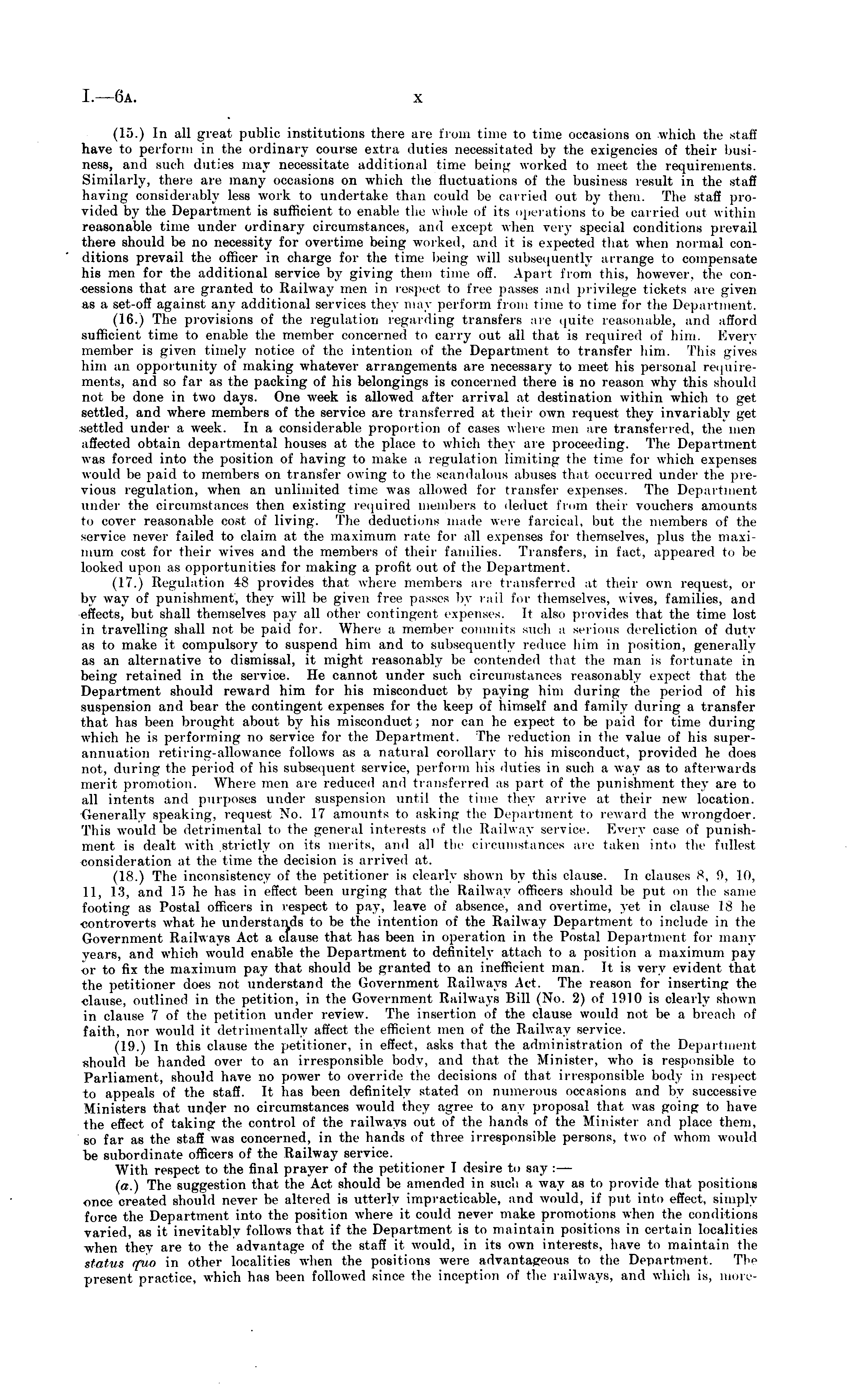 (15.) In all great public institutions there are from time to time occasions on which the staff have to perform in the ordinary course extra duties necessitated by the exigencies of their business, and such duties may necessitate additional time being worked to meet the requirements. Similarly, there are many occasions on which the fluctuations of the business result in the staff having considerably less work to undertake than could be carried out by them. The staff provided by the Department is sufficient to enable the whole of its operations to be oarried out within reasonable time under ordinary circumstances, and except when very special conditions prevail there should be no necessity for overtime being worked, and it is expected that when normal conditions prevail the officer in charge for the time being will subsequently arrange to compensate his men for the additional service by giving them time off. Apart from this, however, the concessions that are granted to Railway men in respect to free passes and privilege tickets are given as a set-off against any additional services they may perform from time to time for the Department. (16.) The provisions of the regulation regarding transfers are quite reasonable, and afford sufficient time to enable the member concerned to carry out all that is required of him. Every member is given timely notice of the intention of the Department to transfer him. This gives him an opportunity of making whatever arrangements are necessary to meet his personal requirements, and so far as the packing of his belongings is concerned there is no reason why this should not be done in two days. One week is allowed after arrival at destination within which to get settled, and where members of the service are transferred at their own request they invariably get settled under a week. In a considerable proportion of cases where men are transferred, the men affected obtain departmental houses at the place to which they are proceeding. The Department was forced into the position of having to make a regulation limiting the time for which expenses would be paid to members on transfer owing to the scandalous abuses that occurred under the previous regulation, when an unlimited time was allowed for transfer expenses. The Department under the circumstances then existing required members to deduct from their vouchers amounts to cover reasonable cost of living. The deductions made were farcical, but the members of the service never failed to claim at the maximum rate for all expenses for themselves, plus the maximum cost for their wives and the members of their families. Transfers, in fact, appeared to be looked upon as opportunities for making a profit out of the Department. (17.) Regulation 48 provides that where members are transferred at their own request, or by way of punishment, they will be given free passes by rail for themselves, wives, families, and effects, but shall themselves pay all other contingent expenses. It also provides that the time lost in travelling shall not be paid for. Where a member commits such a serious dereliction of duty as to make it compulsory to suspend him and to subsequently reduce him in position, generally as an alternative to dismissal, it might reasonably be contended that the man is fortunate in being retained in the service. He cannot under such circumstances reasonably expect that the Department should reward him for his misconduct by paying him during the period of his suspension and bear the contingent expenses for the keep of himself and family during a transfer that has been brought about by his misconduct; nor can he expect to lie paid for time during which he is performing no service for the Department. The reduction in the value of his superannuation retiring-allowance follows as a natural corollary to his misconduct, provided he does not, during the period of his subsequent service, perform his duties in such a way as to afterwards merit promotion. Where men are reduced and transferred as part of the punishment they are to all intents and purposes under suspension until the time they arrive at their new location. Generally speaking, request No. 17 amounts to asking the Department to reward the wrongdoer. This would be detrimental to the general interests of the Railway service. Every ease of punishment is dealt with strictly on its merits, ami all the circumstances are taken into the fullest consideration at the time the decision is arrived at. (18.) The inconsistency of the petitioner is clearly shown by this clause. In clauses S, f), 10, 11, 13, and 15 he has in effect been urging that the Railway officers should be put on the same footing as Postal officers in respect to pay, leave of absence, and overtime, yet in clause 18 he ■controverts what he understands to be the intention of the Railway Department to include in the Government Railways Act a clause that has been in operation in the Postal Department for many years, and which would enable the Department to definitely attach to a position a maximum pay or to fix the maximum pay that should be granted to an inefficient man. It is very evident that the petitioner does not understand the Government Railways Act. The reason for inserting the clause, outlined in the petition, in the Government Railways Rill (No. 2) of 1010 is clearly shown in clause 7of the petition under review. The insertion of the clause would not be a breach of faith, nor would it detrimentally affect the efficient men of the Railway service. (19.) In this clause the petitioner, in effect, asks that the administration of the Department should be handed over to an irresponsible body, and that the Minister, who is responsible to Parliament, should have no power to override the decisions of that irresponsible body in respect to appeals of the staff. It has been definitely stated on numerous occasions and by successive Ministers that under no circumstances would they agree to any proposal that was goin