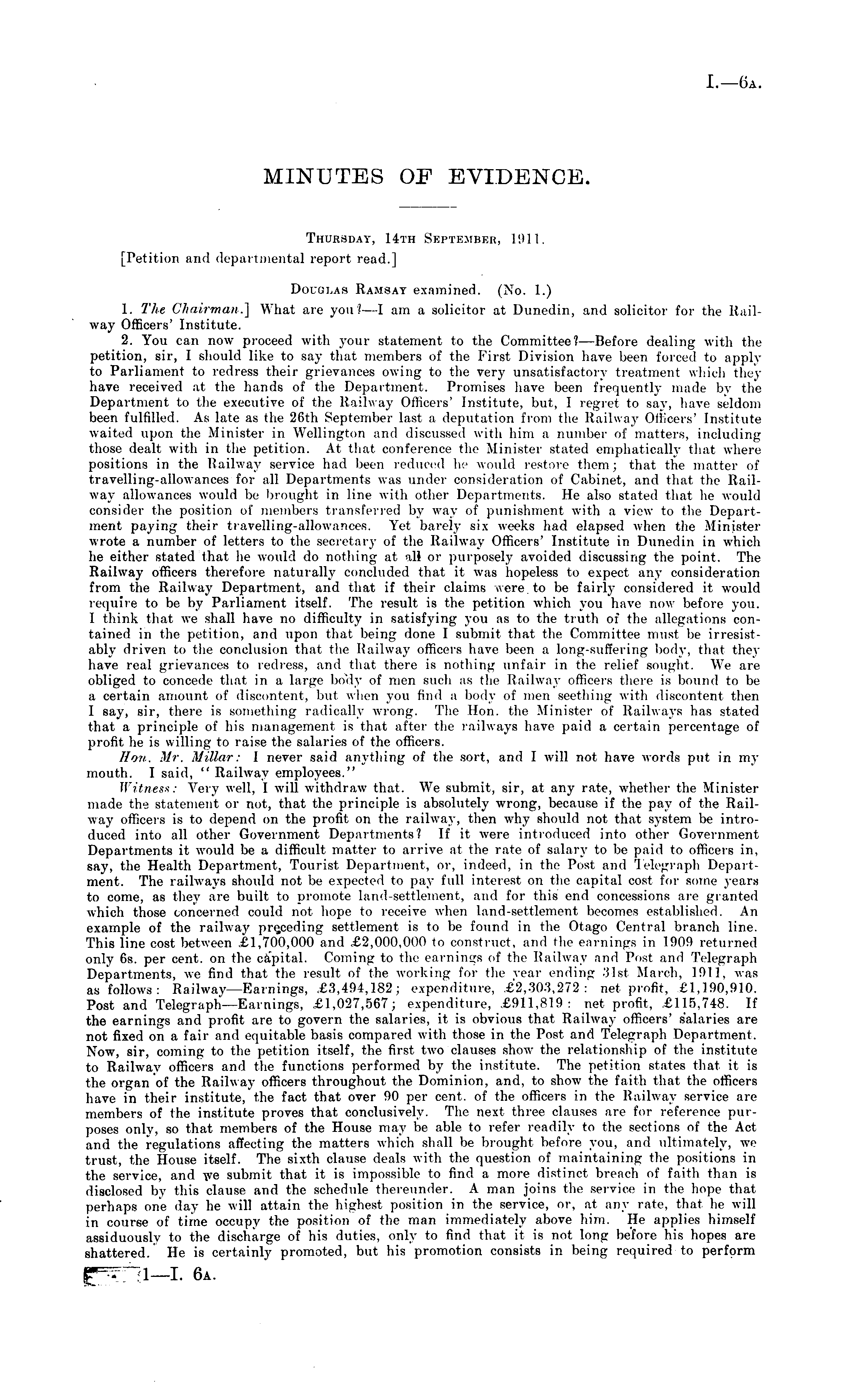 MINUTES OF EVIDENCE. Thursday, 14th September, L9ll. [Petition and departmental report read.] DOUGLAS Ramsay examined. (No. I.) 1. The Chairman.'] What are you? —I am a solicitor at Dunedin, and solicitor for the Railway Officers' Institute. 2. You can now proceed with your statement to the Committee? —Before dealing with the petition, sir, I should like to say that members of the First Division have been forced to apply to Parliament to redress their grievances owing to the very unsatisfactory treatment which they have received at the hands of the Department. Promises have been frequently made by the Department to the executive of the Railway Officers' Institute, but, I regret to say, have seldom been fulfilled. As late as the 26th September last a deputation from the Railway Officers' Institute waited upon the Minister in Wellington and discussed with him a number of matters, including those dealt with in tiie petition. At thai conference the Minister stated emphatically that where positions in the Railway service had been reduced he would restore them; that the matter of travelling-allowances for all Departments was under consideration of Cabinet, ami that the Railway allowances would be brought in line with other Departments, lie also stated that he would consider the position of members transferred by way of punishment with a view to the Department paying their travelling-allowances. Yet barely six weeks had elapsed when the Minister wrote a number of letters to the secretary of the Railway Officers' Institute in Dunedin in which he either stated that he would do nothing at all or purposely avoided discussing the point. The Railway officers therefore naturally concluded that it was hopeless to expect any consideration from the Railway Department, and that if their claims core, to be fairly considered it would require to be by Parliament itself. The result is the petition which you have now before you. I think that we shall have no difficulty in satisfying you as to the truth of the allegations contained in the petition, and upon thai being done I submit that the Committee must he irresisl ably driven to the conclusion that the Railway officers have been a long-suffering body, that they have real grievances to redress, and that there is nothing unfair in the relief sought. We are obliged to concede that in a huge body of men such as the Railway officers there is bound to be a certain amount of discontent, but when you find a body of men seething with discontent then I say, sir, there is something radically wrong. The Hon. the Minister of Railways has stated that a principle of his management is that alter the railways have paid a certain percentage of profit he is willing to raise the salaries of the officers. Hon. Mr. Millar: I never said anything of the sort, and I will not have words put in my mouth. I said, " Railway employees." Witness: Very well, I will withdraw that. We submit, sir, at any rate, whether the Minister made the statement or not, that the principle is absolutely wrong, because if the pay of the Railway officers is to depend on the profit on the railway, then why should not that system be introduced into all other Government Departments? If it were introduced into other Government Departments it would he a difficult matter to arrive at the rate of salary to be paid to officers in, say, the Health Department, Tourist Department, or, indeed, in the Post and Telegraph Department. The railways should not be expected to pay full interest on the capital cost for some years to come, as they tire built to promote land-settlement, and for this end concessions are granted which those concerned could not hope to receive when land-settlement becomes established. An example of the railway preceding settlement is to be found in the Otago Central branch line. This line cost between .£1,700,000 and £2,000,000 to construct, and the earnings in 1900 returned only 6s. per cent, on the capital. Coming to the earnings of tin- Railway and Post ami Telegraph Departments, we find that the result of the working for the year ending .'list March, 1011. was as follows: Railway—Earnings, £3,494,182 ; expenditure, £2,303,272 : net profit, 61,190,910. Post and Telegraph—Earnings, £1,027,567; expenditure, £911,819: net profit. £115.748. If the earnings and profit are to govern the salaries, it is obvious that Railway officers' salaries are not fixed on a fair and equitable basis compared with those in the Post and Telegraph Department. Now, sir, coming to the petition itself, the first two clauses show the relationship of the institute to Railway officers and the functions performed by the institute. The petition states that it is the organ of the Railway officers throughout the Dominion, and, to show the faith that the officers have in their institute, the fact that over 90 per cent, of the officers in the Railway service are members of the institute proves that conclusively. The next three clauses are for reference purposes only, so that members of the House may be able to refer readily to the sections of the Act and the regulations affecting the matters which shall he brought before you, and ultimately, we trust, the House itself. The sixth clause deals with the question of maintaining the positions in the service, and we submit that it is impossible to find a more distinct breach of faith than is disclosed by this clause and the schedule thereunder. A man joins the service in the hope that perhaps one day he will attain the highest position in the service, or, at any rate, that he will in course of time occupy the position of the man immediately above him. He applies himself assiduously to the discharge of his duties, only to find that it is not long before his hopes are shattered. He is certainly promoted, but his promotion consists in being required to perform