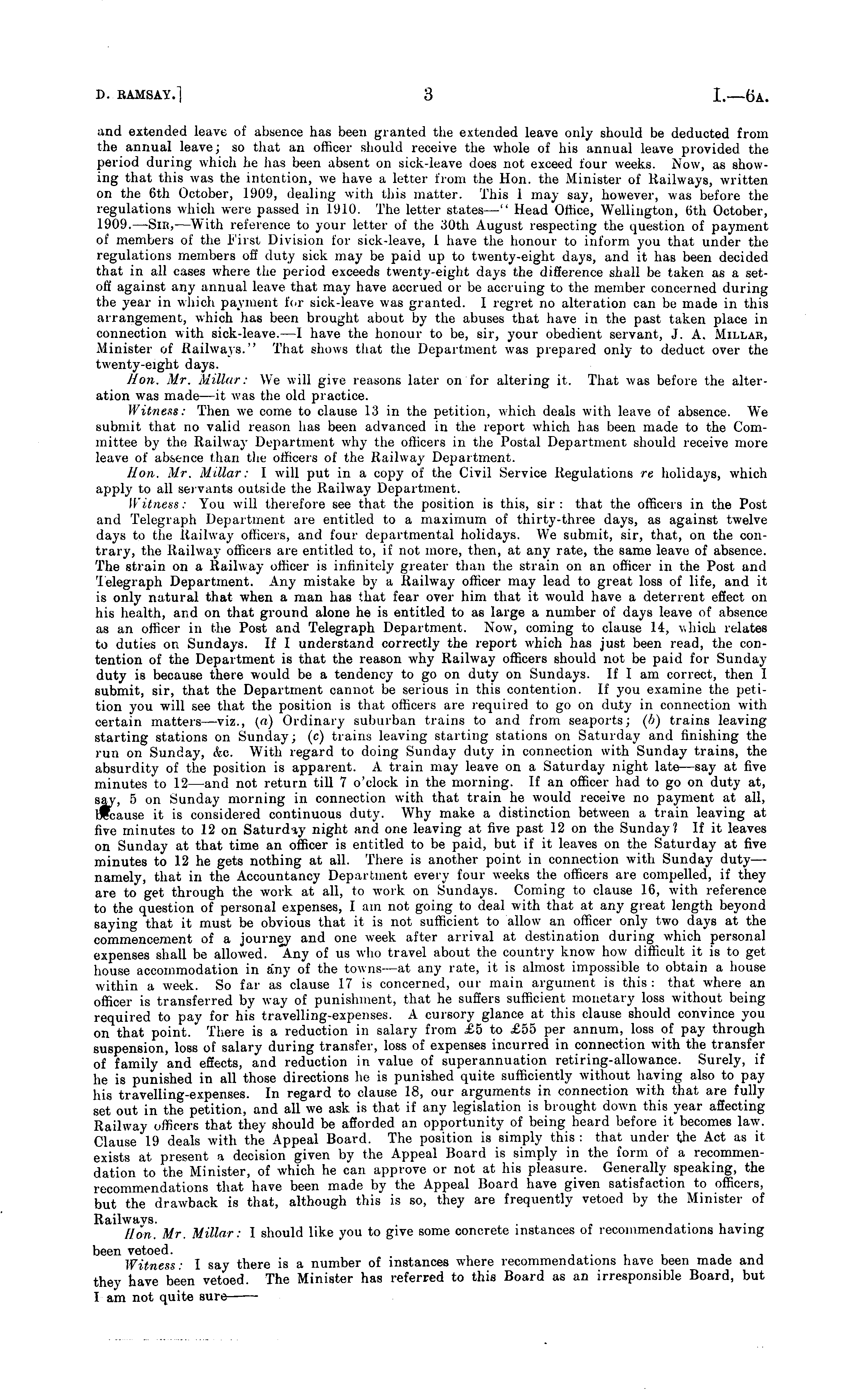 and extended leave of absence has been granted the extended leave only should be deducted from the annual leave; so that an officer should receive the whole of his annual leave provided the period during which he has been absent on sick-leave does not exceed four weeks. Now, as showing that this was the intention, we have a letter from the Hon. the Minister of Railways, written on the 6th October, 1909, dealing with this matter. This 1 may say, however, was before the regulations which were passed in 1910. The letter states—" Head Office, Wellington, 6th October, 1909.—Sir, —With reference to your letter of the 30th August respecting the question of payment of members of the hirst Division for sick-leave, 1 have the honour to inform you that under the regulations members off duty sick may be paid up to twenty-eight days, and it has been decided that in all cases where the period exceeds twenty-eight days the difference shall be taken as a setoff against any annual leave that may have accrued or be accruing to the member concerned during the year in which payment for sick-leave was granted. I regret no alteration can be made in this arrangement, which has been brought about by the abuses that have in the past taken place in connection with sick-leave. —I have the honour to be, sir, your obedient servant, J. A. Millar, Minister of Railways." That shows that the Department was prepared only to deduct over the twenty-eight days. lion. Mr. Millar: We will give reasons later on for altering it. That was before the alteration was made —it was the old practice. Witness; Then we come to clause 13 in the petition, which deals with leave of absence. We submit that no valid reason has been advanced in the report which has been made to the Committee by the Railway Department why the officers in the Postal Department should receive more leave of absence than the officers of the Railway Department. lion. Mr. Millar: I will put in a copy of the Civil Service Regulations re holidays, which apply to all servants outside the Railway Department. Witness: You will therefore see that the position is this, sir: that the officers in the Post and Telegraph Department are entitled to a maximum of thirty-three days, as against twelve days to the Railway officers, and four departmental holidays. We submit, sir, that, on the contrary, the Railway officers are entitled to, if not more, then, at any rate, the same leave of absence. The strain on a Railway officer is infinitely greater than the strain on an officer in the Post and Telegraph Department. Any mistake by a Railway officer may lead to great loss of life, and it is only natural that when a man has that fear over him that it would have a deterrent effect on his health, and on that ground alone he is entitled to as large a number of days leave of absence as an officer in the Post and Telegraph Department. Now, coming to clause 14, which relates to duties on Sundays. If I understand correctly the report which has just been read, the contention of the Department is that the reason why Railway officers should not be paid for Sunday duty is because there would be a tendency to go on duty on Sundays. If I am correct, then I submit, sir, that the Department cannot be serious in this contention. If you examine the petition you will see that the position is that officers are required to go on duty in connection with certain matters —viz., (a) Ordinary suburban trains to and from seaports; (b) trains leaving starting stations on Sunday; (c) trains leaving starting stations on Saturday and finishing the run on Sunday, &c. With regard to doing Sunday duty in connection with Sunday trains, the absurdity of the position is apparent. A train may leave on a Saturday night late—say at five minutes to 12 —and not return till 7 o'clock in the morning. If an officer had to go on duty at, say, 5 on Sunday morning in connection with that train he would receive no payment at all, hjlcause it is considered continuous duty. Why make a distinction between a train leaving at five minutes to 12 on Saturday night and one leaving at five past 12 on the Sunday? If it leaves on Sunday at that time an officer is entitled to be paid, but if it leaves on the Saturday at five minutes to 12 he gets nothing at all. There is another point in connection with Sunday duty— namely, that in the Accountancy Department every four weeks the officers are compelled, if they are to get through the work at all, to work on Sundays. Coming to clause 16, with reference to the question of personal expenses, I am not going to deal with that at any great length beyond saying that it must be obvious that it is not sufficient to allow an officer only two days at the commencement of a journey and one week after arrival at destination during which personal expenses shall be allowed. Any of us who travel about the country know how difficult it is to get house accommodation in any of the towns —at any rate, it is almost impossible to obtain a house within a week. So far as clause 17 is concerned, our main argument is this: that where an officer is transferred by way of punishment, that he suffers sufficient monetary loss without being required to pay for his travelling-expenses. A cursory glance at this clause should convince you on that point. There is a reduction in salary from £5 to £55 per annum, loss of pay through suspension, loss of salary during transfer, loss of expenses incurred in connection with the transfer of family and effects, and reduction in value of superannuation retiring-allowance. Surely, if he is punished in all those directions he is punished quite sufficiently without having also to pay his travelling-expenses. In regard to clause 18, our arguments in connection with that are fully set out in the petition, and all we ask is that if any legislation is brought down this year affecting Railway officers that they should be afforded an opportunity of being heard before it becomes