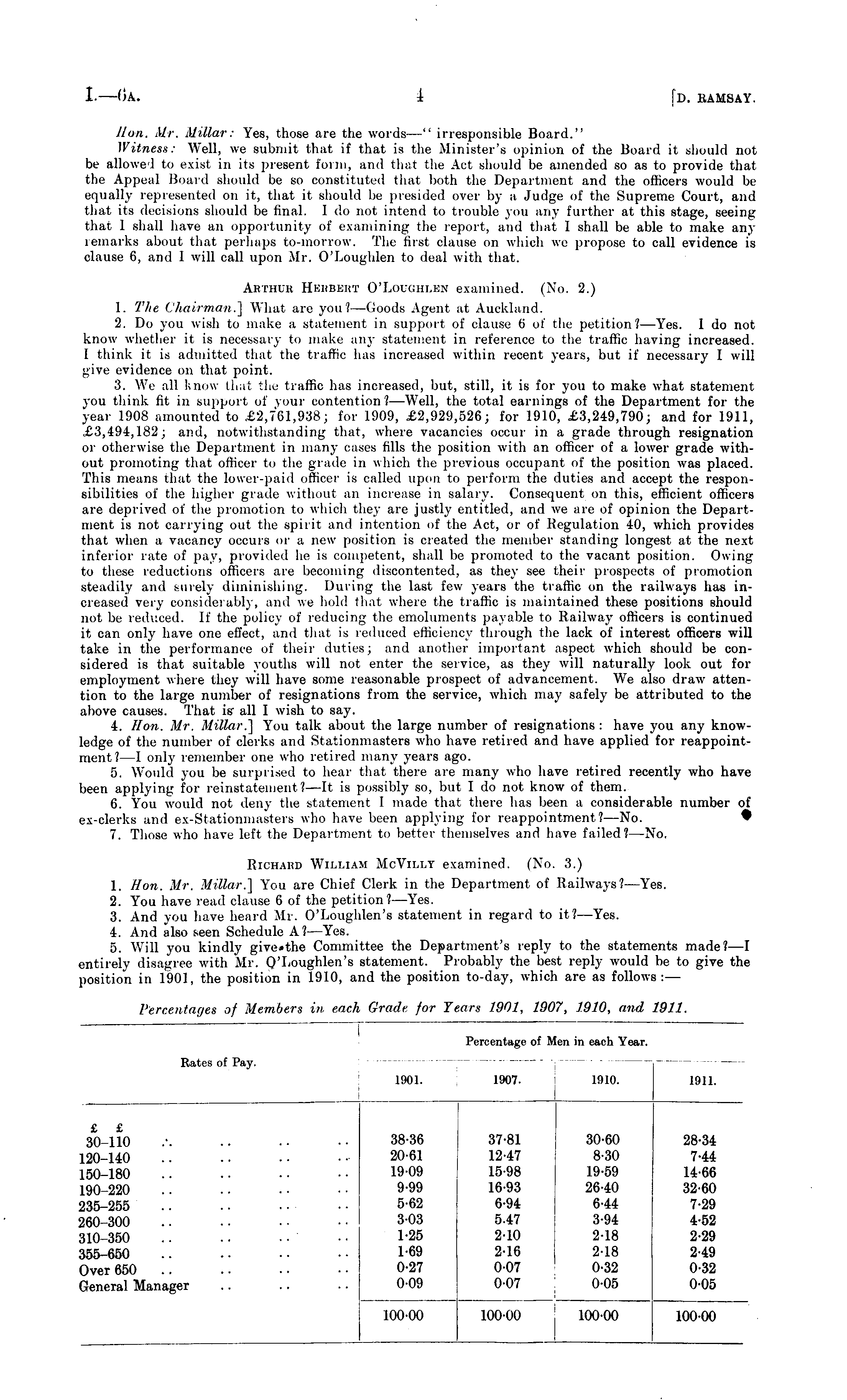 lion. Mr. Millar: Yes, those are the words—" irresponsible Board." Witness: Well, we submit that if that is the Minister's opinion of the Board it should not he allowed to exist iii its present form, and that the Act should be amended so as to provide that the Appeal Hoard should be so constituted that both the Department and the officers would be equally represented on it, that it should be presided over by a Judge of the Supreme Court, and that its decisions should be final. I do not intend to trouble you any further at this stage, seeing that 1 shall have an opportunity of examining the report, and that 1 shall be able to make any remarks about that perhaps to-morrow. The first clause on which we propose to call evidence is clause 6, and 1 will call upon Mr. O'Loughlen to deal with that. Arthur Herbert O'Loughlem examined. (No. 2.) 1. The Chairman.] What are you? —Goods Agent at Auckland. 2. Do you wish to make a statement in support of clause 6 of the petition?— Yes. I do not know whether it is necessary to make any statement in reference to the traffic having increased. 1 think it is admitted that the traffic has increased within recent years, but if necessary I will give evidence on that point. 3. We all know that the traffic has increased, but, still, it is for you to make what statement you think fit in support of your contention?— Well, the total earnings of the Department for the year 1908 amounted to £2,761,938; for 1909, £2,929,526; for 1910, £3,249,790; and for 1911, £3,494,182; and, notwithstanding that, where vacancies occur in a grade through resignation or otherwise the Department in many cases fills the position with an officer of a lower grade without promoting that officer to the grade in which the previous occupant of the position was placed. This means that the lower-paid officer is called upon to perform the duties and accept the responsibilities of the higher grade without tin increa.se in salary. Consequent on this, efficient officers are deprived of the promotion to which they tire justly entitled, and we are of opinion the Department is not carrying out tin- spirit and intention of the Act, or of Regulation 40, which provides that when a vacancy occurs or a new position is created the member standing longest at the next inferior rate of pay, provided he is competent, shall be promoted to the vacant position. Owing to these reductions officers are becoming discontented, as they see their prospects id' promotion steadily and surely diminishing. During the last few years the traffic on the railways has increased wiv considerably, and we hold thai where the traffic is maintained these positions should not be reduced. If the policy of reducing the emoluments payable to Railway officers is continued it can only have one effect, and that is reduced efficiency through the lack of interest officers will take in the performance of their duties; and another important aspect which should be considered is that suitable youths will not enter the service, as they will naturally look out for employment where they will have some reasonable prospect of advancement. We also draw attention to the large number of resignations from the service, which may safely be attributed to the above causes. That is' all I wish to say. 4. Hon. Mr. Mdlnr. | Yon talk about the large number of resignations: have you any knowledge of the number of clerks and Stationmasters who have retired and have applied for reappointment?—l only remember one who retired many years ago. 5. Would you be surprised to hear that there are many who have retired recently who have been applying for reinstatement (— It is possibly so, but I do not know of them. 6. You would not deny the statement I made that there has been a considerable number of ex-clerks and ex-Stationmasters who have been applying for reappointment?—No. • 7. Those who have left the Department to better themselves and have failed?— No. Richard William McVilly examined. (No. 3.) 1. lion. Mr. Millar.] You are Chief Clerk in the Department of Railways? —Yes. 2. You have read clause 6 of the petition?— Yes. 3. And you have heard Mr. O'Loughlen's statement in regard to it?— Yes. 4. And also seen Schedule A? —Yes. 5. Will you kindly give-the Committee the Department's reply to the statements made? —I entirely disagree with Mr. Q'Loughlen's statement. Probably the best reply would be to give the position in 1901, the position in 1910, and the position to-day, which are as follows: —