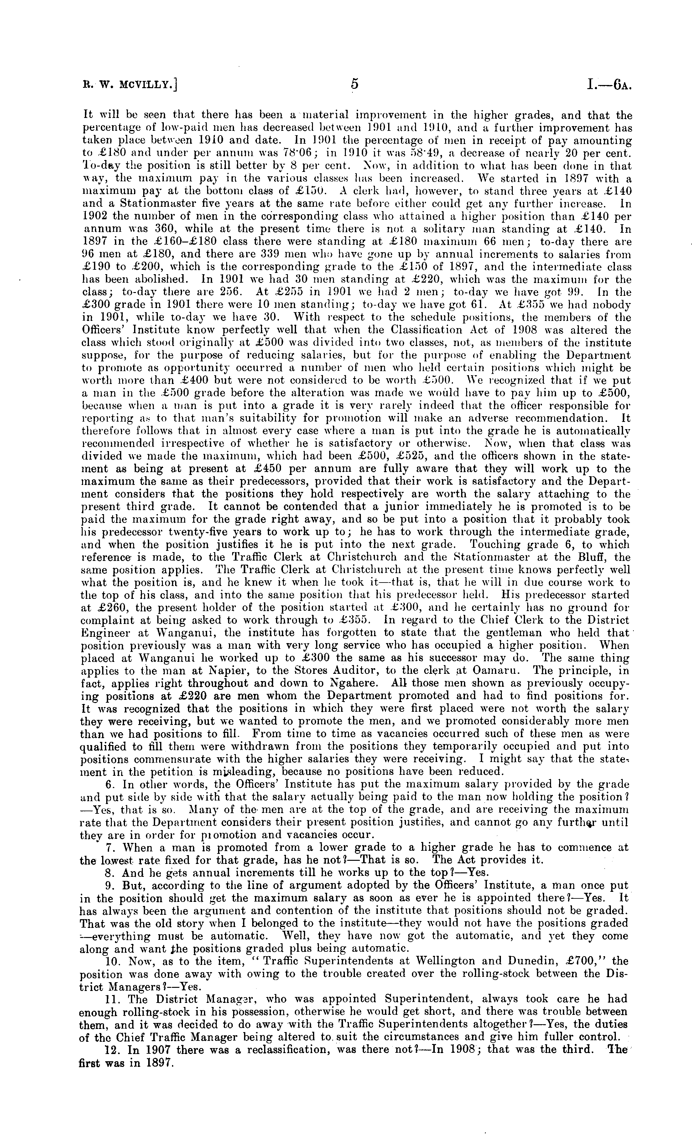 It will be seen that there has been a material improvement in the higher grades, and that the percentage of low-paid nun has decreased between 1901 and 1910, and a further improvement has taken place between 1910 and date. In 1901 the percentage of men in receipt of pay amounting to £180 and under per annum was 78'06j in 1910 it was 58"49, a decrease of nearly 20 per cent. To-day the position is still better by 8 per cent. Now, in addition to what lias been done in that way, the maximum pay in the various classes has been increased. We started in 1897 with a maximum pay at the bottom class of £130. A clerk had, however, to stand three years at £140 and a Stationmaster five years at the same rate before either could get any further increase. In 1902 the number of men in the corresponding class who attained a higher position than £140 per annum was 360, while at the present time there is not a solitary man standing at £140. In L 897 in the £160-£lBO class there were standing at £180 maximum 66 men; to-day there are 96 men at £180, and there are 339 men who have gone up by annual increments to salaries from £190 to £200, which is the corresponding grade to the £150 of 1897, and the intermediate class has been abolished. In 1901 we had 30 men standing at £220, which was the maximum for the classj to-day there are 256. At £255 in 1901 we had 2 men; to-day we have got 99. In the £300 grade in 1901 there were 10 men standing; to-day we have got 61. At £355 we had nobody in 1901, while to-day we hare 30. With respect to the schedule positions, the members of the Officers' Institute know perfectly well that when the Classification Act of 1908 was altered the olass which stood originally at £500 was divided into two classes, not, as members of the institute suppose, for the purpose of reducing salaries, but for the purpose of enabling the Department to promote as opportunity occurred a number of men who held certain positions which might be worth more than £400 but were not considered to be worth £500. We recognized that if we put a man in the £500 grade before the alteration was made we would have to pay him up to £500, because when a man is put into a grade it is very rarely indeed that the officer responsible for reporting as to that man's suitability for promotion will make an adverse recommendation. It therefore follows that in almost every case where ;i man is put into the grade he is automatically recommended irrespective of whether he is satisfactory or otherwise. Now, when that class was divided we made the maximum, which had been £500, £525, and the officers shown in the statement as being at present at £450 per annum are fully aware that they will work up to the maximum the s;ime as their predecessors, provided that their work is satisfactory and the Department considers that the positions they hold respectively are worth the salary attaching to the present third grade. It cannot be contended that a junior immediately he is promoted is to be paid the maximum for the grade right away, and so be put into a position that it probably took iiis predecessor twenty-five years to work up to; he has to work through the intermediate grade, and when the position justifies it he is put into the next grade. Touching grade 6, to which reference- is made, to the Traffic Clerk at Christchurch and the Stationmaster at the Bluff, the same position applies. The Traffic Clerk at Christchurch at the present time knows perfectly well what the position is, and he knew it when he took it —that is, that he will in due course work to the top of his class, and into the same position that his predecessor held. His predecessor started at £260, the present holder of the position started at £300, and he certainly has no ground for complaint at being asked to work through to £355. In regard to the Chief Clerk to the District Engineer at Wanganui, the institute has forgotten to state that the gentleman who held that position previously was a man with very long service who has occupied a higher position. When placed at Wanganui he worked up to £300 the same as his successor may do. The same thing applies to the man at Napier, to the Stores Auditor, to the clerk at Oamaru. The principle, in fact, applies right throughout and down to Ngahere. All those men shown as previously occupying positions at £220 are men whom the Department promoted and had to find positions for. It was recognized that the positions in which they were first placed were nor worth the salary they were receiving, but we wanted to promote the men, and we promoted considerably more men than we had positions to fill. From time to time as vacancies occurred such of these men as were qualified to fill them were withdrawn from the positions they temporarily occupied and put into positions commensurate with the higher salaries they were receiving. I might say that the statement in the petition is misleading, because no positions have been reduced. 6. In other words, the Officers' Institute has put the maximum salary provided by the grade and put side by side with that the salary actually being paid to the man now holding the position? —Yes, that is so. Many of the- men are at the top of the grade, and are receiving the maximum rate that the Department considers their present position justifies, and cannot go any further until they are in order for piomotion and vacancies occur. 7. When a man is promoted from a lower grade to a higher grade he has to commence at the lowest rate fixed for that grade, has he not? —That is so. The Act provides it. 8. And he gets annual increments till he works up to the top?— Yes. 9. But, according to the line of argument adopted by the Officers' Institute, a man once put in the position should get the maximum salary as soon as ever he is appointed there? —Yes. It has always been the argument and contention of the institute that positions should not be graded. That was the old gtory when I 