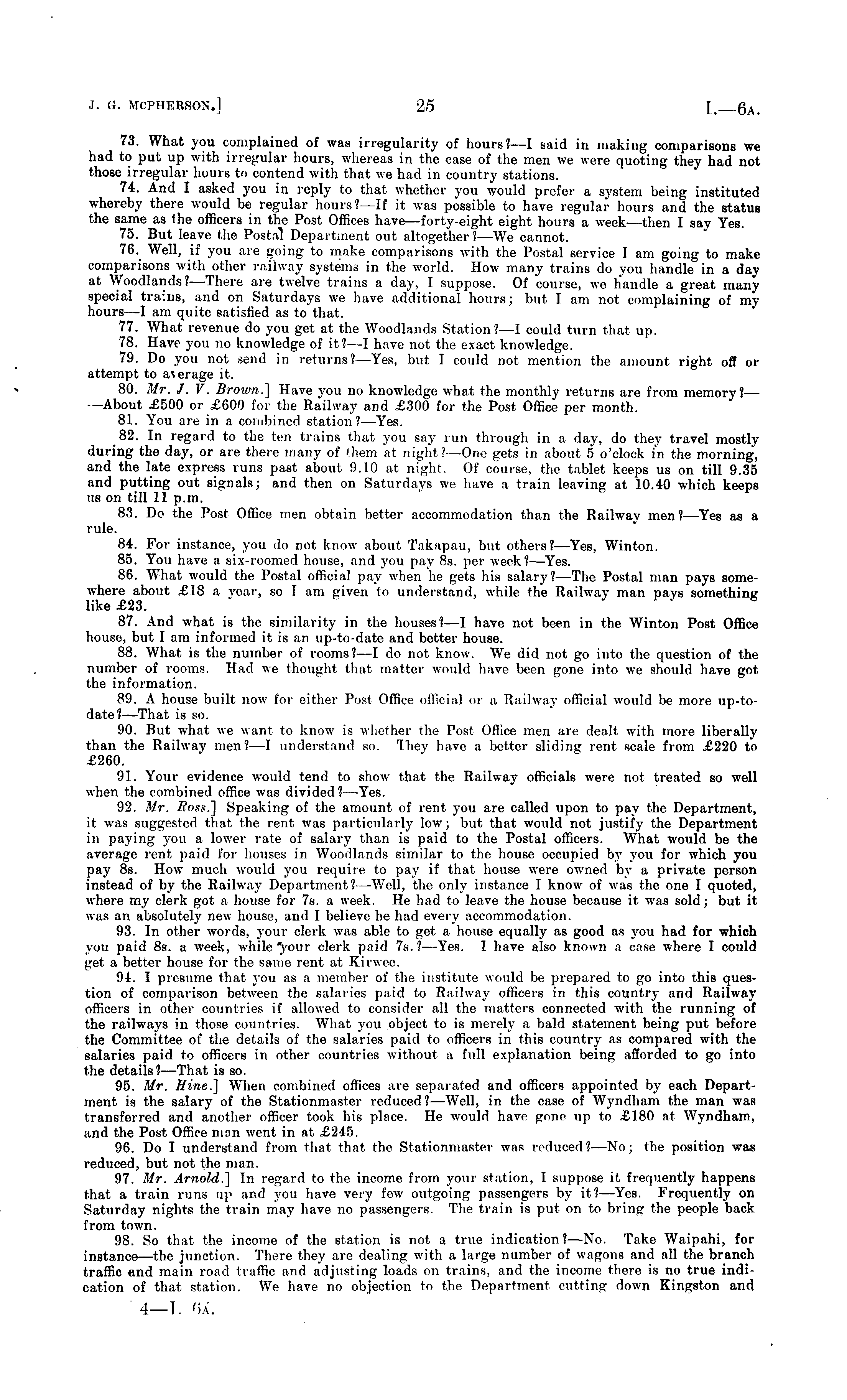 73. What you complained of was irregularity of hours?—l said in making comparisons we had to put up with irregular hours, whereas in the case of the men we were quoting they had not those irregular hours to contend with that we had in country stations. 74. And I asked you in reply to that whether you would prefer a system being instituted whereby there would be regular hours?—lf it was possible to have regular hours and the status the same as the officers in the Post Offices hay eight hours a week —then I say Yes. 75. But leave the Postal Department out altogether?—We cannot. 76. Well, if you are going to make comparisons with the Postal service I am going to make comparisons with other railway systems in the world. How many trains do you handle in a day at Woodlands?— There are twelve trains a day, I suppose. Of course, we handle a great manyspecial trains, and on Saturdays we have additional hours; but I am not complaining of mv hours —I am quite satisfied as to that. 77. What revenue do you get at the Woodlands Station? —I could turn that up. 78. Have you no knowledge of it? —I have not the exact knowledge. 79. Do you not send in returns?— Yes, but I could not mention the amount right off or attempt to average it. 80. Mr. J. V. Brown.] Have you no knowledge what the monthly returns are from memory?— —About £500 or £600 for the Railway and £300 for the Post Office per month. 81. You are in a combined station? —Yes. 82. In regard to the ten trains that you say run through in a day, do they travel mostly during the day, or are there many of them at night?— One gets in about 5 o'clock in the morning, and the late express runs past about 9.10 at night. Of course, the tablet keeps us on till 9.35 and putting out signals; and then on Saturdays we have a train leaving at 10.40 which keeps us on till 11 p.m. 83. Do the Post Office men obtain better accommodation than the Railway men?— Yes as a rule. 84. For instance, you do not know about Takapau, but others?— Yes, Winton. 85. You have a six-roomed house, and you pay Bs. per week? —Yes. 86. What would the Postal official pay when he gets his salary? —The Postal man pays somewhere about £18 a year, so I am given to understand, while the Railway man pays something like £23. 87. And what is the similarity in the houses?—l have not been in the Winton Post Office house, but I am informed it is an up-to-date and better house. 88. What is the number of rooms?—l do not know. We did not go into the question of the number of rooms. Had we thought that matter would have been gone into we should have got the information. 89. A house built now for either Post Office official or a Railway official would be more up-to-date? —That is so. 90. But what we want to know is whether the Post Office men are dealt with more liberally than the Railway men?—l understand so. Ihey have a better sliding rent scale from £220 to £260. 91. Your evidence would tend to show that the Railway officials were not treated so well when the combined office was divided? —Yes. 92. Mr. Ross.] Speaking of the amount of rent you are called upon to pay the Department, it was suggested that the rent was particularly low; but that would not justify the Department in paying you a lower rate of salary than is paid to the Postal officers. What would be the average rent paid for houses in Woodlands similar to the house occupied by you for which you pay Bs. How much would you require to pay if that house were owned by a private person instead of by the Railway Department?— Well, the only instance I know of was the one I quoted, where my clerk got a house for 7s. a week. He had to leave the house because it was sold; but it was an absolutely new house, and I believe he had every accommodation. 93. In other words, your clerk was able to get a house equally as good as you had for which you paid Bs. a week, while "Your clerk paid 7s.?—Yes. I have also known a case where I could get a better house for the same rent at Kirwee. 94. I presume that you as a member of the institute would be prepared to go into this question of comparison between the salaries paid to Railway officers in this country and Railway officers in other countries if allowed to consider all the matters connected with the running of the railways in those countries. What you object to is merely a bald statement being put before the Committee of the details of the salaries paid to officers in this country as compared with the salaries paid to officers in other countries without a full explanation being afforded to go into the details? —That is so. 95. Mr. Hine.] When combined offices are separated and officers appointed by each Department is the salary of the Stationmaster reduced ?—Well, in the case of Wyndham the man was transferred and another officer took his place. He would have gone up to £180 at Wyndham, and the Post Office man went in at £245. 96. Do I understand from that that the Stationmaster was reduced? —No; the position was reduced, but not the man. 97. Mr. Arnold.] In regard to the income from your station, I suppose it frequently happens that a train runs up and you have very few outgoing passengers by it? —Yes. Frequently on Saturday nights the train may have no passengers. The train is put on to bring the people back from town. 98. So that the income of the station is not a true indication? —No. Take Waipahi, for instance—the junction. There they are dealing with a large number of wagons and all the branch traffic and main road traffic and adjusting loads on trains, .and the income there is no true indication of that station. We have no objection to the Department cutting down Kingston and