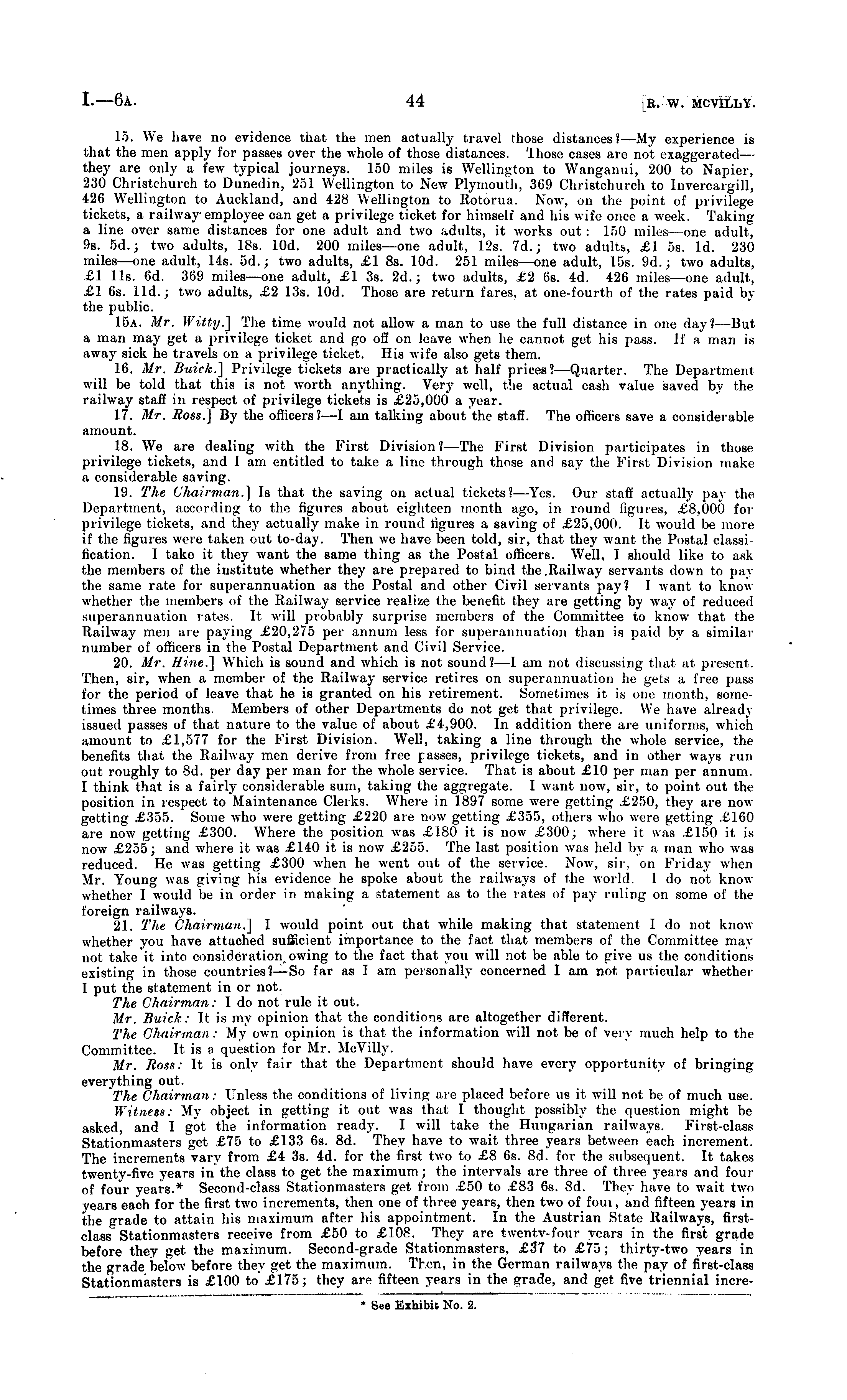 15. We have no evidence that the men actually travel those distances? —My experience is that the men apply for passes over the whole of those distances. 'Ihose cases are not exaggerated— they are only a few typical journeys. 150 miles is Wellington to Wanganui, 200 to Napier, 230 Christchurch to Dunedin, 251 Wellington to New Plymouth, 369 Christchurch to Invercargill, 426 Wellington to Auckland, and 428 Wellington to Rotorua. Now, on the point of privilege tickets, a railway employee can get a privilege ticket for himself and his wife once a week. Taking a line over same distances for one adult and two adults, it works out: 150 miles —one adult, 9s. 5d.; two adults, 18s. lOd. 200 miles—one adult, 12s. 7d.; two adults, £1 ss. Id. 230 miles—one adult, 14s. 5d.; two adults, £1 Bs. lOd. 251 miles —one adult, 15s. 9d.; two adults, £1 lis. 6d. 369 miles—one adult, £1 3s. 2d.; two adults, £2 6s. 4d. 426 miles—one adult, £1 6s. lid.; two adults, £2 13s. lOd. Those are return fares, at one-fourth of the rates paid by the public. 15a. Mr. Witty.] The time would not allow a man to use the full distance in one day? —But a man may get a privilege ticket and go off on leave when he cannot get his pass. If a man is away sick he travels on a privilege ticket. His wife also gets them. 16. Mr. Buick.] Privilege tickets are practically at half prices?— Quarter. The Department will be told that this is not worth anything. Very well, the actual cash value saved by the railway staff in respect of privilege tickets is £25,000 a year. 17. Mr. Ross.] By the officers? —I am talking about the staff. The officers save a considerable amount. 18. We are dealing with the First Division? —The First Division participates in those privilege tickets, and I am entitled to take a line through those and say the First Division make a considerable saving. 19. The Chairman.] Is that the saving on actual tickets? —Yes. Our staff actually pay the Department, according to the figures about eighteen month ago, in round figures, £8,000 for privilege tickets, and they actually make in round figures a saving of £25,000. It would be more if the figures were taken out to-day. Then we have been told, sir, that they want the Postal classification. I take it they want the same thing as the Postal officers. Well, I should like to ask the members of the institute whether they are prepared to bind the .Railway servants down to pay the same rate for superannuation as the Postal and other Civil servants pay? I want to know whether the members of the Railway service realize the benefit they are getting by way of reduced superannuation rates. It will probably surprise members of the Committee to know that the Railway men are paying £20,275 per annum less for superannuation than is paid by a similar number of officers in the Postal Department and Civil Service. 20. Mr. Hine.] Which is sound and which is not sound? —I am not discussing that at present. Then, sir, when a member of the Railway service retires on superannuation he gets a free pass for the period of leave that he is granted on his retirement. Sometimes it is one month, sometimes three months. Members of other Departments do not get that privilege. We have already issued passes of that nature to the value of about £4,900. In addition there are uniforms, which amount to £1,577 for the First Division. Well, taking a line through the whole service, the benefits that the Railway men derive from free passes, privilege tickets, and in other ways run out roughly to Sd. per day per man for the whole service. That is about £10 per man per annum. I think that is a fairly considerable sum, taking the aggregate. I want now, sir, to point out the position in respect to Maintenance Clerks. Where in 1897 some were getting £250, they are now getting £355. Some who were getting £220 are now getting £355, others who were getting £160 are now getting £300. Where the position was £180 it is now £300; where it was £150 it is now £255; and where it was £140 it is now £255. The last position was held by a man who was reduced. He was getting £300 when he went out of the service. Now, sir, on Friday when Mr. Young was giving his evidence he spoke about the railways of the world. 1 do not know whether I would be in order in making a statement as to the rates of pay ruling on some of the foreign railways. 21. The Chairman.] I would point out that while making that statement I do not know whether you have attached sufficient importance to the fact that members of the Committee may not take it into consideration owing to the fact that you will not be able to give us the conditions existing in those countries? —So far as I am personally concerned I am not particular whether I put the statement in or not. The Chairman: Ido not rule it out. Mr. Buick: It is my opinion that the conditions are altogether different. The Chairman: My own opinion is that the information will not be of very much help to the Committee. It is a question for Mr. McVilly. Mr. Ross: It is only fair that the Department should have every opportunity of bringing everything out. The Chairman: Unless the conditions of living are placed before us it will not be of much use. Witness: My object in getting it out was that I thought possibly the question might be asked, and I got the information ready. I will take the Hungarian railways. First-class Stationmasters get £75 to £133 6s. Bd. They have to wait three years between each increment. The increments vary from £4 3s. 4d. for the first two to £8 6s. Bd. for the subsequent. It takes twenty-five years in the class to get the maximum; the intervals are three of three years and four of four years.* Second-class Stationmasters get from £50 to £83 6s. Bd. They have to wait two years each for the first two increments, then one of three years, then two of foui, and fifteen years in the grade to attain his maximum after his appointment. In the Aus