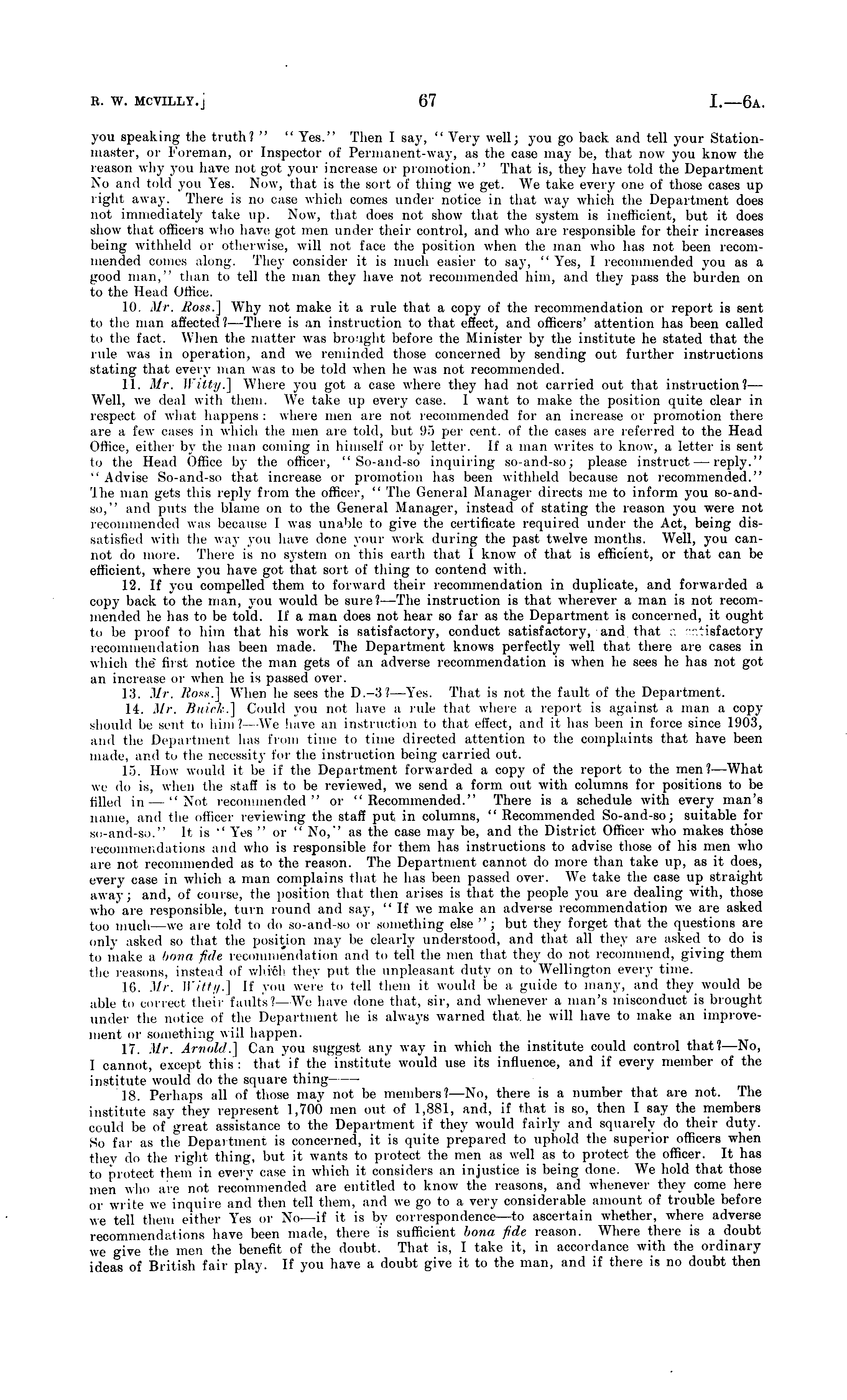 you speaking the truth? " " Yes." Then I say, " Very well; you go back and tell your Stationmaster, or Foreman, or Inspector of Permanent-way, as the case may be, that now you know the reason why you have not got your increase or promotion." That is, they have told the Department No and told you Yes. Now, that is the sort of thing we get. We take every one of those cases up right away. There is no case which comes under notice in that way which the Department does not immediately take up. Now, that does not show that the system is inefficient, but it does show thai officers who have got men under their control, and who are responsible for their increases being withheld or otherwise, will not face the position when the man who has not been recommended comes along. They consider it is much easier to say, "Yes, I recommended you as a good man," than to tell the man they have not recommended him, and they pass the burden on to the Head Office. 10. Mr. Ross.] Why not make it a rule that a copy of the recommendation or report is sent to the man affected?— There is an instruction to that effect, and officers' attention has been called to the fact. When the matter was brought before the Minister by the institute he stated that the rule was in operation, and we reminded those concerned by sending out further instructions stating that every man was to be told when he was not recommended. 11. .1/;-. Witty.] Where you got a case where they had not carried out that instruction? — Well, we deal with them. We take up every case. 1 want to make the position quite clear in respect of what happens : where men are not recommended for an increase or promotion there are a few eases in which the men are told, but 95 per cent, of the cases are referred to the Head Office, either by the man coming in himself or by letter. If a man writes to know, a letter is sent to the Head Office by the officer, "So-and-so inquiring so-and-so; please instruct — reply." " Advise So-and-so that increase or promotion has been withheld because not recommended." 'the man gets this reply from the officer, " The General Manager directs me to inform you so-and-so," and puts the blame on to the General Manager, instead of stating the reason you were not recommended was because I was unable to give the certificate required under the Act, being dissatisfied with the way you have done your work during the past twelve months. Well, you cannot do more. There is no system on this earth that I know of that is efficient, or that can be efficient, where you have got that sort of thing to contend with. 12. If you compelled them to forward their recommendation in duplicate, and forwarded a copy back to the man, you would be sure? —The instruction is that wherever a man is not recommended he has to be told. If a man does not hear so far as the Department is concerned, it ought to be proof to him that his work is satisfactory, conduct satisfactory, and that r. :■;■..isfactory recommendation has been made. The Department knows perfectly well that there are cases in which the first notice the man gets of an adverse recommendation is when he sees he has not got an increase or when he is passed over. 13. Mr. Ross.] When he sees the D.-3?— Yes. That is not the fault of the Department. 14. Mr. Buick.] Could you not have a rule that where a report is against a man a copy shouhl be sent to him? —We have an instruction to that effect, and it has been in force since 1903, and the Department litis from time to time directed attention to the complaints that have been made, and to the necessity for the instruction being carried out. 15. How would it be if the Department forwarded a copy of the report to the men? —What we do is, when the stall' is to be reviewed, we send a form out with columns for positions to be filled in — "Not recommended" or "Recommended." There is a schedule with every man's name, and the officer reviewing the staff put in columns, " Recommended So-and-so; suitable for so-and-so." It is " Y T es "or " No," as the case may be, and the District Officer who makes those recommendations and who is responsible for them has instructions to advise those of his men who are not recommended as to the reason. The Department cannot do more than take up, as it does, every case in which a man C plains that he has been passed over. We take the case up straight away; and, of course, the position that then arises is that the people you are dealing with, those who are responsible, turn round and say, " If we make an adverse recommendation we are asked too much—we are told to do so-and-so or something else "; but they forget that the questions are only asked so that the position may lie clearly understood, and that all they are asked to do is to make a bona fide recommendation and to tell the men that they do not recommend, giving them the reasons, instead of which they put the unpleasant duty on to Wellington every time. 16. Mr. Witty.] If you were to tell them it would be a guide to many, and they would be able to correct their faults?—We have done that, sir, and whenever a man's misconduct is brought under the notice of the Department he is always warned that, he will have to make an improvement or something will happen. 17. Mr. Arnold.] Can you suggest any way in which the institute could control that? —No, I cannot, except this: that if the institute would use its influence, and if every member of the institute would do the square thing 18. Perhaps all of those may not he members? —No, there is a number that are not. The institute say they represent 1,700 men out of 1,881, and, if that is so, then I say the members could lie of great assistance to the Department if they would fairly and squarely do their duty. So far its the Department is concerned, it is quite prepared to uphold the superior officers when they do the right thing, but it wants to protect the men as well as to protect the officer. It has to protect them in eve