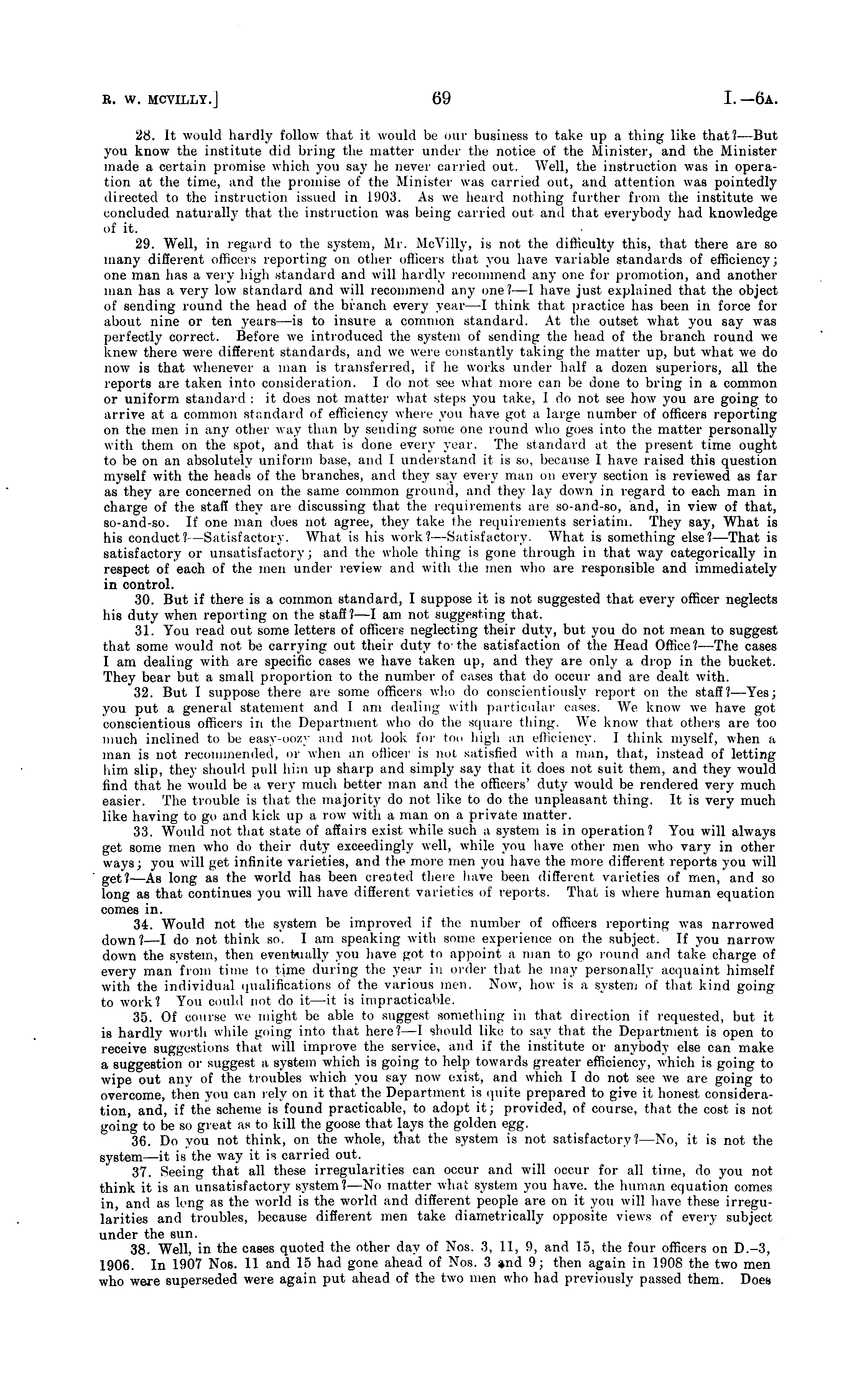 28. It would hardly follow that it would be our business to take up a thing like that?— But you know the institute did bring the matter under the notice of the Minister, and the Minister made a certain promise which you say he never carried out. Well, the instruction was in operation at the time, and the promise of the Minister was carried out, and attention was pointedly directed to the instruction issued in 1903. As we heard nothing further from the institute we concluded naturally that the instruction was being carried out and that everybody had knowledge of it. 29. Well, in regard to the system, Mr. McVilly, is not the difficulty this, that there are so many different officers reporting on other officers thai you have variable standards of efficiency; one man has a very high standard and will hardly recommend any one for promotion, and another man has a very low standard and will recommend any one? —I have just explained that the object of sending round the head of the branch every year—l think that practice has been in force for about nine or ten years —is to insure a common standard. At the outset what you say was perfectly correct. Before we introduced the system of sending the head of the branch round we knew there were different standards, and we were constantly taking the matter up, but what we do now is that whenever a man is transferred, if he works under half a dozen superiors, all the reports are taken into consideration. Ido not see what more can be done to bring in a common or uniform standard : it does not matter what steps you take, I do not see how you are going to arrive at a common standard of efficiency where you have got a large number of officers reporting on the men in any other way than by sending some one round who goes into the matter personally with them on the spot, and that is done every year. The standard at the present time ought to be on an absolutely uniform base, and 1 understand it is so, because I have raised this question myself with the heads of the branches, and they say even- man on every section is reviewed as far as they are concerned on the same common ground, and they lay down in regard to each man in charge of the staff they are discussing that the requirements are so-and-so, and, in view of that, so-and-so. If one man does not agree, they take the requirements seriatim. They say, What is his conduct? —Satisfactory. What is his work? —Satisfactory. What is something else?— That is satisfactory or unsatisfactory; and the whole thing is gone through in that way categorically in respect of each of the men under review and with the men who are responsible and immediately in control. 30. But if there is a common standard, I suppose it is not suggested that every officer neglects his duty when reporting on the staff? —I am not suggesting that. 31. You read out some letters of officers neglecting their duty, but you do not mean to suggest that some would not be carrying out their duty to-the satisfaction of the Head Office?— The cases I am dealing with are specific cases we have taken up, and they are only a drop in the bucket. They bear but a small proportion to the number of cases that do occur and are dealt with. 32. But I suppose there are some officers who do conscientiously report on the staff? —Yes; you put a general statement and I am dealing with particular cases. We know we have got conscientious officers in the Department who do the square thing. We know that others are too much inclined to be easy-oozy and not look for too high an efficiency. I think myself, when a man is not recommended, or when an officer is not satisfied with a man, that, instead of letting him slip, they should pull him up sharp and simply say that it does not suit them, and they would find that he would be a very much better man and the officers' duty would be rendered very much easier. The trouble is that the majority do not like to do the unpleasant thing. It is very much like having to go and kick up a row with a man on a private matter. 33. Would not that state of affairs exist while such a system is in operation? You will always get some men who do their duty exceedingly well, while you have other men who vary in other ways; you will get infinite varieties, and the more men you have the more different reports you will get?—As long as the world has been created there have been different varieties of men, and so long as that continues you will have different varieties of reports. That is where human equation comes in. 34. Would not the system be improved if the number of officers reporting was narrowed down? —I do not think so. I am speaking with some experience on the subject. If you narrow down the system, then eventtially you have got to appoint a man to go round and take charge of every man from time to time during the year in order that he may personally acquaint himself with the individual qualifications of the various men. Now, how is a system of that kind going to work? You could not do it —it is impracticable. 35. Of course we might be able to suggest something in that direction if requested, but it is hardly worth while going into that here?—l should like to say that the Department is open to receive suggestions thai will improve the service, and if the institute or anybody else can make a suggestion or suggest a system which is going to help towards greater efficiency, which is going to xvipe out any of the troubles which you say now exist, and which I do not see we are going to overcome, then you can rely on it that the Department is quite prepared to give it honest consideration, and, if the scheme is found practicable, to adopt it; provided, of course, that the cost is not going to be so great as to kill the goose that lays the golden egg. 36. Do you not think, on the whole, that the system is not satisfactory?—No, it is not the system —it is the way it is carried out. 37. Seeing that all these irregularities can occ