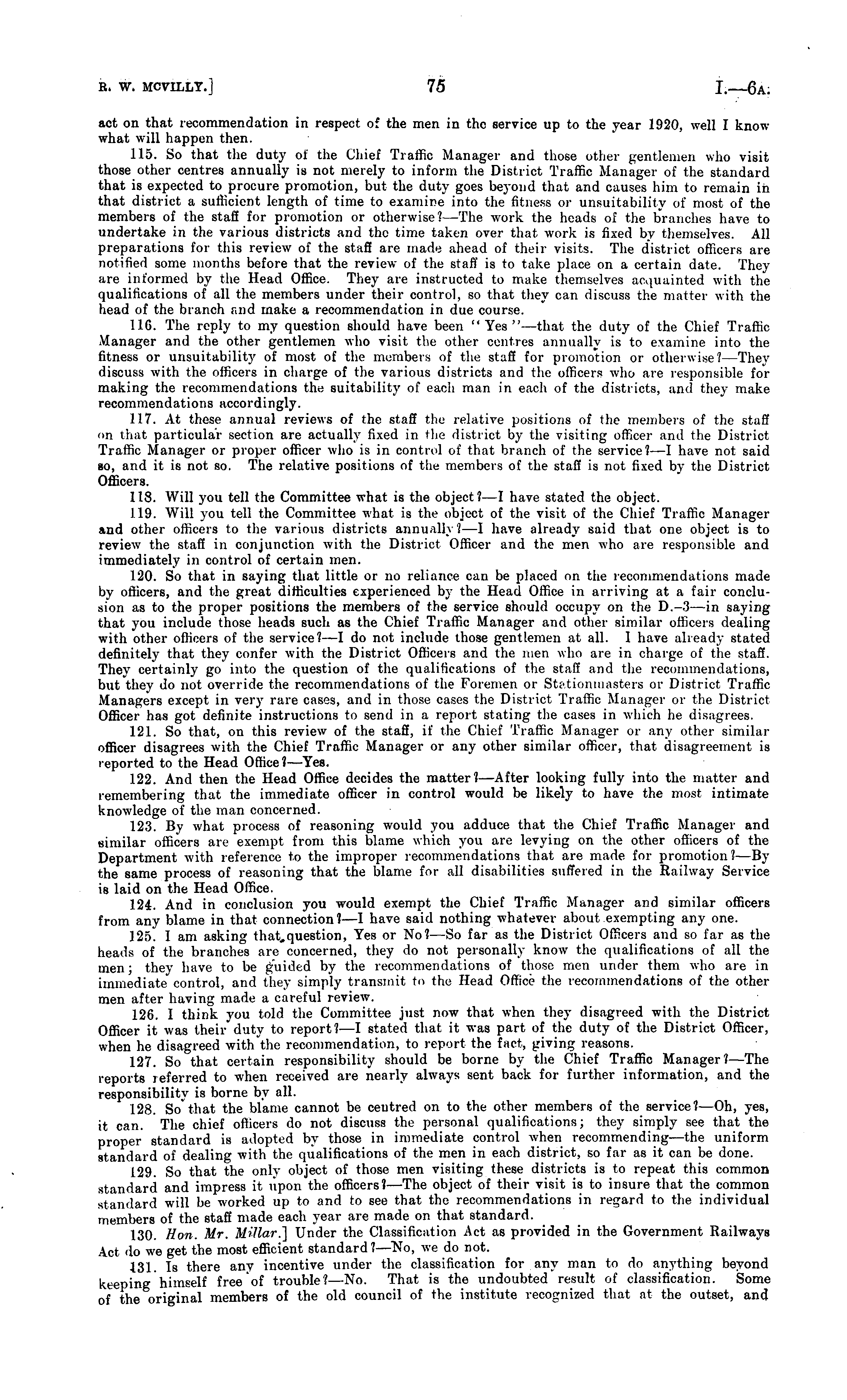 act on that recommendation in respect of the men in the service up to the year 1920, xvell I know what will happen then. 115. So that the duty of the Chief Traffic Manager and those other gentlemen who visit those other centres annually is not merely to inform the District Traffic Manager of the standard that is expected to procure promotion, but the duty goes beyond that and causes him to remain in that district a sufficient length of time to examine into the fitness or unsuitability of most of the members of the staff for promotion or otherwise? —The work the heads of the branches have to undertake in the various districts and the time taken over that work is fixed by themselves. All preparations for this review of the staff are made ahead of their visits. The district officers are notified some months before that the review of the staff is to take place on a certain date. They are informed by the Head Office. They are instructed to make themselves acquainted with the qualifications of all the members under their control, so that they can discuss the matter with the head of the branch and make a recommendation in due course. 116. The reply to my question should have been " Yes " —that the duty of the Chief Traffic Manager and the other gentlemen who visit the other centres annually is to examine into the fitness or unsuitability of most of the members of the staff for promotion or otherwise?— They discuss xvith the officers in charge of the various districts and the officers who are responsible for making the recommendations the suitability of eacli man in each of the districts, and they make recommendations accordingly. 117. At these annual reviews of the staff the relative positions of the members of the staff on that particular section are actually fixed in the district by the visiting officer and the District Traffic Manager or proper officer xvho is in control of that branch of the service?—l have not said go, and it is not so. The relative positions of the members of the staff is not fixed by the District Officers. 118. Will you tell the Committee what is the object?—l have stated the object. 119. Will you tell the Committee what is the object of the visit of the Chief Traffic Manager and other officers to the various districts annually?—l have already said that one object is to reviexv the staff in conjunction xvith the District Officer and the men xvho are responsible and immediately in control of certain men. 120. So that in saying that little or no reliance can be placed on the recommendations made by officers, and the great difficulties experienced by the Head Office in arriving at a fair conclusion as to the proper positions the members of the service should occupy on the D.-3 —in saying that you include those heads such as the Chief Traffic Manager and other similar officers dealing with other officers of the service? —I do not include those gentlemen at all. I have already stated definitely that they confer xvith the District Officers and the men xvho are in charge of the staff. They certainly go into the question of the qualifications of the staff and the recommendations, but they do not override the recommendations of the Foremen or Stationmasters or District Traffic Managers except in very rare cases, and in those cases the District Traffic Manager or the District Officer has got definite instructions to send in a report stating the cases in xvhich he disagrees. 121. So that, on this reviexv of the staff, if the Chief Traffic Manager or any other similar officer disagrees xvith the Chief Traffic Manager or any other similar officer, that disagreement is reported to the Head Office? —Yes. 122. And then the Head Office decides the matter?— After looking fully into the matter and remembering that the immediate officer in control would be likely to have the most intimate knoxxdedge of the man concerned. 123. By what process of reasoning would you adduce that the Chief Traffic Manager and similar officers are exempt from this blame which you are levying on the other officers of the Department with reference to the improper recommendations that are made for promotion?—By the same process of reasoning that the blame for all disabilities suffered in the Railway Service is laid on the Head Office. 124. And in conclusion you would exempt the Chief Traffic Manager and similar officers from any blame in that connection? —I have said nothing whatever about exempting any one. 125. I am asking that,question, Yes or No? —So far as the District Officers and so far as the heads of the branches are concerned, they do not personally know the qualifications of all the men; they have to be guided by the recommendations of those men under them who are in immediate" control, and they simply transmit to the Head Office the recommendations of the other men after having made a careful review. 126. I think you told the Committee just now that when they disagreed with the District Officer it was their duty to report?—l stated that it was part of the duty of the District Officer, when he disagreed with "the recommendation, to report the fact, giving reasons. 127. So that certain responsibility should be borne by the Chief Traffic Manager?— The reports jeferred to when received are nearly always sent back for further information, and the responsibility is borne by all. 128. So"that the blame cannot be ceutred on to the other members of the service? —Oh, yes, it can. The chief officers do not discuss the personal qualifications; they simply see that the proper standard is adopted by those in immediate control xvhen recommending —the uniform standard of dealing with the qualifications of the men in each district, so far as it can be done. 129. So that the only object of those men visiting these districts is to repeat this common standard and impress it upon the officers? —The object of their visit is to insure that the common standard will be worked up to and to see