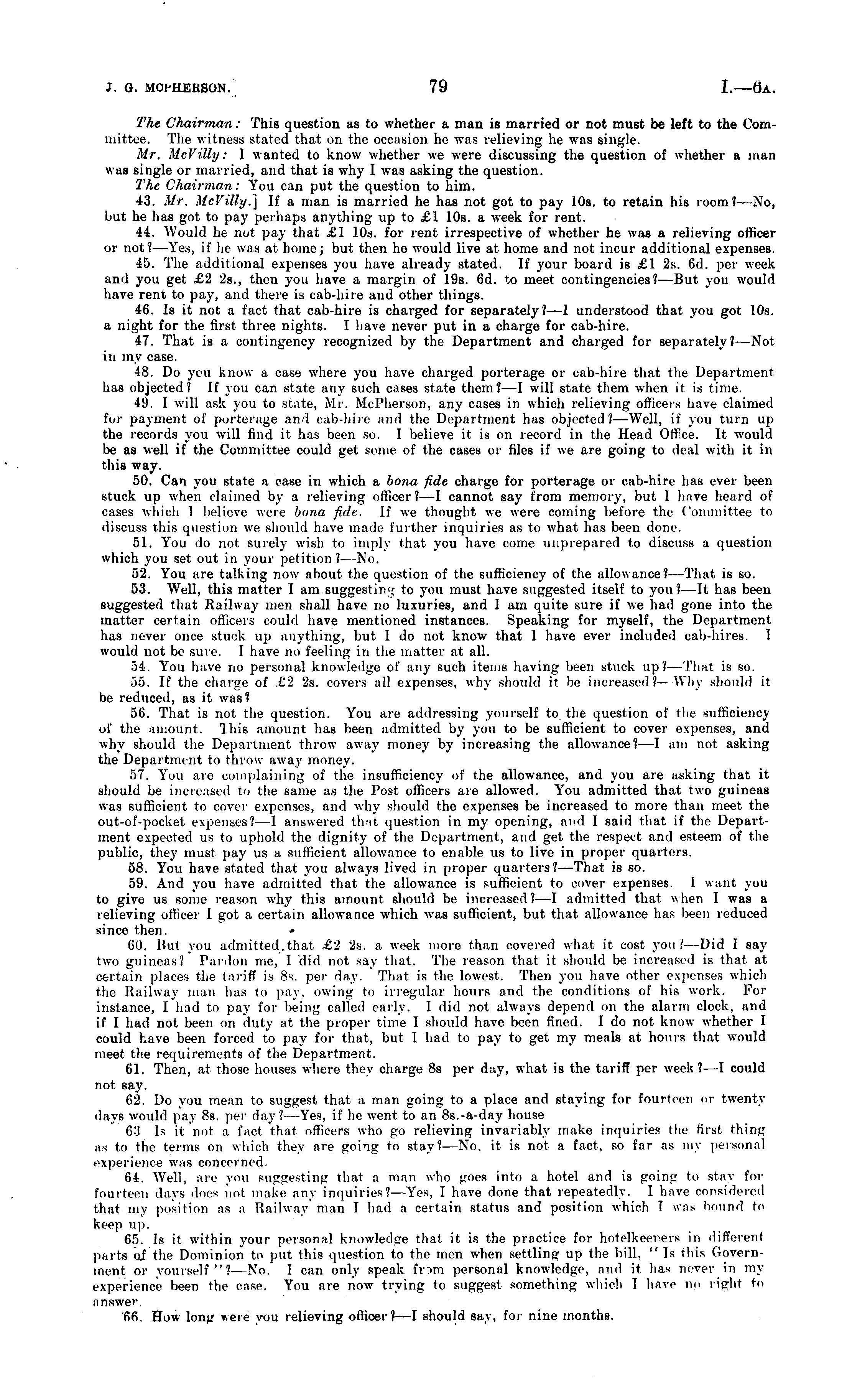 The Chairman: This question as to whether a man is married or not must be left to the Committee. The witness stated that on the occasion he xvas relieving he was single. Mr. McVilly: 1 xvanted to know whether we were discussing the question of whether a man was single or married, and that is xvhy I was asking the question. The Chairman: You can put the question to him. 43. Mr. McVilly.] If a man is married he has not got to pay 10s. to retain his room? —No, but he has got to pay perhaps anything up to £1 10s. a week for rent. 44. Would he not pay that £1 10s. for rent irrespective of whether he was a relieving officer or not?— Yes, if he xvas at home; but then he xvould live at home and not incur additional expenses. 45. The additional expenses you have already stated. If your board is £1 2s. 6d. per week and you get £2 25., then you have a margin of 19s. 6d. to meet contingencies?— But you xvould have rent to pay, and there is cab-hire and other things. 46. Is it not a fact that cab-hire is charged for separately?—l understood that you got 10s. a night for the first three nights. I have never put in a charge for cab-hire. 47. That is a contingency recognized by the Department and charged for separately?— Not in my case. 48. Do you know a case xvhere you have charged porterage or cab-hire that the Department has objected? If you can state any such cases state them?—l will state them when it is time. 49. I will ask you to state, Mr. McPherson, any cases in which relieving officers have claimed for payment of porterage and cab-hire and the Department has objected? —Well, if you turn up the records you xvill find it has been so. I believe it is on record in the Head Office. It would be as well if the Committee could get some of the cases or files if we are going to deal with it in this way. 50. Can you state a case in which a bona fide charge for porterage or cab-hire has ever been stuck up when claimed by a relieving officer? —I cannot say from memory, but 1 have heard of cases xvhich 1 believe were bona fide. If xve thought we were coming before the Committee to discuss this question we should have made further inquiries as to what has been done. 51. You do not surely xvish to imply that you have come unprepared to discuss a question which you set out in your petition?— No. 52. You are talking now about the question of the sufficiency of the allowance? —That is so. 53. Well, this matter I am.suggesting to you must have suggested itself to you? —It has been suggested that Railway men shall have no luxuries, and 1 am quite sure if xve had gone into the matter certain officers could have mentioned instances. Speaking for myself, the Department has never once stuck up anything, but I do not knoxv that I have ever included cab-hires. 1 would not be sure. 1 have no feeling in the matter at all. 54. You have no personal knowledge of any such items having been stuck up?- That is so. 55. If the charge of £2 2s. covers all expenses, why should it be increased?—-Why should it be reduced, as it xvas? 56. That is not the question. You are addressing yourself to the question of the sufficiency of the amount. Ibis amount has been admitted by you to be sufficient to cover expenses, and why should the Department throw away money by increasing the allowance?—l am not asking the Department to throw away money. 57. You are complaining of the insufficiency of the allowance, and you are asking that it should be increased to the same as the Post officers are allowed. You admitted that two guineas was sufficient to cover expenses, and why should the expenses be increased to more than meet the out-of-pocket expenses? I answered that question in my opening, and I said that if the Department expected us to uphold the dignity of the Department, and get the respect and esteem of the public, they must pay us a sufficient allowance to enable us to live in proper quarters. 58. You have stated that you always lived in proper quarters?— That is so. 59. And you have admitted that the allowance is sufficient to cover expenses. 1 want you to give us some reason why this amount should be increased? —I admitted that when I was a relieving officer 1 got a certain allowance which xvas sufficient, but that allowance has been reduced since then. 60. But you admitted,.that £2 2s. a week more than covered what it cost you ! —Did I say two guinea-' Pardon me, I 'did not say that. The reason that it should be increased is that at certain places the tariff is Bs. per day. That is the lowest. Then you have other expenses which the Railway man lias to pay, owing to irregular hours and the conditions of his work. For instance, I had to pay for being called early. I did not always depend on the alarm clock, and if I had not been on duty at the proper time I should have been fined. Ido not know whether I could have been forced to pay for that, but I had to pay to get my meals at hours that xvould meet the requirements of the Department. 61. Then, at those houses xvhere they charge 8s per day, what is the tariff per week?—l could not say. 62. Do you mean to suggest that a man going to a place and staying for fourteen or twenty days would pay Bs. per day .' Yes, if he went to an Bs.-a-day house 63 Is if not :t fact tlnil officers who go relieving invariably make inquiries the first thing as to the terms on which they are going to stay?—No, it is not a fact, so far as my personal experience was concerned. 64. Well, are you suggesting thai a man who goes into a hotel and is going to stay for fourteen days does not make any inquiries?— Yes. 1 have done that repeatedly. I have considered that my position as a Railway man I had a certain status and position which I was bound to keep up. 65. Is it within your personal knowledge that it is the practice for hotelkeeners in different parts of the Dominion to put this question to the men when settling up the bill, " Is this Government or yourself"?— No. I c
