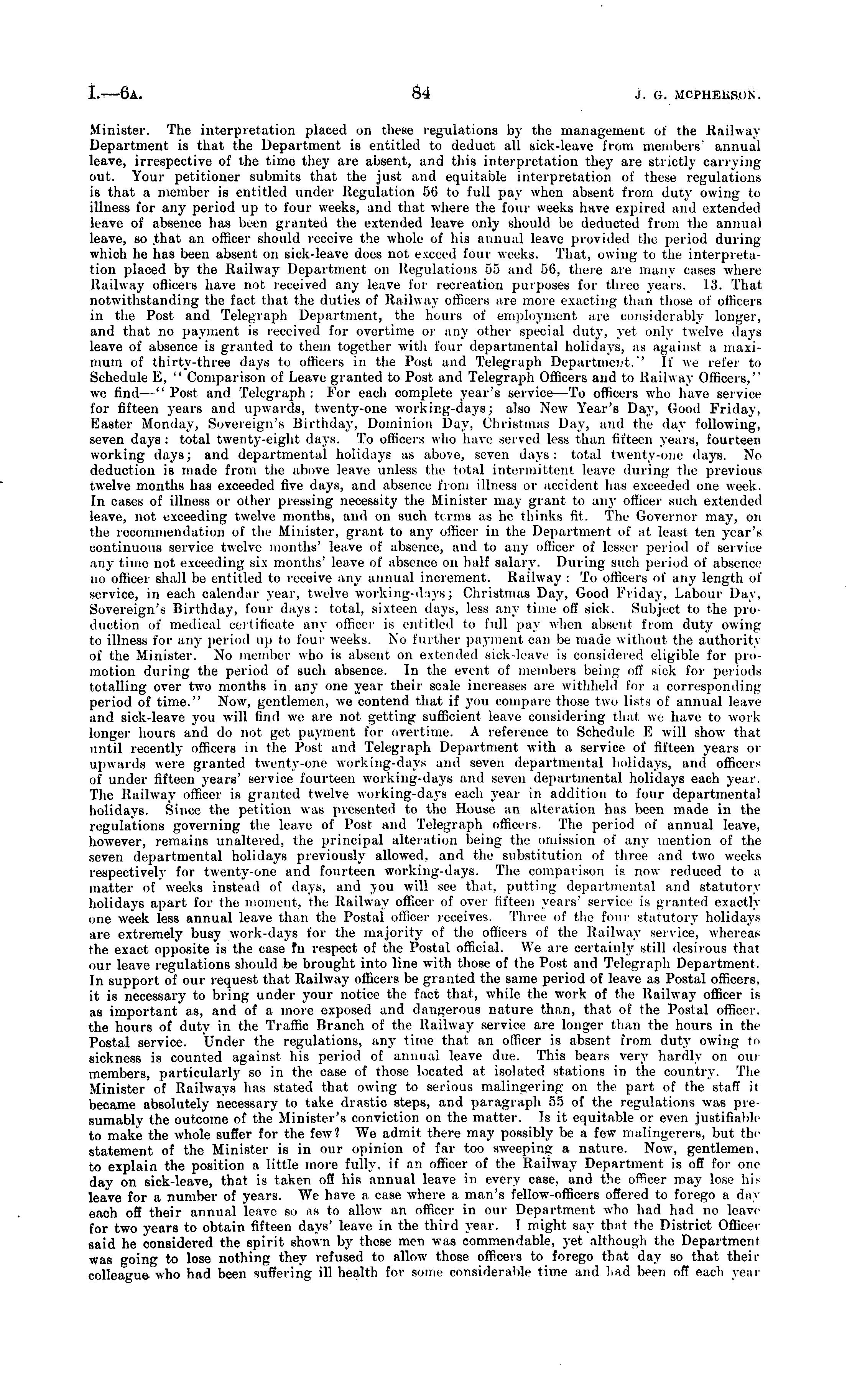 Minister. The interpretation placed on these regulations by the management of the Railway Department is that the Department is entitled to deduct all sick-leave from members' annual leave, irrespective of the time they are absent, and this interpretation they are strictly carrying out. Your petitioner submits that the just and equitable interpretation of these regulations is that a member is entitled under Regulation 56 to full pay when absent from duty owing to illness for any period up to four weeks, and that where the four weeks have expired and extended leave of absence has been granted the extended leave only should be deducted from the annual leave, so .that an officer should receive the whole of his annual leave provided the period during which he has been absent on sick-leave does not exceed four weeks. That, owing to the interpretation placed by the Railway Department on Regulations 55 and 56, there are many cases where Railway officers have not received any leave for recreation purposes for three years. 13. That notwithstanding the fact that the duties of Railway officers are more exacting than those of officers in the Post and Telegraph Department, the hours of employment are considerably longer, and that no payment is received for overtime or any other special duty, yet only twelve days leave of absence is granted to them together with four departmental holidays, us against a maximum of thirty-three days to officers in the Post and Telegraph Department.' , [f we refer to Schedule E, " Comparison of Leave granted to Post and Telegraph Ofiicers and to Railway Officers, , ' we find—" Post and Telegraph : For each complete year's service—To officers who have service for fifteen years and upwards, twenty-one working-days; also New Year's Day, Good Friday, Easter Monday, Sovereign's Birthday, Dominion Day. Christmas Day. and the day following, seven days : total twenty-eight days. To officers who have served less than fifteen years, fourteen working days; and departmental holidays as above, seven days: total twenty-one days. No deduotion is made from the above leave unless the total intermittent leave during the previous twelve months has exceeded five days, and absence from illness or accident has exceeded one week. In cases of illness or oilier pressing necessity the Minister may grant to any officer such extended leave, not exceeding twelve months, and on such i< rms as he thinks fit. The Governor may, on the recommendation of the Minister, grant to any officer in the Department of at least ten year's continuous service twelve months' leave of absence, and to any officer of lesser period of service any time not exceeding six months' leave of absence on half salary. During such period of absence no officer shall be entitled to receive any annual increment. Railway :To officers of any length of service, in each calendar year, twelve working-daysj Christmas Day, Good Friday, Labour Day, Sovereign's Birthday, four days: total, sixteen days, less any time off sick. Subjeci to the pro iliiction of medical certificate any officer is entitled to full pay when absent from duty owing to illness for any period up to four weeks. No further payment can be made without the authority of the Minister. No member who is absent on extended sick-leave is considered eligible for pro motion during the period of such absence. In the event of members being off sick for periods totalling over two months in any one year their scale increases are withheld for a corresponding period of time." Now, gentlemen, we contend that if you compare those two lists of annual leave and sick-leave you will lind we are not getting sufficient leave considering that we have to work longer hours and do not get payment for overtime. A reference to Schedule E will show that until recently officers in the Post and Telegraph Department with a service of fifteen years or upwards were granted twenty-one working-days and seven departmental holidays, and officers of under fifteen years' service fourteen working-days and seven departmental holidays each year The Railway officer is granted twelve working-days each year in addition to four departmental holidays. Since the petition was presented to the House an alteration has been made in the regulations governing the leave of Post and Telegraph officers. The period of annual leave, however, remains unaltered, the principal alteration being the omission of any mention of the seven departmental holidays previously allowed, and the substitution of three and two weeks respectively for twenty-one and fourteen working-days. The comparison is now reduced to a matter of weeks instead of days, and you will see that, putting departmental and statutory holidays apart for the moment, the Railway officer of over fifteen years' service is granted exactly one week less annual leave than the Postal officer receives. Three of the four statutory holidays are extremely busy work-days for the majority of the officers of the Railway service, whereas the exact opposite is the case fn respect of the Postal official. We are certainly still desirous that our leave regulations should be brought into line with those of the Post and Telegraph Department. In support of our request that Railway officers be granted the same period of leave as Postal officers, it is necessary to bring under your notice the fact that, while the work of the Railway officer is as important as, and of a more exposed and dangerous nature than, that of the Postal officer, the hours of duty in the Traffic Branch of the Railway service are longer than the hours in the Postal service. Under the regulations, any time that an officer is absent from duty owing to sickness is counted against his period of annual leave due. This bears very hardly on our members, particularly so in the case of those located at isolated stations in the country. The Minister of Railways has stated that owing to serious malingering on the part of the staff it be