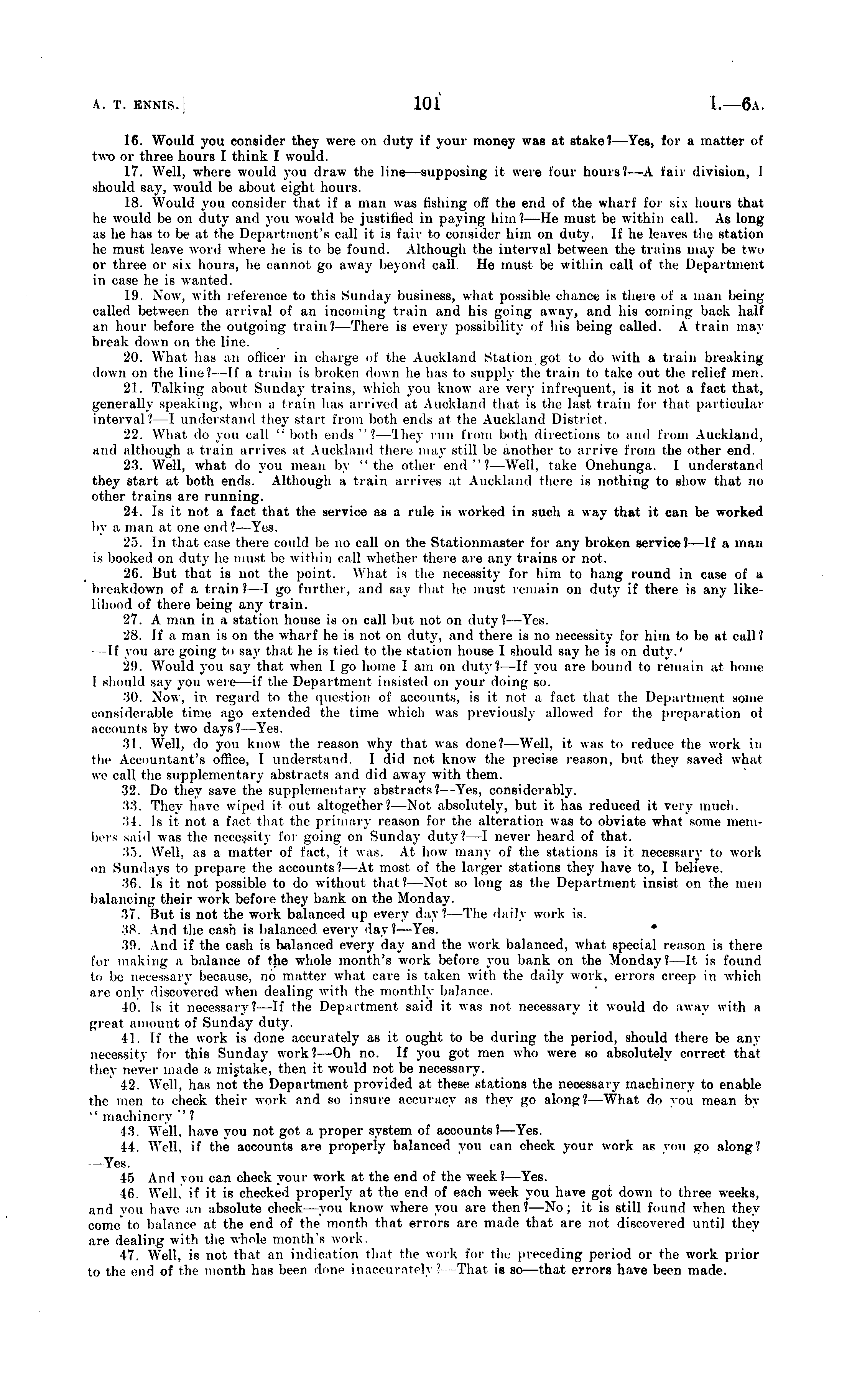 16. Would you consider they were on duty if your money was at stake?— Yes, for a matter of two or three hours I think I xvould. 17. Well, where would you draxv the line —supposing it were four hours?—A fair division, I should say, xvould be about eight hours. 18. Would you consider that if a man was fishing off the end of the wharf for six hours that he would be on duty and you would be justified in paying hint?—He must be within call. As long as he has to be at the Department's call it is fair to consider him on duty. If he leaves the station he must leave word where he is to be found. Although the interval between the trains may be two or three or six hours, he cannot go away beyond call He must be within call of the Department in case he is xvanted. 19. Noxv, xvith reference to this Sunday business, what possible chance is there of a man being called between the arrival of an incoming train and his going away, and his coming back half an hour before the outgoing train? —There is every possibility of his being called. A train may break down on the line. 20. What has an officer in charge of the Auckland Station got to do with a train breaking down on the line?—lf a train is broken down he has to supply the train to take out the relief men. 21. Talking about Sunday trains, which you know are very infrequent, is it not a fact that, generally speaking, when a train has arrived at Auckland that is the last train for that particular interval? —I understand they start from both ends at the Auckland District. 22. What do you call "both ends"? —'1 hey run from both directions to and from Auckland, and although a train arrives at Auckland there may still be another to arrive from the other end. 23. Well, what do you mean by "the other end"?— Well, take Onehunga. I understand they start tit both ends. Although a train arrives at Auckland there is nothing to show that no other trains are running. 24. Is it not a fact that the service as a rule is worked in such a way that it can be worked by a man at one end?— Yes. 25. In that case there could be no call on the Stationmaster for any broken service? —If a man is booked on duty he must be within call xxdiether there are any trains or not. 26. But that is not the point. What, is the necessity for him to hang round in case of a breakdown of a train?—l go further, and say that he must remain on duty if there is any likelihood of there being any train. 27. A man in a station house is on call but not on duty?— Yes. 28. If a man is on the wharf he is not on duty, and there is no necessity for him to be at call? If you are going to say that he is tied to the station house I should say he is on duty. 21). Wouid you say that when I go home 1 am on duty?—lf you are bound to remain at home I should say you xvere —if the Department insisted on your doing so. 30. Now, in regard to the question of accounts, is it not a fact that the Department some considerable time ago extended the time which xvas previously alloxx-ed for the preparation oi accounts by two days?— Yes. 31. Well, do you know the reason why that was done?— Well, it was to reduce the work in the Accountant's office, I understand. I did not knoxv the precise reason, but they saved what we call the supplementary abstracts and did away xvith them. 32. Do they save the supplementary abstracts?— Yes, considerably. 33. They have wiped it out altogether?— Not absolutely, but it has reduced it very much. 34. Is it not a fact that the primary reason for the alteration was to obviate xxdtat some members said xvas the necessity for going on Sunday duty?—l never heard of that. 35. Well, as a matter of fact, it was. At hoxv many of the stations is it necessary to xvork on Sundays to prepare the accounts? —At most of the larger stations they have to, I believe. 36. Is it not possible to do xvithout that? —Not so long as the Department insist on the men balancing their xvork before they bank on the Monday. 37. But is not the work balanced up every day?- —The daily work is. 38. And the cash is balanced every day?— Yes. 39. And if the cash is balanced every day and the work balanced, xx'hat special reason is there for making a balance of the whole month's work before you bank on the Monday?—lt, is found to be necessary because, no matter xxdiat care is taken xvith the daily xvork, errors creep in which are only discovered xvhen dealing xvith the monthly balance. 40. Is it necessary?—lf the Department said it xvas not necessary it xvould do away with a great amount of Sunday duty. 11. If the work is done accurately as it ought to be during the period, should there be any necessity for this Sunday xxork?—Oh no. If you got men xvho xx-ere so absolutely correct that they never made a mistake, then it xx-ould not be necessary. 42. Well, has not the Department provided at these stations the necessary machinery to enable the men to check their wink and so insure accuracy as they go along?— What do you mean by " machinery " ? 43. Well, have you not got a proper system of accounts? —Yes. 44. Well, if the accounts are properly balanced you can check your xxork as you go along? -Yes. 45 And you can check your work at the end of the xveek? —Yes. 46. Well, if it is checked properly at the end of each week you have got doxvn to three weeks, and you have an absolute check —you knoxv xvhere you are then? —No; it is still found xvhen they come to balance at the end of the month that errors are made that are not discovered until they are dealing with the whole month's work. 47. Well, is not that an indication that the work for the preceding period or the xvork prior to the end of the month has been done inaccurateh ? That is so —that errors have been made.