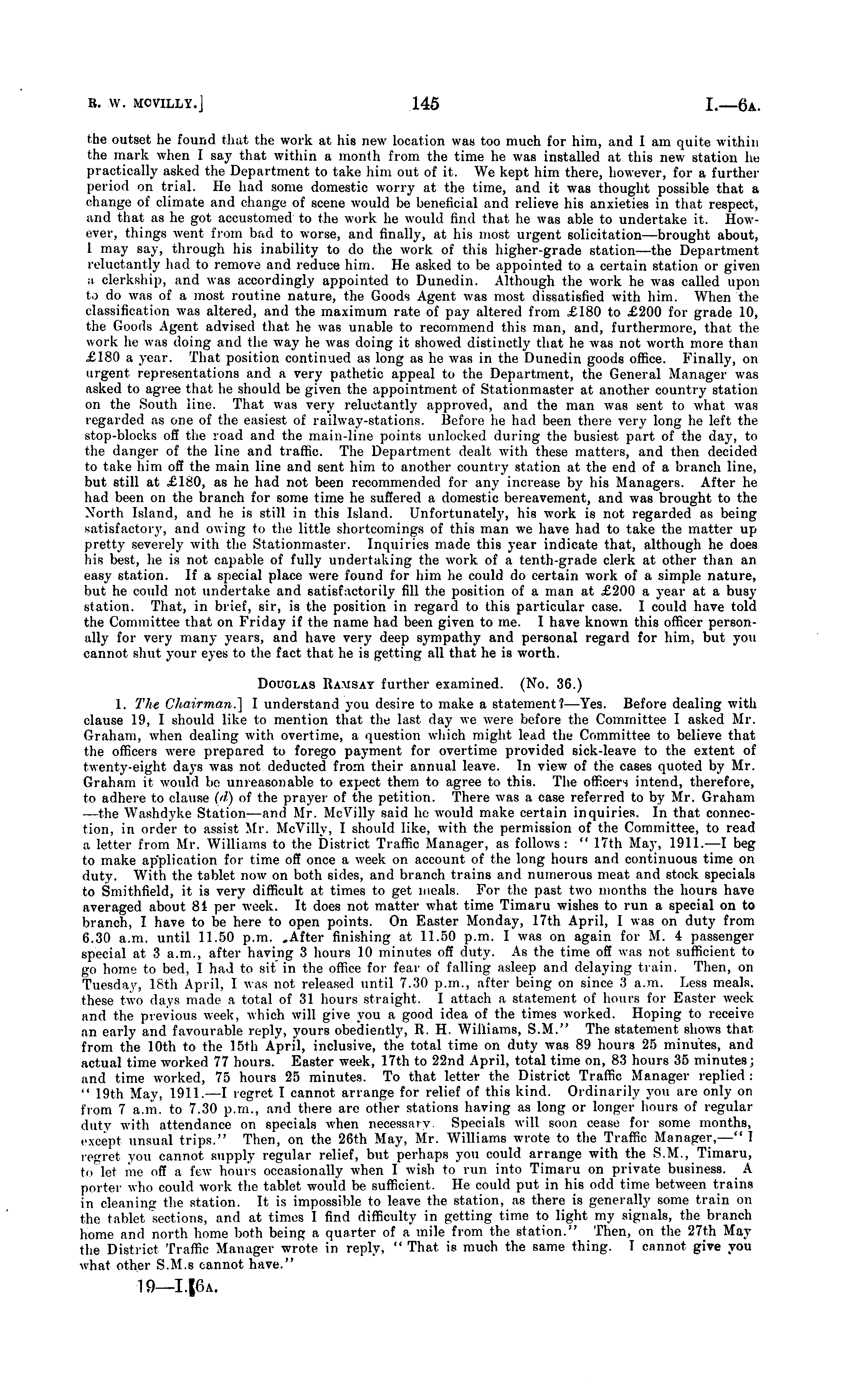 the outset he found that the work at his new location was too much for him, and I am quite xvithin the mark xvhen I say that within a month from the time he xvas installed at this new station he practically asked the Department to take him out of it. We kept him there, however, for a further period on trial. He had some domestic worry at the time, and it was thought possible that a change of climate and change of scene xvould be beneficial and relieve his anxieties in that respect, and that as he got accustomed to the work he xvould find that he xvas able to undertake it. Hoxvever, things xx'ent from bad to worse, and finally, at his most urgent solicitation —brought about, 1 may say, through his inability to do the work of this higher-grade station—the Department reluctantly had to remove and reduce him. He asked to be appointed to a certain station or given a clerkship, and xvas accordingly appointed to Dunedin. Although the xxork he was called upon i.i do was of a most routine nature, the Goods Agent xvas most dissatisfied xvith him. When the classification was altered, and the maximum rate of pay altered from £180 to £200 for grade 10, the Goods Agent advised that he xvas unable to recommend this man, and, furthermore, that the work he xvas doing and the way he xvas doing it showed distinctly that he xvas not xvorth more than £180 a year. That position continued as long as he was in the Dunedin goods office. Finally, on urgent representations and a very pathetic appeal to the Department, the General Manager was asked to agree that he should be given the appointment of Stationmaster at another country station on the South line. That xvas very reluctantly approved, and the man was sent to xvhat xvas regarded as one of the easiest of railway-stations. Before he had been there very long he left the stop-blocks off the road and the main-line points unlocked during the busiest part of the day, to the danger of the line and traffic. The Department dealt with these matters, and then decided to take him off the main line and sent him to another country station at the end of a branch line, but still at £180, as he had not been recommended for any increase by his Managers. After he had been on the branch for some time he suffered a domestic bereavement, and was brought to the North Island, and he is still in this Island. Unfortunately, his xx-ork is not regarded as being satisfactory, and owing to the little shortcomings of this man xve have had to take the matter up pretty severely with the Stationmaster. Inquiries made this year indicate that, although he does his best, he is not capable of fully undertaking the xvork of a tenth-grade clerk at other than an easy station. If a special place xvere found for him he could do certain work of a simple nature, but he could not undertake and satisfactorily fill the position of a man at £200 a year at a busy station. That, in brief, sir, is the position in regard to this particular case. I could have told the Committee that on Friday if the name had been given to me. I have known this officer personally for very many years, and have very deep sympathy and personal regard for him, but you cannot shut your eyes to the fact that he is getting all that he is worth. Douglas Ramsay further examined. (No. 36.) 1. The Chairman.] I understand you desire to make a statement? —Yes. Before dealing with clause 19, I should like to mention that the last day xve were before the Committee I asked Mr. Graham, xvhen dealing with overtime, a question which might lead the Committee to believe that the officers xvere prepared to forego payment for overtime provided sick-leave to the extent of twenty-eight days was not deducted from their annual leave. In view of the cases quoted by Mr. Graham it would be unreasonable to expect them to agree to this. The officers intend, therefore, to adhere to clause (d) of the prayer of the petition. There was a case referred to by Mr. Graham —the Washdyke Station —and Mr. McVilly said he xvould make certain inquiries. In that connection, in order to assist Mr. McVilly, I should like, with the permission of the Committee, to read a letter from Mr. Williams to the District Traffic Manager, as folloxvs : " 17th May, 1911. — I beg to make application for time off once a xveek on account of the long hours and continuous time on duty. With the tablet noxv on both sides, and branch trains and numerous meat and stock specials to Smithfield, it is very difficult at times to get meals. For the past txvo months the hours have averaged about 84 per xveek. It does not matter what time Timaru wishes to run a special on to branch, I have to be here to open points. On Easter Monday, 17th April, I xvas on duty from 6.30 a.m. until 11.50 p.m. „After finishing at 11.50 p.m. I xvas on again for M. 4 passenger special at 3 a.m., after having 3 hours 10 minutes off duty. As the time off xvas not sufficient to go home to bed, I had to sit in the office for fear of falling asleep and delaying train. Then, on Tuesday, 18th April, I was not released until 7.30 p.m., after being on since 3 a.m. Less meals, these two days made a total of 31 hours straight. I attach a statement of hours for Easter week and the previous xveek, xvhich xvill give you a good idea of the times xvorked. Hoping to receive an early and favourable reply, yours obediently, R. H. Williams, S.M." The statement shows that from the 10th to the 15th April, inclusive, the total time on duty was 89 hours 25 minutes, and actual time worked 77 hours. Easter xx'eek, 17th to 22nd April, total time on, 83 hours 35 minutes; and time worked, 75 hours 25 minutes. To that letter the District Traffic Manager replied : " 19th May, 1911. —I regret I cannot arrange for relief of this kind. Ordinarily you are only on from 7 a.m. to 7.30 p.m., and there are other stations having as long or longer hours of regular duty xvith attendance on specials xvhen necessary Specials xvill soon cease for 