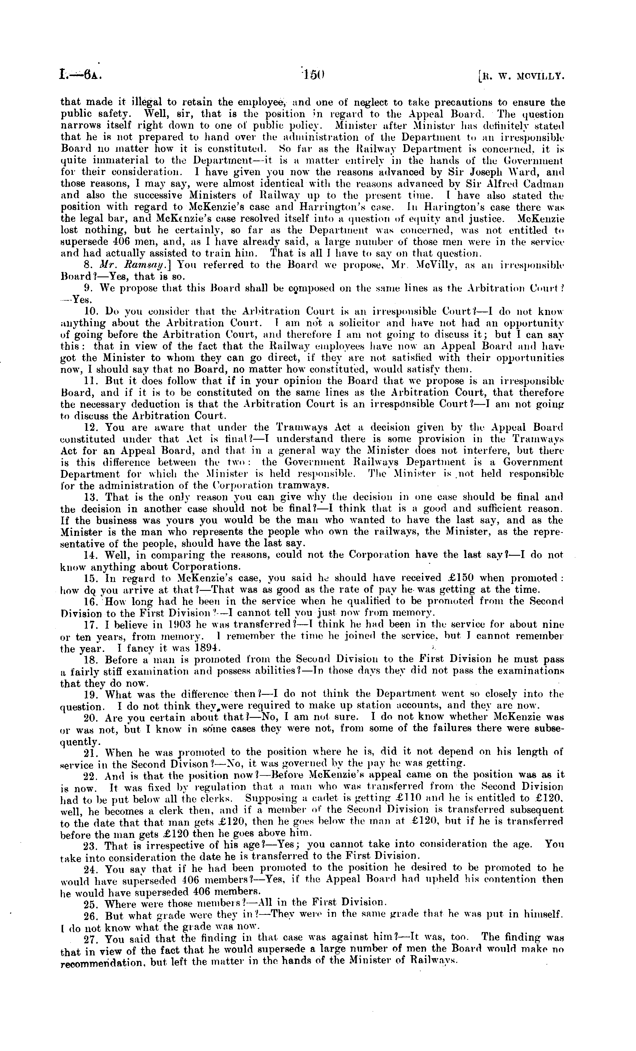 that made it illegal to retain the employee, and one of neglect to take precautions to ensure the public safety. Well, sir, that is the position in regard to the Appeal Board. The question narroxvs itself right down to one of public policy. Minister after Minister has definitely stated that he is not prepared to hand over the administration of the Department to an irresponsible Board no matter how it is constituted. So far as the Railway Department is concerned, it is quite immaterial to the Department —-it is a matter entirely in the hands of the Government for their consideration. I have given you now the reasons advanced by Sir Joseph Ward, anil those reasons, 1 may say. were almost identical with the reasons advanced by Sir Alfred ('adman and also the successive Ministers of Railway up to the present time. I have also stated the position xvith regard to McKenzie's case and Harrington's case. In Harington's case there was the legal bar, and McKuizie's case resolved itself into a question of equity and justice. McKenzie lost nothing, but he certainly, so far its the Department was concerned, was not entitled to supersede 406 men, and, as I have already said, a large number of those men were in the service and had actually assisted to train him. That is all I have to say on that question. 8. .V/\ Ramsay.] You referred to the Board we propose, Mr McVilly. as an irresponsible Board? —Yes, that is so. 9. We propose that this Hoard shall be composed on the same lines as the Arbitration Court? ■Yes. 111. Do you consider that the Arbitration Court is an irresponsible Court?—l do not know anything about the Arbitration Court. I am not a solicitor and have not had an opportunity of going before the Arbitration Court, and therefore I am not going to discuss it; but I can say this: that in viexv of the fact that the Railway employees have now an Appeal Board and have got the Minister to whom they can go direct, if they an- not satisfied with their opportunities now, I should say that no Board, no matter how constituted, xvould satisfy them. 11. But it does follow that if in your opinion the Board thai we propose is an irresponsible Board, and if it is to be constituted on the same lines as the Arbitration Court, that therefore the necessary deduction is that the Arbitration Court is an irresponsible Court?—l am not going to discuss the Arbitration Court. 12. You are aware that under the Tramways Act a decision given by the Appeal Board constituted under that Act is final? —I understand there is some provision in the Tramways Act for an Appeal Board, and that in a genera! way the Minister does not interfere, but thenis this difference betxveen the two: the Government Railways Department is a Government Department for which the Minister is held responsible. The Minister is .not held responsible for the administration of the Corporation tramways. 13. That is the only reason you can give why the decision in one case should be final and the decision in another case should not be final?—l think that is a good and sufficient reason. If the business was yours you would be the man who wanted to have the last say, and as the Minister is the man xvho represents the people xvho own the railways, the Minister, as the repre sentative of the people, should have the last say. 14. Well, in comparing the reasons, could not the Corporation have the last say?—l do not know anything about Corporations. 15. In regard to McKenzie's case, you said he should have received £150 when promoted : how do you arrive at that .'-—That was as good as the rate of pay he xvas getting at the time. 16. How long had he been in the service when he qualified to be promoted from the Second Division to the First Division?---I cannot tell you just now from memory. 17. I believe in 1903 he was transferred? —I think he had been in the service for about nine or ten years, from memory. I remember the time he joined the service, but I cannot remember the year. I fancy it was 1894. 18. Before a man is promoted from the Second Division to the First Division he must pass a fairly stiff examination and possess abilities?—ln those days they did not pass the examinations that they do now. 19. What xvas the difference then; —I do not think the Department went so closely into the question. Ido not think they.were required to make up station accounts, ami thex are now. 20. Are you certain about that?—No, I am not sure. I do not know whether McKenzie xvas or was not, but I know in some cases they were not, from some of the failures there were subsequently. 21. When he xvas promoted to the position xvhere he is, did it not depend on his length of service in the Second Divison?—No, it was governed by tin- pay he was getting. 22. And is that the position noxv?—Before McKenzie's appeal came on the position was as it is now. It was fixed by regulation that a man who xvas transferred from the Second Division had to be put below all the eh-rks. Supposing a cadet is getting £110 and he is entitled to £120, well, he becomes a clerk then, and if a member of the Second Division is transferred subsequent to the date that that man gets £120, then he goes below the man at £120, but if he is transferred before the man gets £120 then he goes above him. 23. That is irrespective of his age?—Y T es; you cannot take into consideration the age. You take into consideration the date he is transferred to the First Division. 24. You say that if he had been promoted to the position he desired to be promoted to he would have superseded 406 members? —Yes. if the Appeal Board had upheld his contention then he would have superseded 406 members. 25. Where were those members? All in the First Division. 26. But xvhat grade were they in I—They were in the same grade thai lie was put in himself. I do not know what the grade was now. 27. You said that the finding in that ease was against him? —It xvas, too. The finding was that in view of the fac