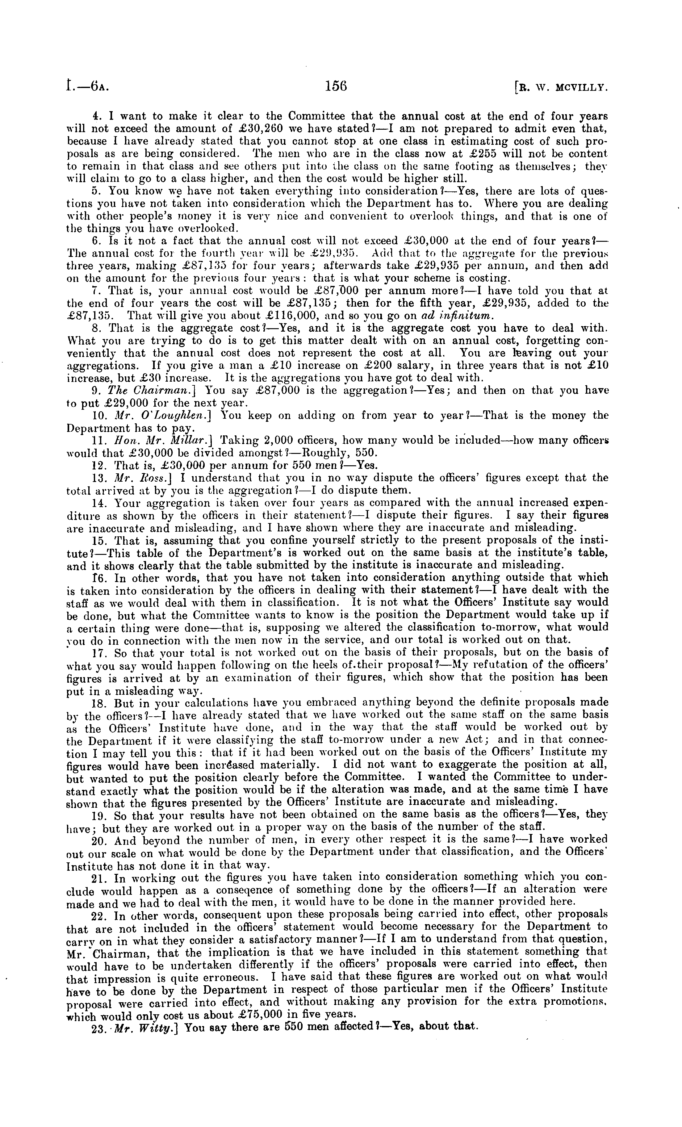4. I want to make it clear to the Committee that the annual cost at the end of four years xvill not exceed the amount of £30,260 xx'e have stated? —I am not prepared to admit even that, because I have already stated that you cannot stop at one class in estimating cost of such proposals as are being considered. The men xvho are in the class now at £255 will not be content to remain in that class and see others put into the class on the same footing as themselves; they xvill claim to go to a class higher, and then the cost xvould be higher still. 5. You know we have not taken everything into consideration? —Yes, there are lots of questions you have not taken into consideration xvhich the Department has to. Where you are dealing with other people's money it is very nice and convenient to overlook things, and that is one of the things you have overlooked. 6. Is it not a fact that the annual cost xvill not exceed £30,000 at the end of four years?— The annual cost foi the fourth year will be £29,935. Add that to the aggregate for the previous three years, making £87,135 for four years; afterxvards take £29,935 per annum, and then add on the amount for the previous four years : that is xvhat your scheme is costing. 7. That is, your annual cost xvould be £87,1)00 per annum more? —I have told you that at the end of four years the cost xvill be £87,135; then for the fifth year, £29,935, added to the £87,135. That xvill give you about £116,000, and so you go on ad infinitum. 8. That is the aggregate cost? —Yes, and it is the aggregate cost you have to deal xvith. What you are trying to do is to get this matter dealt xvith on an annual cost, forgetting conveniently that the annual cost does not represent the cost at all. You are leaving out your aggregations. If you give a man a £10 increase on £200 salary, in three years that is not £10 increase, but £30 increase. It is the aggregations you have got to deal xvith. 9. The Chairman.] You say £87,000 is the aggregation? —Yes; and then on that you have to put £29,000 for the next year. 10. Mr. O'Loughlen.] You keep on adding on from year to year?— That is the money the Department has to pay. 11. Hon. Mr. Millar.] Taking 2,000 officers, how many xvould be included —how many officers would that £30,000 be divided amongst ?—Roughly, 550. 12. That is, £30,000 per annum for 550 men? —Yes. 13. Mr. Ross.] I understand that you in no way dispute the officers' figures except that the total arrived at by you is the aggregation? —I do dispute them. 14. Your aggregation is taken over four years as compared xvith the annual increased expenditure as shoxvn by the officers in their statement? —I dispute their figures. I say their figures are inaccurate and misleading, and I have shown xvhere they are inaccurate and misleading. 15. That is, assuming that you confine yourself strictly to the present proposals of the institute? —This table of the Department's is worked out on the same basis at the institute's table, and it shows clearly that the table submitted by the institute is inaccurate and misleading. 16. In other words, that you have not taken into consideration anything outside that xvhich is taken into consideration by the officers in dealing with their statement? —I have dealt xvith the staff as xve xvould deal with them in classification. It is not xvhat the Officers' Institute say would be done, but xvhat the Committee xvants to knoxv is the position the Department would take up if a certain thing xvere done —that is, supposing we altered the classification to-morrow, xvhat would you do in connection xvith the men now in the service, and our total is worked out on that. 17. So that your tot til is not xvorked out on the basis of their proposals, but on the basis of what you say xvould happen following on the heels of.their proposal? —My refutation of the officers' figures is arrived at by an examination of their figures, xvhich shoxv that the position has been put in a misleading way. 18. But in your calculations have you embraced anything beyond the definite proposals made by the officers ?—I have already stated that xve have worked out the same staff on the same basis as the Officers' Institute have done, and in the way that the staff would be worked out by the Department if it xvere classifying the staff to-morrow tinder a new Act; and in that connection I may tell you this : that if it had been xvorked out on the basis of the Officers' Institute my figures would have been increased materially. I did not want to exaggerate the position at all, but xvanted to put the position clearly before the Committee. I wanted the Committee to understand exactly xvhat the position would he if the alteration was made, and at the same time I have shown that the figures presented by the Officers' Institute are inaccurate and misleading. 19. So that your results have not been obtained on the same basis as the officers?— Yes, they have; but they are xvorked out in a proper xvay on the basis of the number of the staff. 20. And beyond the number of men, in every other respect it is the same?—l have xvorked out our scale on xvhat xvould be done by the Department under that classification, and the Officers' Institute has not done it in that xvay. 21. In working out the figures you have taken into consideration something which you conclude would happen as a conseqence of something done by the officers? —If an alteration xvere made and xve had to deal xvith the men, it would have to be done in the manner provided here. 22. In other xvords, consequent upon these proposals being carried into effect, other proposals that are not included in the officers' statement xx'ould become necessary for the Department to carry on in xx-hat they consider a satisfactory manner? —If I am to understand from that question, Mr. Chairman, that the implication is that we have included in this statement something that would have to be underta