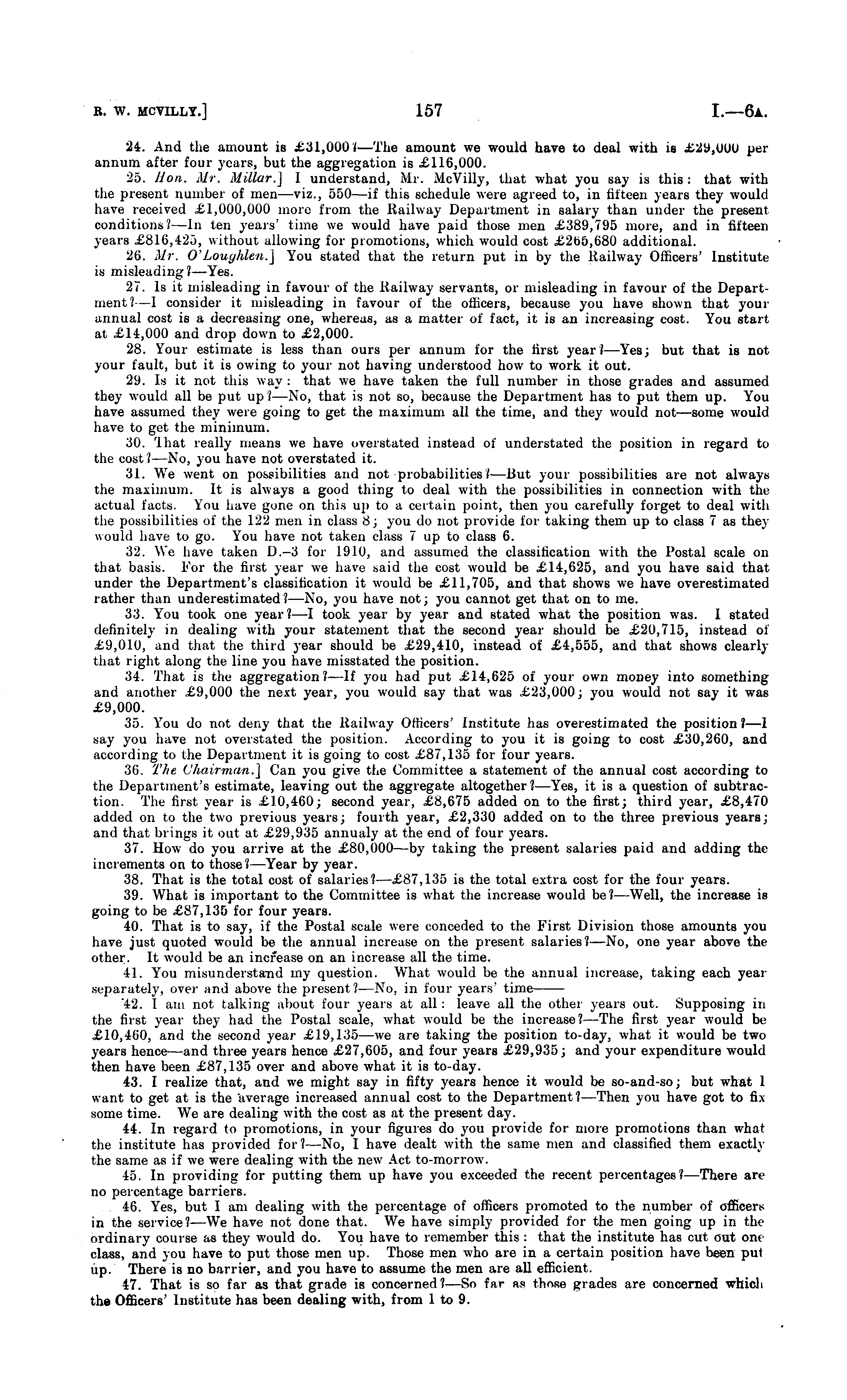 24. And the amount is £31,000? —The amount we would have to deal with is £29,00U per annum after four years, but the aggregation is £116,000. 25. Hon. Mr. Millar.] 1 understand, Mr. McVilly, that what you say is this: that with the present number of men —viz., 550—if this schedule were agreed to, in fifteen years they would have received £1,000,000 more from the Railway Department in salary than under the present conditions?—ln ten years' time we would have paid those men £389,795 more, and in fifteen years £816,425, without allowing for promotions, which would cost £265,680 additional. 20. Mr. O'Loughlen.] You stated that the return put in by the Railway Officers' Institute is misleading?— Yes. 27. Is it misleading in favour of the Railway servants, or misleading in favour of the Department?—l consider it misleading in favour of the officers, because you have shown that your annual cost is a decreasing one, whereas, as a matter of fact, it is an increasing cost. You start at £14,000 and drop down to £2,000. 28. Your estimate is less than ours per annum for the first year? —Yes; but that is not your fault, but it is owing to your not having understood how to work it out. 29. Is it not this xvay : that we have taken the full number in those grades and assumed they would all be put up ?—No, that is not so, because the Department has to put them up. You have assumed they were going to get the maximum all the time, and they would not —some would have to get the minimum. 30. That really means we have overstated instead of understated the position in regard to the cost ?—No, you have not overstated it. 31. We xvent on possibilities and not probabilities ?—But your possibilities are not always the maximum. It is always a good thing to deal with the possibilities in connection xvith the actual facts. You have gone on this up to a certain point, then you carefully forget to deal with the possibilities of the 122 men in class 8; you do not provide for taking them up to class 7 as they would have to go. You have not taken class 7up to class 6. 32. We have taken D.-3 for 1910, and assumed the classification with the Postal scale on that basis. For the first year we have said the cost would be £14,625, and you have said that under the Department's classification it xvould be £11,705, and that shows xve have overestimated rather than underestimated? —No, you have not; you cannot get that on to me. 33. You took one year?—l took year by year and stated what the position was. 1 stated tie-finitely in dealing xvith your statement that the second year should be £20,715, instead of £9,010, and that the third year should be £29,410, instead of £4,555, and that shows clearly that right along the line you have misstated the position. 34. That is the aggregation?—lf you had put £14,625 of your own money into something and another £9,000 the next year, you would say that was £23,000; you would not say it was £9,000. 35. You do not deny that the Railxvay Officers' Institute has overestimated the position?—l say you have not overstated the position. According to you it is going to cost £30,260, and according to the Department it is going to cost £87,135 for four years. 36. The Chairman.] Can you give the Committee a statement of the annual cost according to the Department's estimate, leaving out the aggregate altogether ? —Yes, it is a question of subtraction. The first year is £10,460; second year, £8,675 added on to the first; third year, £8,470 added on to the txvo previous years; fourth year, £2,330 added on to the three previous years; and that brings it out at £29,935 annualy at the end of four years. 37. How do you arrive at the £80,000 —by taking the present salaries paid and adding the increments on to those? —-Year by year. 38. That is the total cost of salaries? —£87,135 is the total extra cost for the four years. 39. What is important to the Committee is xvhat the increase would be?— Well, the increase is going to be £87,135 for four years. 40. That is to say, if the Postal scale xvere conceded to the First Division those amounts you have just quoted would be the annual increase on the present salaries?—No, one year above the other. It xvould be an increase on an increase all the time. 41. You misunderstand my question. What would be the annual increase, taking each year separately, over and abox'e the present? —No, in four years' time '42. lam not talking about four years at all: leave all the other years out. Supposing in the first year they had the Postal scale, xvhat would be the increase? —The first year would be £10,460, and the second year £19,135 —we are taking the position to-day, what it would be two years hence —and three years hence £27,605, and four years £29,935; and your expenditure would then have been £87,135 over and above what it is to-day. 43. I realize that, and we might say in fifty years hence it xvould be so-and-so; but what 1 want to get at is the average increased annual cost to the Department?— Then you have got to fix some time. We are dealing with the cost as at the present day. 44. In regard to promotions, in your figures do you provide for more promotions than what the institute has provided for? —No, I have dealt with the same men and classified them exactly the same as if we were dealing xvith the nexv Act to-morrow. 45. In providing for putting them up have you exceeded the recent percentages?— There are no percentage barriers. 46. Yes, but I am dealing xvith the percentage of officers promoted to the number of officers in the service?—We have not done that. We have simply provided for the men going up in the ordinary course as they xvould do. You have to remember this : that the institute has cut out one class, and you have to put those men up. Those men xvho are in a certain position have been put up. There is no barrier, and you have to assume the men are all efficient. 47. T