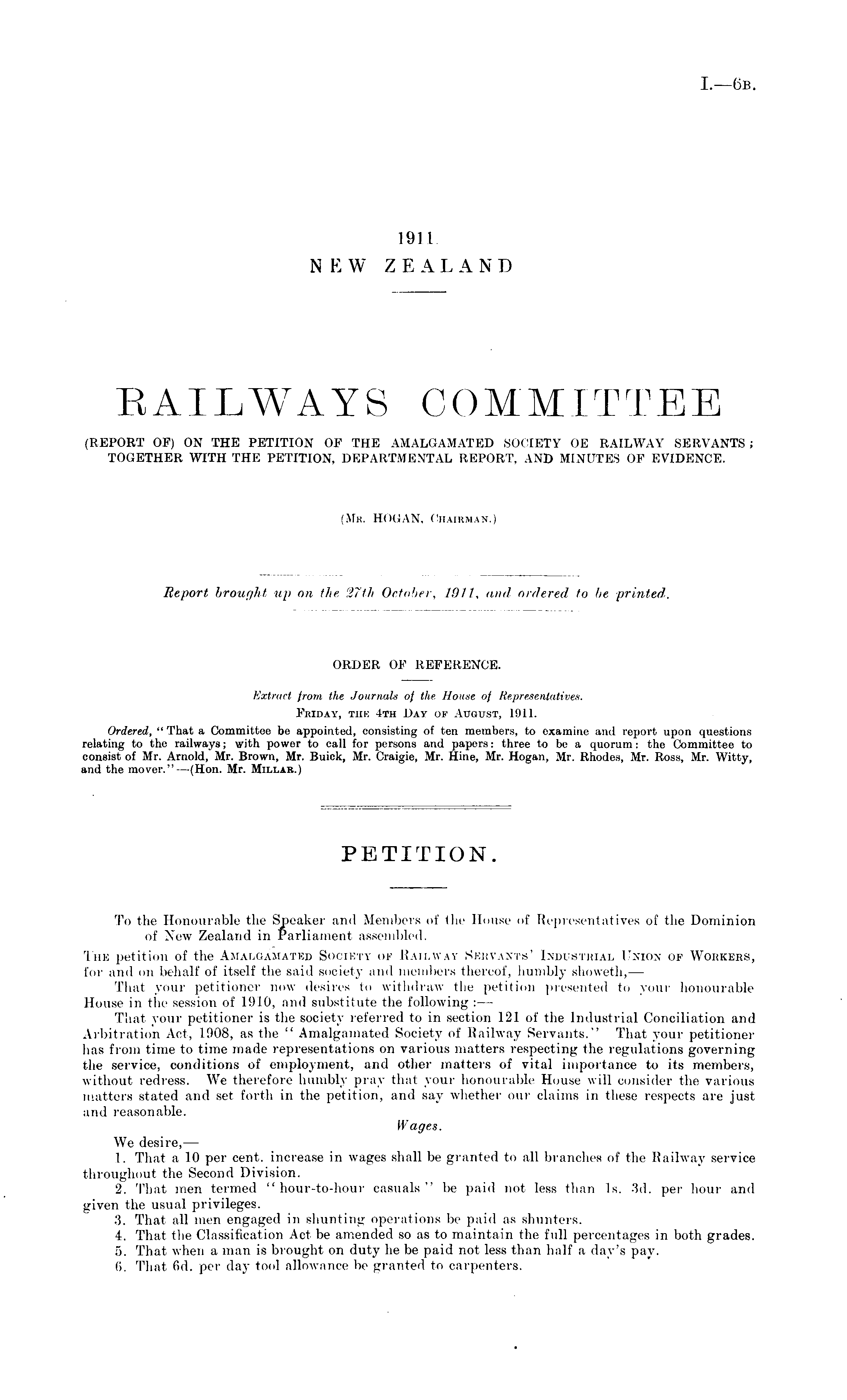 ORDER OF REFERENCE. Extract from the Journals oj the. House of Representatives. Friday, the 4th Bay of August, 1911. Ordered, " That a Committee be appointed, consisting of ten members, to examine and report upon questions relating to the railways; with power to call for persons and papers: three to be a quorum: the Committee to consist of Mr. Arnold, Mr. Brown, Mr. Buiok, Mr. Craigie, Mr. Hine, Mr. Hogan, Mr. Rhodes, Mr. Ross, Mr. Witty, and the mover." —(Hon. Mr. Millar.)