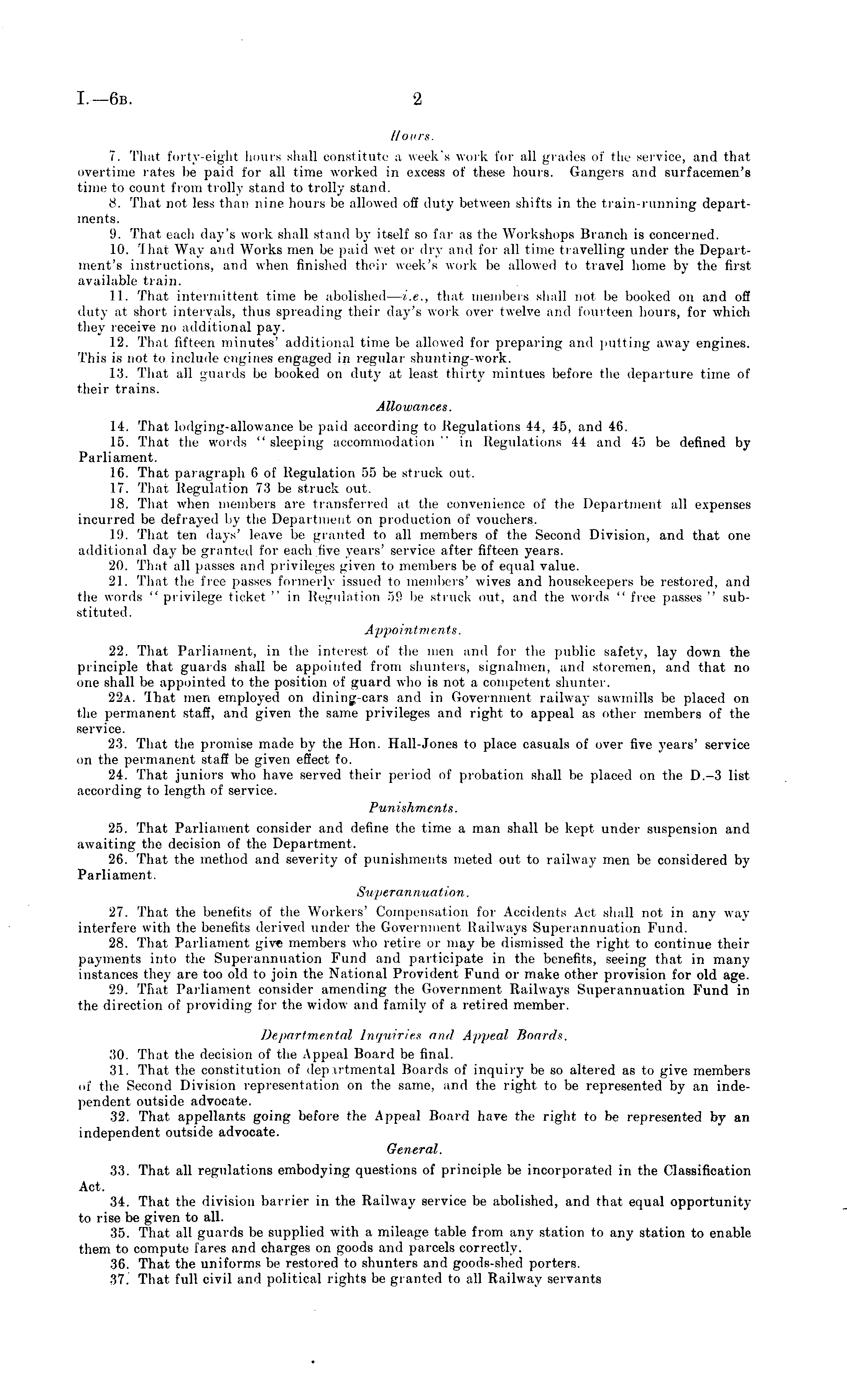 Hours. 7. That forty-eight hours shall constitute a week's work for all grades of the service, and that overtime rates be paid for all time worked in excess of these hours. Gangers and surfacemen's time to count from trolly stand to trolly stand. 8. That not less than nine hours be allowed off duty between shifts in the train-running departments. 9. That eacli day's work shall stand by itself so far as the Workshops Branch is concerned. 10. '\ hat Way and Works men be paid wet or dry and for all time travelling under the Department's instructions, and when finished thoir week's work be allowed to travel home by the first available train. 11. That intermittent time be abolished— i.e., that members shall not be booked on and off duty at short intervals, thus spreading their day's work over twelve and fourteen hours, for which they receive no additional pay. 12. That fifteen minutes' additional time be allowed for preparing and putting away engines. This is not to include engines engaged in regular shunting-work. 13. That all guards be booked on duty at least thirty mintues before the departure time of their trains. Allowances. 14. That lodging-allowance be paid according to Regulations 44, 45, and 46. 15. That the words "sleeping accommodation" in Regulations 44 and 45 be defined by Parliament. 16. That paragraph (i of Regulation 55 be struck out. 17. That Regulation 73 be struck out. 18. That when members are transferred at the convenience of the Department all expenses incurred be defrayed by the Department on production of vouchers. 19. That ten days' leave be granted to all members of the Second Division, and that one additional day be granted for each five years' service after fifteen years. 20. That all passes and privileges given to members be of equal value. 21. That the free passes formerly issued to members' wives and housekeepers be restored, and the words " privilege ticket " in Regulation 50 be struck out, and the words " free passes " substituted. Appointments. 22. That Parliament, in the interest of the men and for the public safety, lay down the principle that guards shall be appointed from shunters, signalmen, and storemen, and that no one shall be appointed to the position of guard who is not a competent shunter. 22a. That men employed on dining-cars and in Government railway sawmills be placed on the permanent staff, and given the same privileges and right to appeal as other members of the service. 23. That the promise made by the Hon. Hall-Jones to place casuals of over five years' service on the permanent staff be given effect fo. 24. That juniors who have served their period of probation shall be placed on the D.-3 list according to length of service. Punishments. 25. That Parliament consider and define the time a man shall be kept under suspension and awaiting the decision of the Department. 26. That the method and severity of punishments meted out to railway men be considered by Parliament. Superannuation. 27. That the benefits of the Workers' Compensation for Accidents Act shall not in any way interfere with the benefits derived under the Government Railways Superannuation Fund. 28. That Parliament give members who retire or may be dismissed the right to continue their payments into the Superannuation Fund and participate in the benefits, seeing that in many instances they are too old to join the National Provident Fund or make other provision for old age. 29. That Parliament consider amending the Government Railways Superannuation Fund in the direction of providing for the widow and family of a retired member. l)i purtmental Inquiries and Appeal Boards. 30. That the decision of the Appeal Board be final. 31. That the constitution of depxrtmental Boards of inquiry be so altered as to give members of the Second Division representation on the same, and the right to be represented by an independent outside advocate. 32. That appellants going before the Appeal Board have the right to be represented by an independent outside advocate. General. 33. That all regulations embodying questions of principle be incorporated in the Classification Act. 34. That the division barrier in the Railway service be abolished, and that equal opportunity to rise be given to all. 35. That all guards be supplied with a mileage table from any station to any station to enable them to compute lares and charges on goods and parcels correctly. 36. That the uniforms be restored to shunters and goods-shed porters. 37. That full civil and political rights be granted to all Railway servants