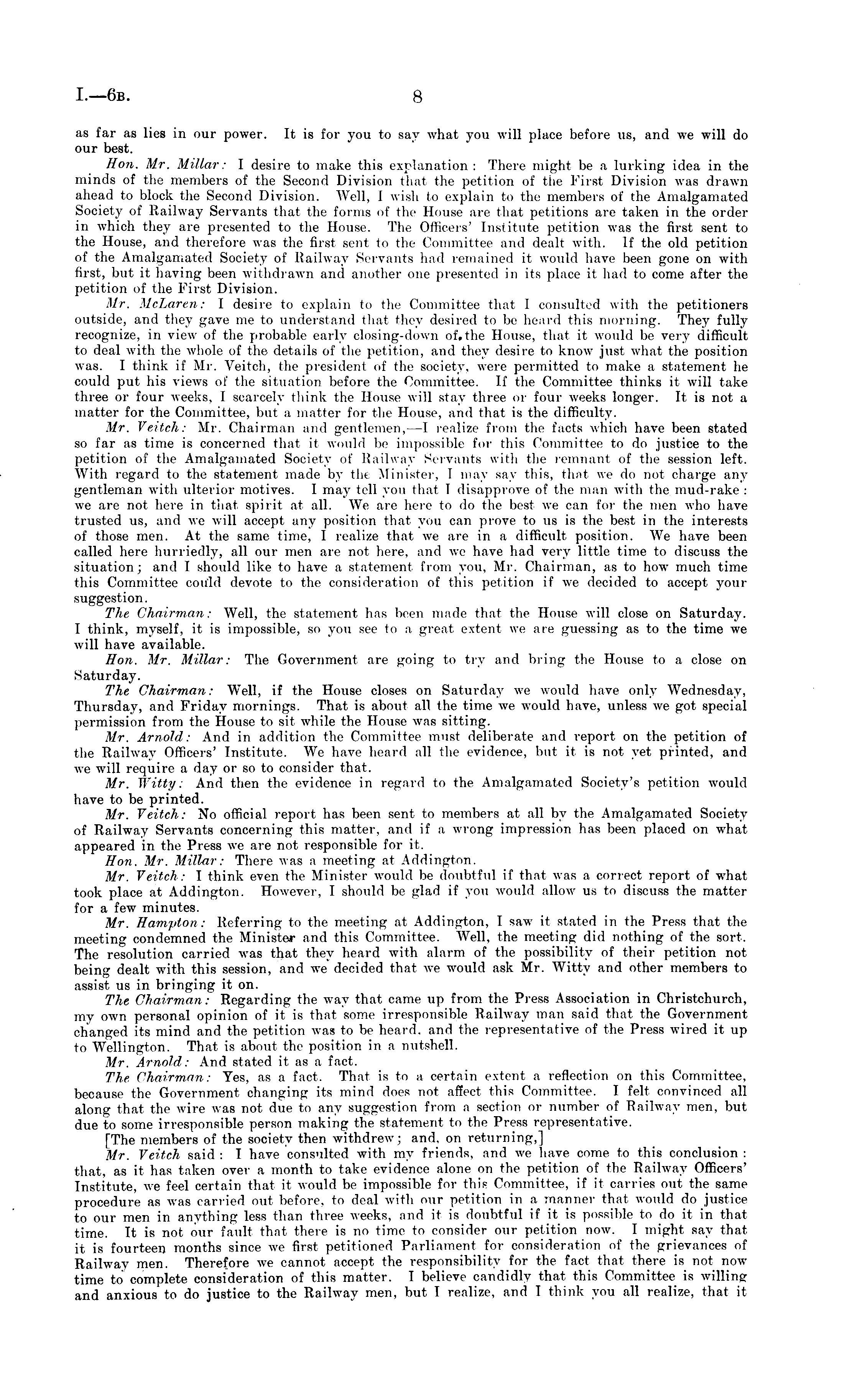 as far as lies in our power. It is for you to say what you will place before us, and we will do our best. Hon. Mr. Millar: I desire to make this explanation : There might be a lurking idea in the minds of the members of the Second Division that the petition of the First Division was drawn ahead to block the Second Division. Well, I wish to explain to the members of the Amalgamated Society of Railway Servants that the forms of the House are that petitions are taken in the order in which they are presented to the House. The Officers' Institute petition was the first sent to the House, and therefore was the first sent to the Committee and dealt with. If the old petition of the Amalgamated Society of Railway Servants had remained it would have been gone on with first, but it having been withdrawn and another one presented in its place it had to come after the petition of the First Division. Mr. McLaren: I desire to explain to the Committee that I consulted with the petitioners outside, and they gave me to understand that they desired to be heard this morning. They fully recognize, in view of the probable early closing-down of, the House, that it would be very difficult to deal with the whole of the details of the petition, and they desire to know just what the position was. I think if Mr. Veitch, the president of the society, were permitted to make a statement he could put his views of the situation before the Committee. If the Committee thinks it will take three or four weeks, I scarcely think the House will stay three or four weeks longer. It is not a matter for the Committee, but a matter for the House, and that is the difficulty. Mr. Veitch: Mr. Chairman and gentlemen,—l realize from the facts which have been stated so far as time is concerned that it would be impossible for this Committee to do justice to the petition of the Amalgamated Society of Railway Servants with the remnant of the session left. With regard to the statement made by the Minister, I may say this, that we do not charge any gentleman with ulterior motives. I may tell you that I disapprove of the man with the mud-rake : we are not here in that spirit at all. We are here to do the best we can for the men who have trusted us, and we will accept any position that you can prove to us is the best in the interests of those men. At the same time, I realize that we are in a difficult position. We have been called here hurriedly, all our men are not here, and we have had very little time to discuss the situation; and I should like to have a statement from you, Mr. Chairman, as to how much time this Committee could devote to the consideration of this petition if we decided to accept your suggestion. The Chairman: Well, the statement has been made that the House will close on Saturday. I think, myself, it is impossible, so you see to a great extent we are guessing as to the time we will have available. Hon. Mr. Millar: The Government are going to try and bring the House to a close on Saturday. The Chairman: Well, if the House closes on Saturday we would have only Wednesday, Thursday, and Friday mornings. That is about all the time we would have, unless we got special permission from the House to sit while the House was sitting. Mr. Arnold: And in addition the Committee must deliberate and report on the petition of the Railway Officers' Institute. We have heard all the evidence, but it is not yet printed, and we will require a day or so to consider that. Mr. Witty: And then the evidence in regard to the Amalgamated Society's petition would have to be printed. Mr. Veitch: No official report has been sent to members at all by the Amalgamated Society of Railway Servants concerning this matter, and if a wrong impression has been placed on what appeared in the Press we are not responsible for it. Hon. Mr. Millar: There was a meeting at Addington. Mr. Veitch: I think even the Minister would be doubtful if that was a correct report of what took place at Addington. However, I should be glad if you would allow us to discuss the matter for a few minutes. Mr. Hampton: Referring to the meeting at Addington, I saw it stated in the Press that the meeting condemned the Minister and this Committee. Well, the meeting did nothing of the sort. The resolution carried was that they heard with alarm of the possibility of their petition not being dealt with this session, and we decided that we would ask Mr. Witty and other members to assist us in bringing it on. The Chairman: Regarding the way that came up from the Press Association in Christchurch, my own personal opinion of it is that some irresponsible Railway man said that the Government changed its mind and the petition was to be heard, and the representative of the Press wired it up to Wellington. That is about the position in a nutshell. Mr. Arnold: And stated it as a fact. The Chairman: Yes, as a fact. That is to a certain extent a reflection on this Committee, because the Government changing its mind does not affect this Committee. I felt convinced all along that the wire was not due to any suggestion from a section or number of Railway men, but due to some irresponsible person making the statement to the Press representative. [The members of the society then withdrew; and. on returning,] Mr. Veitch said : I have consulted with my friends, and we have come to this conclusion : that, as it has taken over a month to take evidence alone on the petition of the Railway Officers' Institute, we feel certain that it would be impossible for this Committee, if it carries out the same procedure as was carried out before, to deal with our petition in a manner that would do justice to our men in anything less than three weeks, and it is doubtful if it is possible to do it in that time. It is not our fault that there is no time to consider our petition now. I might say that it is fourteen months since we first petitioned Parliament for consideration of the grievances of Railway men. Therefore we cannot acc