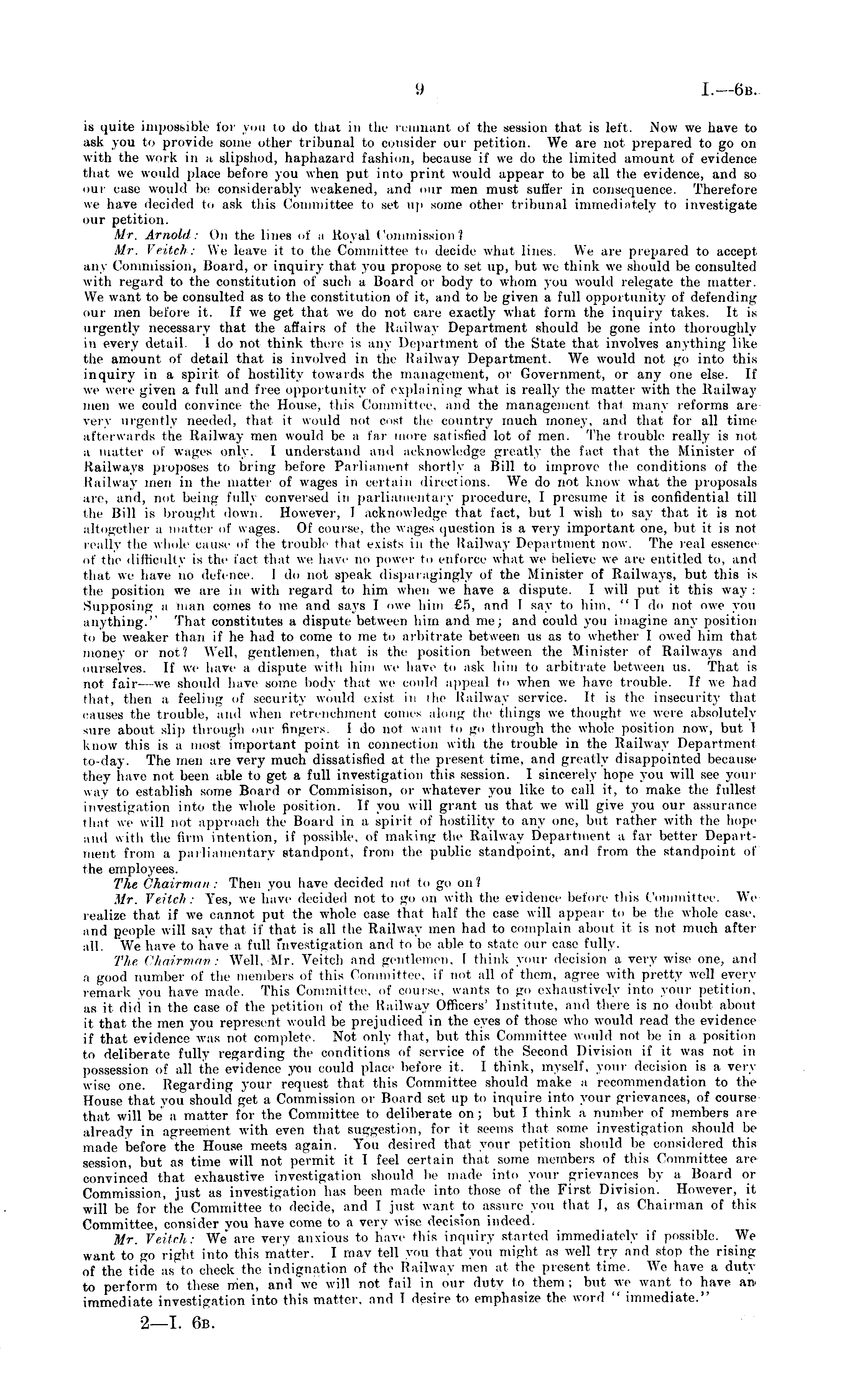 is quite impossible for you io do tii.it in the remnant of the session that is left. Now we have to ask you to provide some other tribunal to consider our petition. We are not prepared to go on with the work in a slipshod, haphazard fashion, because if we do the limited amount of evidence thai we would place before you when put into print would appear to be all the evidence, and so our case would be considerably weakened, and our men must suffer in consequence. Therefore we have decided to ask this Committee to set up some other tribunal immediately to investigate our petition. Mr. Arnold: On the lines of a Royal Commission 1 Mr. Veiteh : We leave it to the Committee to decide what lines. We are prepared to accept any Commission, Board, or inquiry that you propose to set up, but we think we should be consulted with regard to the constitution of such a Board or body to whom you would relegate the matter. We want to be consulted as to the constitution of it, and to be given a full opportunity of defending our men before it. If we get that we do not care exactly what form the inquiry takes. It is urgently necessary that the affairs of the Railway Department should be gone into thoroughly in every detail. 1 do not think there is any Department of the State that involves anything like the amount of detail that is involved in the Railway Department. We would not go into this inquiry in a spirit of hostility towards the management, or Government, or any one else. If we were given a full and free opportunity of explaining what is really the matter with the Railway men we could convince the House, this Committee, and the management that many reforms are very urgently needed, that it would not cost the country much money, and that for all time afterwards the Railway men would be a far more satisfied lot of men. The trouble really is not a mailer of wages only. I understand and acknowledge greatly the fact that the Minister of Railways proposes to bring before Parliament shortly a Bill to improve tlio conditions of the Railway men in the matter of wages in certain directions. We do not know what the proposals arc, and, not being fully conversed in parliamentary procedure, I presume it is confidential till the Bill is brought down. However, f acknowledge that fact, but 1 wish to say that it is not altogether a matter of wages. Of course, the wages question is a very important one, but it is not really the whole cause of the trouble that exists in the Railway Department now. The real essence of the difficulty is the i'act thai we have m> power to enforce what we believe we arc entitled to, and that we have no defence. I do not speak disparagingly of the Minister of Railways, but this is the position we are in with regard to him when we have a dispute. I will put it this way : Supposing a man comes to me and says I owe him £5, and I say to him, " 1 do not owe you anything.'" That constitutes a dispute between him and me; and could you imagine any position to be weaker than if he had to come to me to arbitrate between us as to whether I owed him that money or not? Well, gentlemen, that is the position between the Minister of Railways and ourselves. If we have a dispute with him we have to ask him to arbitrate between us. That is not fair —we should have some body that we could appeal to when we have trouble. If we had (hat, then a feeling of security would exist In the Railway service. It is the insecurity that causes the trouble, and when retrenchment comes along the tilings we thought we were absolutely sure about slip through our fingers. I do not want to go through the whole position now, but I know this is a most important point in connection with the trouble in the Railway Department to-day. The men are very much dissatisfied at the present time, and greatly disappointed because they have not been able to get a full investigation this session. I sincerely hope you will see your way to establish some Board or Commisison, or whatever you like to call it, to make the fullest investigation into the whole position. If you will grant us that we will give you our assurance that we will not approach the Board in a spirit of hostility to any one, but rather with the hope and with the firm intention, if possible, of making the Railway Department a far better Department from a parliamentary standpont, from the public standpoint, and from the standpoint of the employees. The Chairman : Then you have decided not to go on? Mr. Vt itrlt: Yes, we have decided not to go <>n with the evidence before this Committee. We realize that if we cannot put the whole case that half the case will appear to be the whole case. and people will say that if that is all the Railway men had to complain about it is not much after all. We have to have a full investigation and to be able to state our case fully. The Chairman : Well, Mr. Veiteh and gentlemen, I think your decision a very wise one, and a good number of the members of this Committee, if not all of them, agree with pretty well every remark you have made. This Committee, of course, wants to go exhaustively into your petition, as it did in the case of the petition of the Railway Officers' Institute, and there is no doubt about it that the men you represent would be prejudiced in the eyes of those who would read the evident if that evidence was not complete. Not only that, but this Committee would not be in a position t<, deliberate fully regarding the conditions of service of the Second Division if it was not in possession of all the evidence you could place before it. I think, myself, your decision is a very wise one. Regarding your request that this Committee should make a recommendation to the House that you should get a Commission or Board set up to inquire into your grievances, of course that will be a matter for the Committee to deliberate on; but I think a number of members are already in agreement with even that suggestion, for it seems that some investigation sh