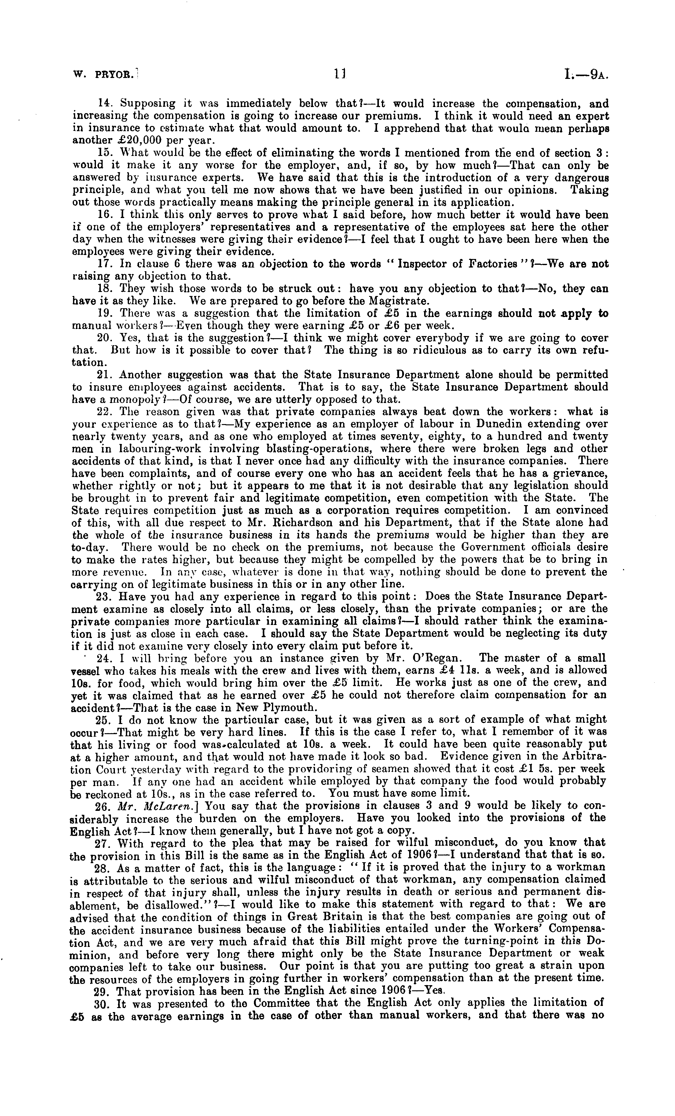 14. Supposing it was immediately below that?—lt would increase the compensation, and increasing the compensation is going to increase our premiums. I think it would need an expert in insurance to estimate what that would amount to. I apprehend that that woula mean perhaps another £20,000 per year. 15. What would be the effect of eliminating the words I mentioned from the end of section 3 : would it make it any worse for the employer, and, if so, by how much? —That can only be answered by insurance experts. We have said that this is the introduction of a very dangerous principle, and what you tell me now shows that we have been justified in our opinions. Taking out those words practically means making the principle general in its application. 16. I think this only serves to prove what I said before, how much better it would have been if one of the employers' representatives and a representative of the employees sat here the other day when the witnesses were giving thair evidence? —I feel that I ought to have been here when the employees were giving their evidence. 17. In clause 6 there was an objection to the words " Inspector of Factories "? —We are not raising any objection to that. 18. They wish those words to be struck out: have you any objection to that?—No, they can have it as they like. We are prepared to go before the Magistrate. 19. There was a suggestion that the limitation of £5 in the earnings should not -apply to manual workers? —Even though they were earning £5 or £6 per week. 20. Yes, that is the suggestion?—l think we might cover everybody if we are going to cover that. But how is it possible to cover that? The thing is so ridiculous as to carry its own refutation. 21. Another suggestion was that the State Insurance Department alone should be permitted to insure employees against accidents. That is to say, the State Insurance Department should have a monopoly?—Of course, we are utterly opposed to that. 22. The reason given was that private companies always beat down the workers : what is your experience as to that?—My experience as an employer of labour in Dunedin extending over nearly twenty years, and as one who employed at times seventy, eighty, to a hundred and twenty men in labouring-work involving blasting-operations, where there were broken legs and other accidents of that kind, is that I never once had any difficulty with the insurance companies. There have been complaints, and of course every one who has an accident feels that he has a grievance, whether rightly or not; but it appears to me that it is not desirable that any legislation should be brought in to prevent fair and legitimate competition, even competition with the State. The State requires competition just as much as a corporation requires competition. I am convinced of this, with all due respect to Mr. Richardson and his Department, that if the State alone had the whole of the insurance business in its hands the premiums would be higher than they are to-day. There would be no check on the premiums, not because the Government officials desire to make the rates higher, but because they might be compelled by the powers that be to bring in more revenue. In any case, whatever is done in that way, nothing should be done to prevent the carrying on of legitimate business in this or in any other line. 23. Have you had any experience in regard to this point: Does the State Insurance Department examine as closely into all claims, or less closely, than the private companies; or are the private companies more particular in examining all claims? —I should rather think the examination is just as close in each case. I should say the State Department would be neglecting its duty if it did not examine very closely into every claim put before it. 24. I will bring before you an instance given by Mr. O'Regan. The master of a small vessel who takes his meals with the crew and lives with them, earns £4 lis. a week, and is allowed 10s. for food, which would bring him over the £5 limit. He works just as one of the crew, and yet it was claimed that as he earned over £5 he could not therefore claim compensation for an accident? —That is the case in New Plymouth. 25. I do not know the particular case, but it was given as a sort of example of what might occur?— That might be very hard lines. If this is the case I refer to, what I remember of it was that his living or food was-calculated at 10s. a week. It could have been quite reasonably put at a higher amount, and that would not have made it look so bad. Evidence given in the Arbitration Court yesterday with regard to the providoring of seamen showed that it cost £1 ss. per week per man. If any one had an accident while employed by that company the food would probably be reckoned at 10s., as in the case referred to. You must have some limit. 26. Mr. McLaren.] You say that the provisions in clauses 3 and 9 would be likely to considerably increase the burden on the employers. Have you looked into the provisions of the English Act? —I know them generally, but I have not got a copy. 27. With regard to the plea that may be raised for wilful misconduct, do you know that the provision in this Bill is the same as in the English Act of 1906? —I understand that that is so. 28. As a matter of fact, this is the language : " If it is proved that the injury to a workman is attributable to the serious and wilful misconduct of that workman, any compensation claimed in respect of that injury shall, unless the injury results in death or serious and permanent disablement, be disallowed."? —I would like to make this statement with regard to that: We are advised that the condition of things in Great Britain is that the best, companies are going out of the accident insurance business because of the liabilities entailed under the Workers' Compensation Act, and we are very much afraid that this Bill might prove the turning-point in this Dominion, and before very lon