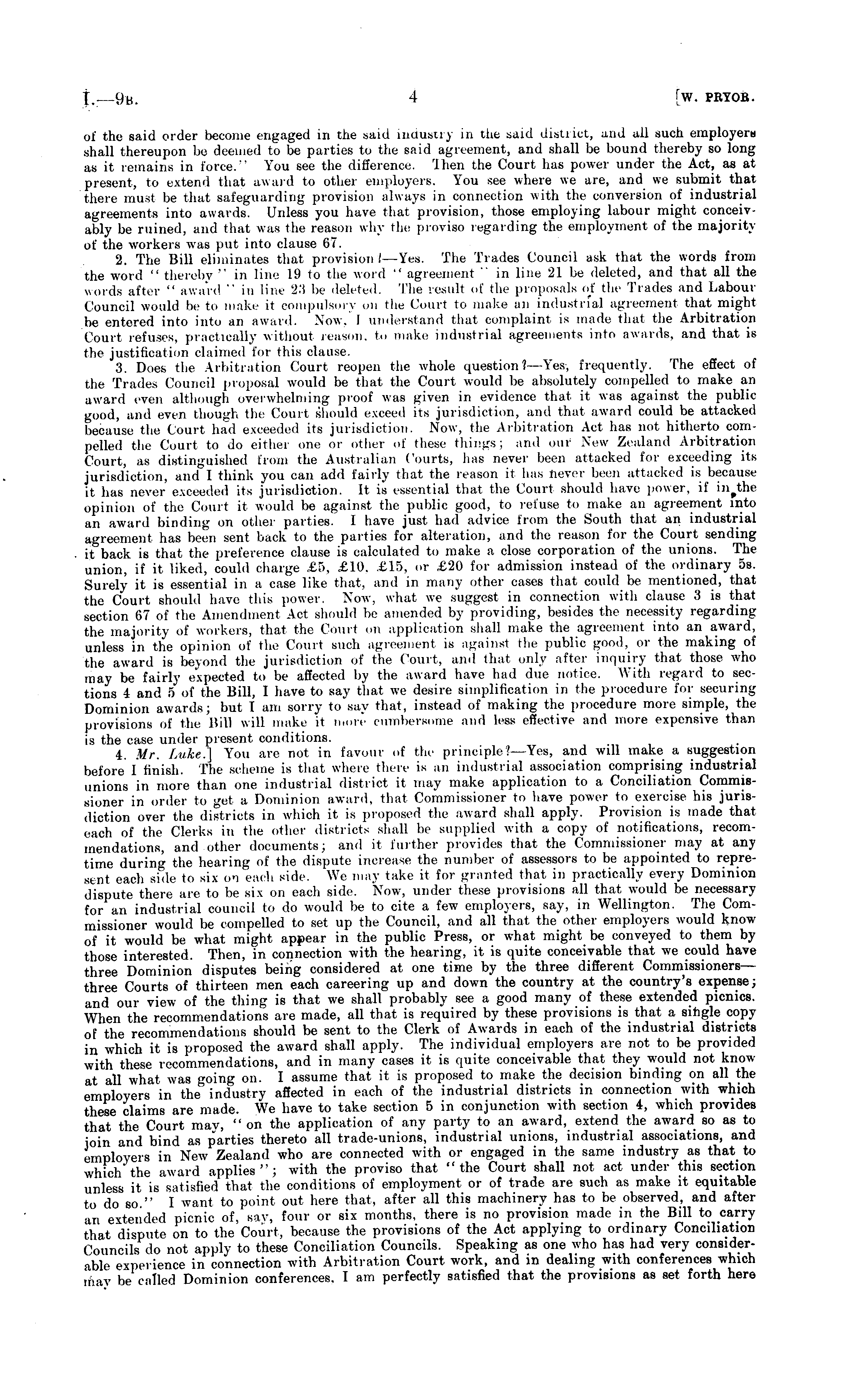 of the said order become engaged in the said industry in the said distiict, and all such employern shall thereupon bu deemed to be parties to the said agreement, and shall be bound thereby so long as it remains in force.'' You see the difference. Ihen the Court has power under the Act, as at present, to extend that award to other employers. You see where we are, and we submit that there must be that safeguarding provision always in connection with the conversion of industrial agreements into awards. Unless you have that provision, those employing labour might conceivably be ruined, and that was the reason why the proviso regarding the employment of the majority of the workers was put into clause 67. 2. The Bill eliminates that provision I —Yes. The Trades Council ask that the words from the word " thereby " in line lit to the word " agreemeni " in line 21 be deleted, and that all the words after " award "in line 2-5 be deleted. The result of the proposals of the Trades and Labour Council would be to make it oompulsory on the Conn to make an industrial agreement that might be entered into into an award. Now. I understand that complaint is made that the Arbitration Court refuses, practically without reason, to make industrial agreements into awards, and that is the justification claimed for this clause. 3. Does the Arbitration Court reopen the whole question? — Yes-, frequently. The effect of the Trades Council proposal would be that the Court would be absolutely compelled to make an award even although overwhelming proof was given in evidence that it was against the public good, and even though tin- Court should exceed its jurisdiction, and that award could be attacked because the ( ouri had exceeded its jurisdiction. Now, the Arbitration Act has not hitherto compelled the Court to do cither one or other of these things; and our New Zealand Arbitration Court, as distinguished from the Australian Courts, has never been attacked for exceeding its jurisdiction, and I think you can add fairly that the reason it has never been attacked is because it lias never exceeded its jurisdiction. It is essential that the Court should have power, if opinion of the Court it would be against the public good, to refuse to make an agreement into an award binding on other parties. I have just hail advice from the South that an industrial agreement has been sent back to the parties for alteration, and the reason lor the Court sending it back is that the preference clause is calculated to make a close corporation of the unions. The union, if it liked, could charge £.">, £10. £15, or £20 for admission instead of the ordinary ss. Surely it is essential in a case like that, and in many other cases that could be mentioned, that the Court should have this power. Now, what we suggest in connection with clause 3 is that section G7 of the Amendment Act should be amended by providing, besides the necessity regarding the majority of workers, that the Court on application shall make the agreement into an award, unless in the opinion of the Court such agreement is agains< the public good, or the making of the award is beyond the jurisdiction of the Court, and that only after inquiry that those who may be fairly expected to be affected by the award have had due notice. With regard to sections 4 and •")' of the Bill, 1 have to say that we desire simplification in the procedure for securing Dominion awards; but 1 am sorry to say that, instead of making the procedure more simple, the provisions of the Bill will make "it more cumbersome and less effective and more expensive than is the case under present conditions. 4. Mr. LukeV] You are not in favour of the principle?— Yes, and will make a suggestion before 1 finish. The scheme is that where there is an indust rial association comprising industrial unions in more than one industrial district it may make application to a Conciliation Commissioner in order to get a Dominion award, that Commissioner to have power to exercise his jurisdiction over the districts in which it is proposed the award shall apply. Provision is made that each of the Clerks in the other districts shall be supplied with a copy of notifications, recommendations, ami other documents; and it further provides that the Commissioner may at any time during the hearing of the dispute increase the number of assessors to be appointed to represent each side to six on each side. We may take it for granted that in practically every Dominion dispute there are to be six on each side. Now, under these provisions all that would be necessary for an industrial council to do would be to cite a few employers, say, in Wellington. The Commissioner would be compelled to set up the Council, and all that the other employers would know of it would be what might appear in the public Press, or what might be conveyed to them by those interested. Then, in connection with the hearing, it is quite conceivable that we could have three Dominion disputes being considered at one time by the three different Commissioners — three Courts of thirteen men each careering up and down the country at the country's expense; and our view of the thing is that we shall probably see a good many of these extended picnics. When the recommendations are made, all that is required by these provisions is that a single copy of the recommendations should be sent to the Clerk of Awards in each of the industrial districts in which it is proposed the award shall apply. The individual employers are not to be provided with these recommendations, and in many cases it is quite conceivable that they would not know at all what was going on. I assume that it is proposed to make the decision binding on all the employers in the industry affected in each of the industrial districts in connection with which these claims are made. We have to take section 5 in conjunction with section 4, which provides that the Court may, " on the application of any party to an award