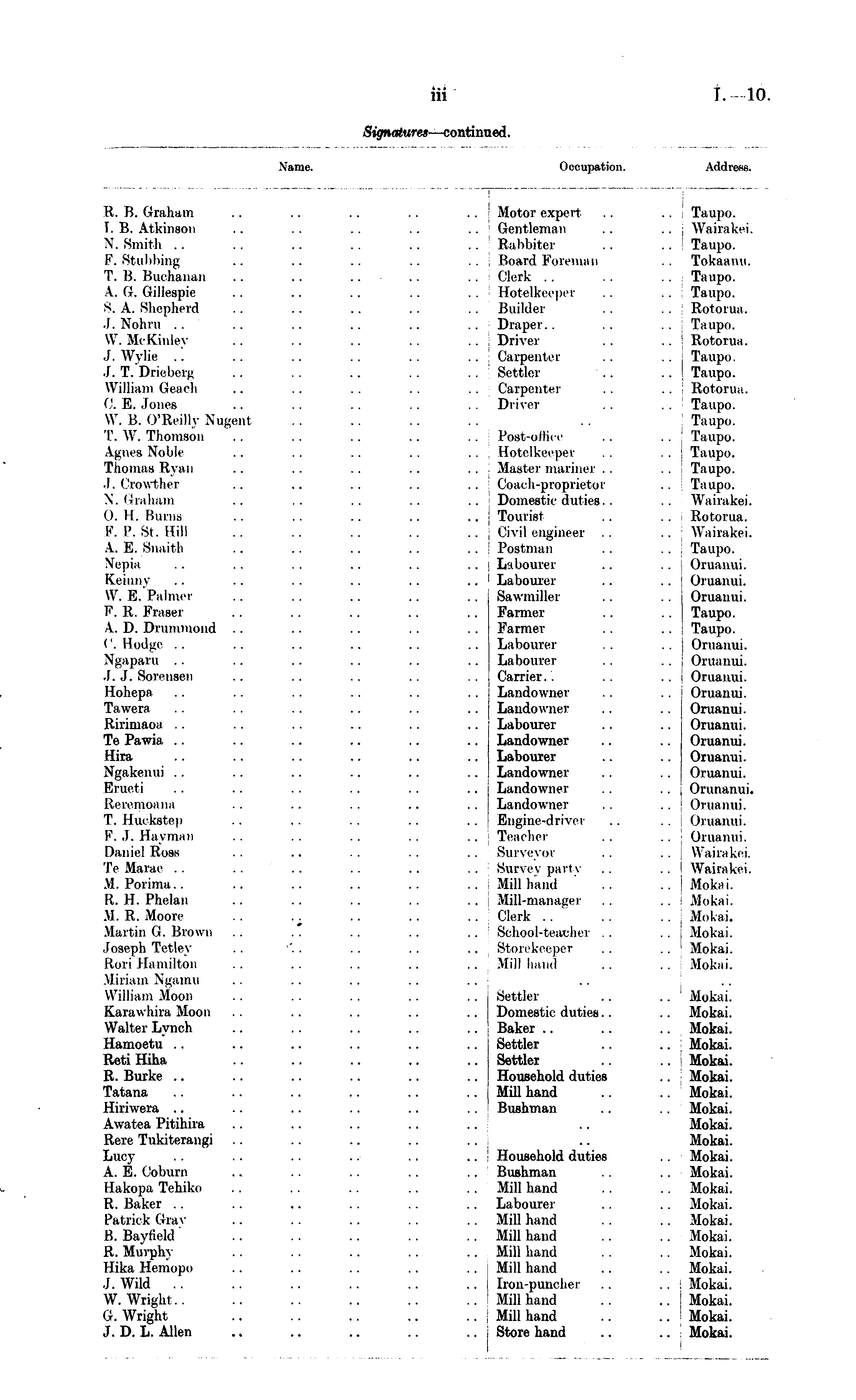 Name. Occupation. Address. ! R. B. Graham I. B. Atkinson \. Smith F. Stubbing T. B. Buchanan A. (■). Gillespie s. A. Shepherd J.Nohru .. W. McKinley .1. Wylie .'. J. T. Drieberg William Geaeh C. E. Jones W. B. O'Reilly Nugent T. W. Thomson Noble Thomas Ryan •I. Crowther X. Graham 0. H. Bums K. I'. St. Hill A. E. Snaitli Nepia Keimiv W. E. Palmer F. R. Fraser A. D. Drummond .. C Hodge .. Ngaparu .. •I. J. Sorenaen Hohepa Tawera Ririmaoa Tβ Pawia .. Hira Ngakeiuii Erueti Reremoana T. Huckstep V. ,1. Eayman Daniel Ross Te Marae .. M. Porima.. R. H. Phelan M. R. Moore .. .. Martin (J. Brown Joseph Tetley Rori Hamilton .Miriam Ngamu William Moon Karawhira Moon Walter Lynch Hainoetu Reti Hiha R. Burke Tatana Hiriwera Awatea Pitihira Rere Tukiterangi Lucy A. E. Coburn llakopa Tehiko R. Baker Patrick Gray B. Bayfield R. Muvpliv Ilika Hcinopti J. Wild VV. Wright G. Wright J. D. L. Allen Motor export .. .. Taupo. Gentleman .. .. Wairakei. Rabbiter .. .. Taupo. Board Foremau .. Tokaanu. .. Clerk .. .. .. Taupo. Hotelkeeper .. .. Taujio. Builder .. . . Rotorua. Draper. . .. . . Taupo. Driver .. .. Rotorua. Carpenter .. . . Taupo. . . Settler . . . . Taupo. Carpenter .. .. Rotorua. Driver .. . . Taupo. Taupo. Poet-office .. . . Taupo. Hotelkeeper . . . . Taupo. Master mariner .. .. Taupo. Coach-proprietor .. Taupo. Domestic duties.. .. Wairakei. .. j Tourist . . . . Rotorua. Civil engineer .. .. Wairakei. Postman .. . . Taupo. Labourer .. .. j Oruanui. .. ' Labourer .. .. Oruanui. Sawmiller .. . . Oruanui. Farmer .. . . Taupo. Farmer .. . . Taupo. Labourer . . .. Oruanui. Labourer .. .. Oruanui. Carrier.. .. .. Oruanui. Landowner .. .. I Oruanui. Landowner .. .. Oruanui. Labourer .. .. Oruanui. Landowner .. .. Oruanui. Labourer .. .. Oruanui. Landowner . . .. Oruanui. Landowner .. .. j Orunanui. Landowner .. .. Oruanui. Engine-driver .. .. Oruanui. Teacher .. .. Oruanui. Surveyor . . . . Wairakei. Survey party .. .. Wairakei. .. Mill hand .. .. Mokai. Mill-manager .. .. Mokai. Clerk . . . . .. .Mokai. School-teacher .. .. Mokai. Storekeeper .. .. Mokai. .. Mill hand .. .. Mokai. .. Settler .. .. Mokai. Domestic duties.. .. Mokai. Baker .. .. .. Mokai. Settler .. .. Mokai. Settler .. .. Mokai. Household duties .. Mokai. Mill hand .. .. Mokai. Bushman .. .. Mokai. Mokai. Mokai. Household duties .. Mokai. Bushman .. .. Mokai. Mill hand . . . . Mokai. Labourer .. .. Mokai. Mill hand . . .. Mokai. Mill hand .. .. Mokai. .. Mill hand .. .. Mokai. .. Mill hand .. .. Mokai. Iron-puuclier . . .. I Mokai. . . Mill hand .. .. Mokai. .. Mill hand .. .. Mokai. Store hand .. .. Mokai.
