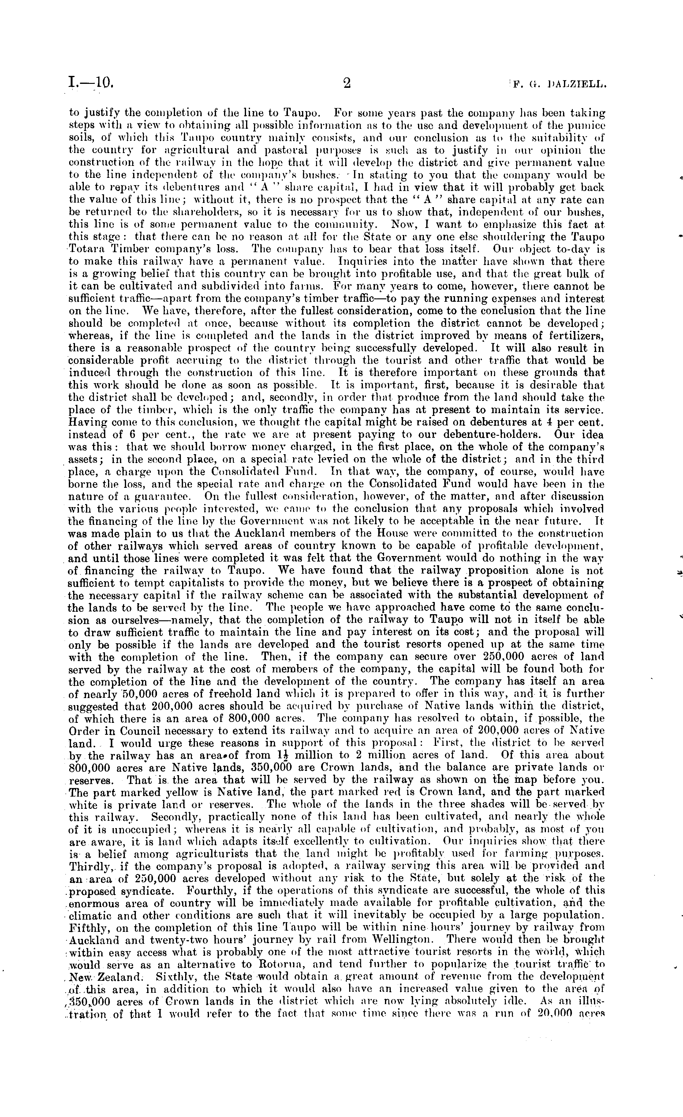 to justify the completion of the line to Taupo. For some years past the company has been taking steps with a view to obtaining all possible information as to the use and development of the pumice soils, of which this Taupo oountry mainly consists, and our conclusion as to the suitability of the country for agricultural and pastoral purposes is euch as to justify in our opinion the construction of the railway in the hope thai it will develop the district and give permanent value to the line independent of the company's hushes. In stating to you that the company would be able to repay its debentures and " .\ " share capital, J hat! in view that it will probably get hack the value of this line ; without it, there is no prospect that the " A " share capital at any rate can be returned to the shareholders, so it is necessary for us to show that, independent of our bushes, this line is of some permanent value to (he community. Now, I want to emphasize this fact at this stage: that there can he no reason at all for the State or any one else shouldering the Taupo Totara Timber company's loss. The company has to bear that loss itself. Our object to-day is to make this railway have a permanent value. Inquiries into the matter have shown that there is a growing belief that tin's country can be brought into profitable use, and that the great bulk of it can be cultivated and subdivided into farms. For many yeffrs to come, however, there cannot be sufficient traffic —apart from the company's timber traffic—to pay the running expenses and interest on the line. We have, therefore, after the fullest consideration, come to the conclusion that the line should be completed at once, because without its completion the district cannot be developed ; whereas, if the line is completed ami the lands in the district improved by means of fertilizers, there is a reasonable prospect of the country being successfully developed. It will also result in considerable profit accruing to the district through the tourist and other traffic that would be induced through the construction of this line. It is therefore important on these grounds that this work should be done as soon as possible. It is important, first, because it is desirable that the district shall be developed; and, secondly, in order thai produce from the land should take the place of the timber, which is the only traffic the company has at present to maintain its service. Having come to this conclusion, we thought the capital might be raised on debentures at i per cent, instead of 6 per cent., the rate we are at present paying to our debenture-holders. Our idea was this : that we should borrow money charged, in the first place, on the whole of the company's assets; in the second place, on a special rate levied on the whole of the district; and in the third place, a charge upon the Consolidated Fund. In that way, the company, of course, would have borne the loss, and the special rate and charge on the Consolidated Fund would have been in the nature of a guarantee. On the fullest consideration, however, of the matter, and after discussion with the various people interested, we came to the conclusion that any proposals which involved the financing of the line by the Government was not likely to lie acceptable in the near future. It was made plain to us that the Auckland members of the House were committed to the construction of other railways which served areas of country known to be capable of profitable development, and until those lines were completed it was felt that the Government would do nothing in the way of financing the railway to Taupo. We have found that the railway proposition alone is not sufficient to tempt capitalists to provide the money, but we believe there is a prospect of obtaining the necessary capital if the railway scheme can be associated with the substantial development of the lands to be served b\ the line. The people we have approached have come to the same conclusion as ourselves —namely, that the completion of the railway to Taupo will not in itself be able to draw sufficient traffic to maintain the line and pay interest on its cost; and the proposal will only be possible if the lands are developed and the tourist resorts opened up at the same time with the completion of the line. Then, if the company can secure over 250,000 acres of land served by the railway at the cost of members of the company, the capital will be found Loth for the completion of the line and the development of the country. The company has itself an area of nearly 50,000 acres of freehold land which it is prepared to otter in this way, and it is further suggested that 200,000 acres should be acquired by purchase of Native lands within the district, of which there is an area of 800,000 acres. The company has resolved to obtain, if possible, the Order in Council necessary to extend its railway and to acquire an area of 200,000 acres of Native land. I would urge these reasons in support of this proposal: First, the district to be served by the railway has an from li million to 2 million acres of land. Of this area about 800,000 acresare Native lands, 350,00(1 are Crown lands, atid the balance are private lands or reserves. That is the area that will be served by the railway as shown on the map before you. The part marked yellow is Native land, the part marked red is Crown land, and the part marked white is private land or reserves. The whole of the lands in the three shades will lie served by this railway. Secondly; practically none of this land has been cultivated, and nearly the whole of it is unoccupied; whereas it is nearly all capable of cultivation, and probably, as most of you are aware, it is land which adapts itsulf excellently to cultivation. Our inquiries show lhat there is a belief among agriculturists that the land might be profitably used for fanning purposes. Thirdly,, if the company's proposal is adopted, a railway serving this area will be pr
