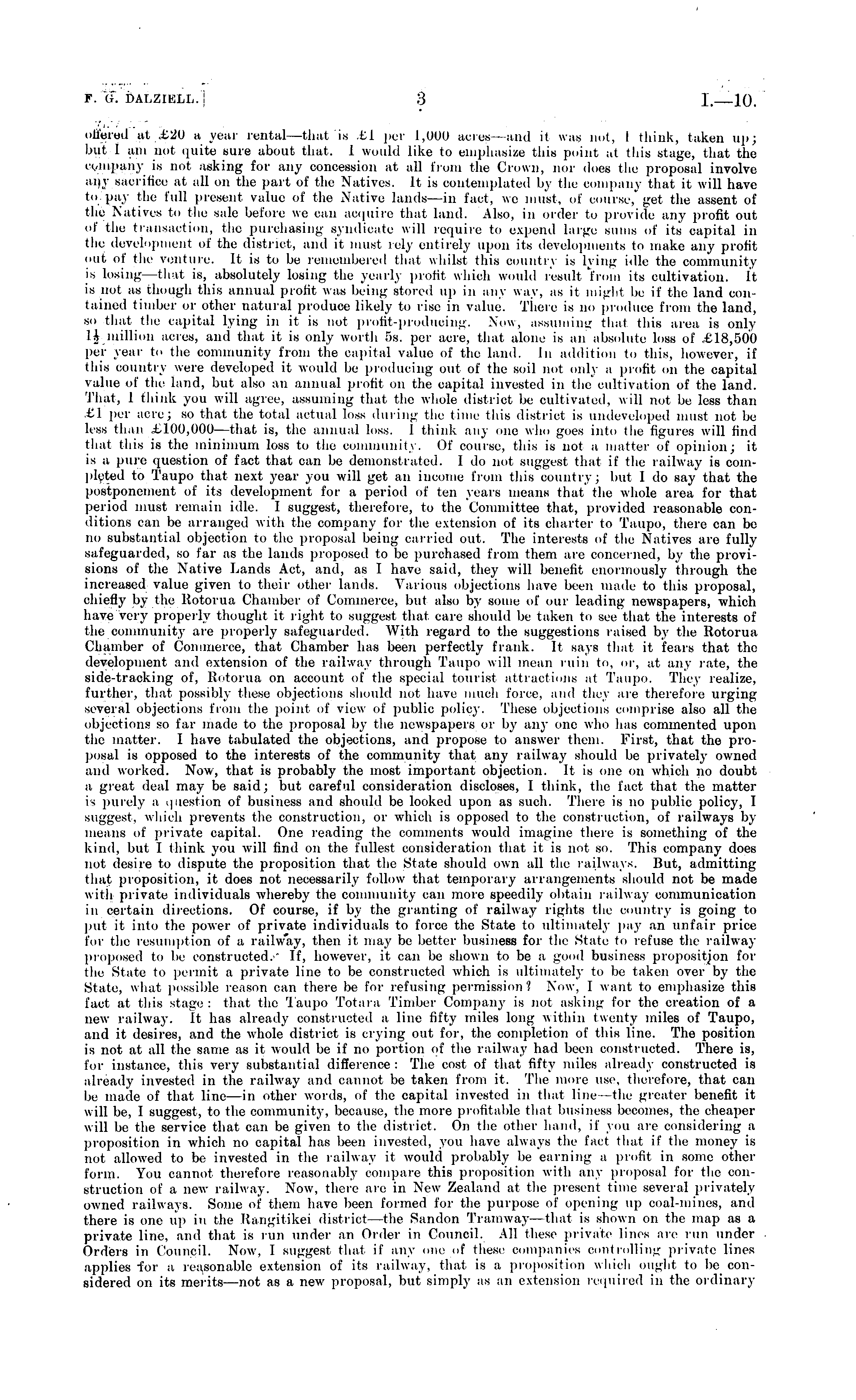 offered at £20 a year rental —that is .£1 per 1,000 acres and it was not, I think, taken up; but lam not quite sure about that. 1 would like to emphasize this point at this stage, that the <■'■nipanv is Qot asking for any concession at all from the Grown, nor does the proposal involve any sacrifice at all on the part of the Natives. It is contemplated by the company that it will have to pay the full present value of the Native lands—in fact, we must, of course, get the assent of the Natives to the sale before we can acquire that land. Also, in order to provide any profit out of the transaction, the purchasing syndicate will require to expend large sums of its capital in the development of the district, and it must rely entirely upon its developments to make any profit out of the venture. It is to be remembered that whilst this country is lying idle the community is losing that is, absolutely losing the yearly profit which would result 'from its cultivation. It is not as though this annual profit was being stored up in any way, as it might be if the land eon tamed timber or other natural produce likely to rise in value. There is no produce from the land, so that the capital lying in it is not profit-producing. Now, assuming that this area is only U million acres, anil that it is only worth "is. per acre, that alone is an absolute loss of £18,500 pel- year to the community from the capital value of the land. In addition to this, however, if this oountry were developed it would be producing out of the soil nol only a profit on the capital value of the land, but also an annual profit on the capital invested in the cultivation of the land. That, 1 think you will agree, assuming that the whole district lie cultivated, will not be less than .£1 per acre; so that the total actual loss during the time this district is undeveloped must not be less than £100,000 —that is, the annual loss. 1 think any one who goes into the figures will find that this is the minimum loss to the community. Of course, this is not a matter of opinion; it is a pure question of fact that can be demonstrated. 1 do not suggest that if the railway is completed to Taupo that next year you will get an income from this oountrj ; but I do say that the postponement of its development for a period of ten years means that the whole area for that period must remain idle. 1 suggest, therefore, to the Committee that, provided reasonable conditions can be arranged with the company for the extension of its charter to Taupo, there can be no substantial objection to the proposal being carried out. The interests of the Natives are fully safeguarded, so far as the lands proposed to be purchased from them are concerned, by the provisions of the Native Lands Act, and, as I have said, they will benefit enormously through the increased value given to their other lands. Various objections have been made to this proposal, chiefly by the Rotorua Chamber of Commerce) but also by some of our leading newspapers, which have very properly thought it right to suggest that care should be taken to see that the interests of the community are properly safeguarded. With regard to the suggestions raised by the Rotorua Chamber of Commerce, that Chamber has been perfectly frank. It says that it fears that the development and extension of the railway through Taupo will mean ruin to, or, at any rate, the side-tracking of, Rotorua on account of the special tourist attractions at Taupo. They realize, further, that possibly these objections should not have much force, ami they are therefore urging several objections from the point of view of public policy. These object ions comprise also all the objections so far made to the proposal by the newspapers or by any one who has commented upon the matter. I have tabulated the objections, and propose to answer them. First, that the proposal is opposed to the interests of the community that any railway should be privately owned and worked. Now, that is probably the most important objection. ]t is one on which no doubt a great deal may be said; but careful consideration discloses, I think, the fact thai the matter is purely a question of business and should be looked upon as such. There is no public policy, I suggest, which prevents the construction, or which is opposed to the construction, of railways bj means of private capital. One reading the comments would imagine there is something of the kind, but I think you will find on the fullest consideration that it is not so. This company does not desire to dispute the proposition that the State should own all the railways. Rut, admitting that proposition, it does not necessarily follow that temporary arrangements should not be made witli private individuals whereby the community can more speedily obtain railway communication in certain directions. Of course, if bj the granting of railway rights the country is going to put it into the power of private individuals to force the State to ultimately pay an unfair price for the resumption of a railway, then it may be better business for the State to refuse the railway proposed to be constructed.-" If, however, it can be shown to be a good business proposition for the State to permit a private line to be constructed which is ultimately to be taken over by the State, what possible reason can there be for refusing permission ? Now, I want to emphasize this fact at this stage: that the Taupo Totara Timber Company is not asking for the creation of a new railway. It lias already constructed a line fifty miles long within twenty miles of Taupo, and it desires, and the whole district is crying out for, the completion of this line. The position is not at all the same as it would be if no portion of the railway had been constructed. There is, for instance, this wvy substantial difference: The cost of that fifty miles already constructed is already invested in the railway and cannot be taken from it. The more use, therefore, tha