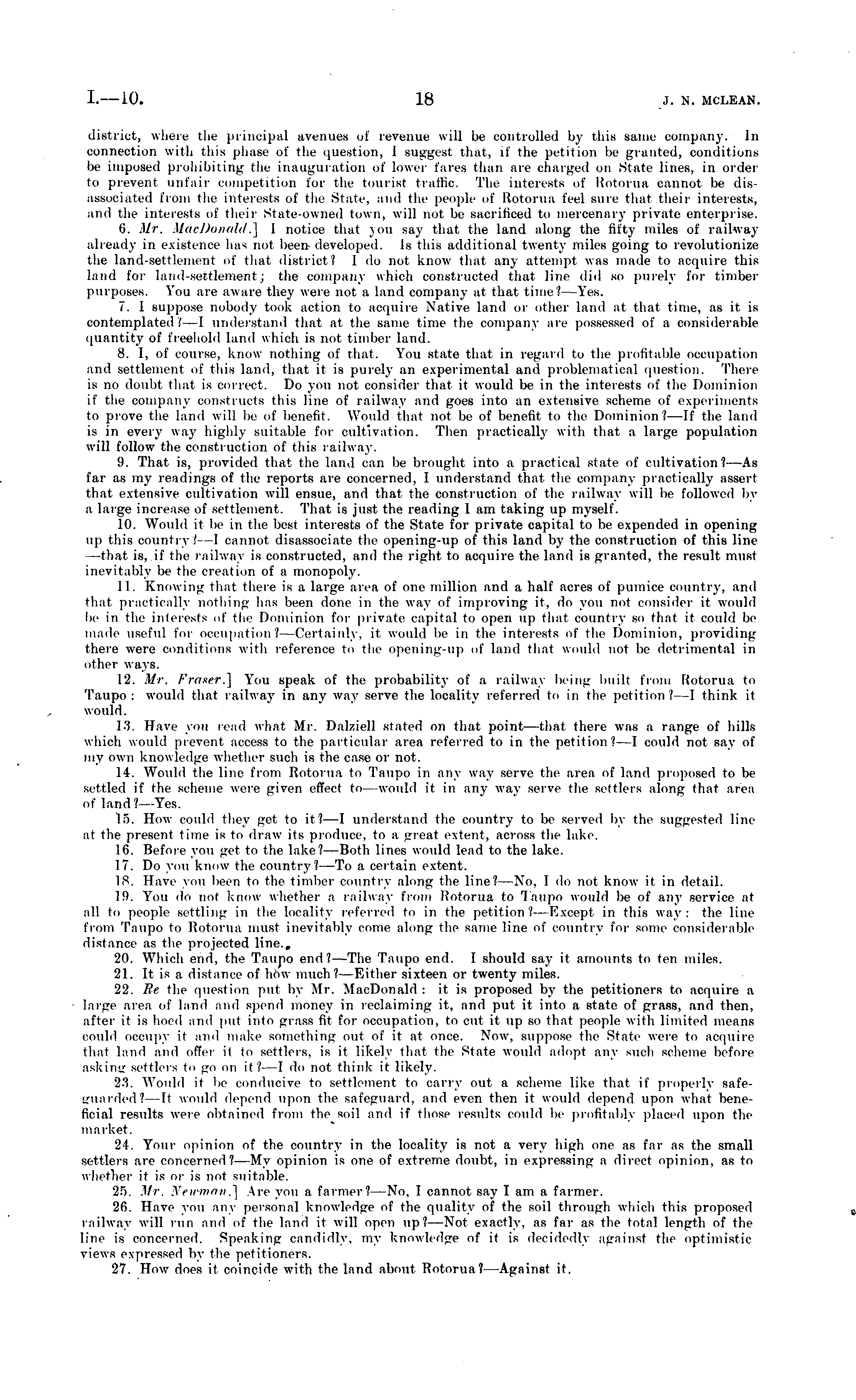 district, where the principal avenues of revenue will be controlled by this same company. In oonneotion with this phase of the question, I suggest that, if the petition be granted, conditions be imposed prohibiting the inauguration of lower fares than arc charged on State lines, in order to prevent unfair competition for the tourist traffic. The interests of Rotorua cannot be disassociated from the interests of the State, and the people of Rotorua feel sure that their interests, and the interests of their State-owned town, will not be sacrificed to mercenary private enterprise. 6. Mr. Macbmiahl . ] 1 notice that you say that the land along the fifty miles of railway already in existence lias not been developed. Is this additional twenty miles going to revolutionize the land-settlement of that district? I do not know that any attempt was made to acquire this land for land-settlement; the company which constructed that line did so purely for timber purposes. You are aware they were not a hind company at that time?— Yes. 7. 1 suppose nobody tool; action to acquire Native land or other land at that time, as it is contemplated/—I understand that at the same time the company are possessed of a considerable quantity of freehold land which is not timber land. 8. I, of course, know nothing of that. You state that in regard to the profitable occupation and settlement of this land, that it is purely an experimental ami problematical question. There is no doubt that is correct. Do you not consider that it would be in the interests of the Dominion if the company const inets this line of railway and goes into an extensive scheme of experiments to prove the land will be of benefit. Would that not be of benefit to the Dominion?—lf the land is in every way highly suitable for cultivation. Then practically with that a large population will follow the construction of this railway. !). That is, provided that the land can be brought into a practical state of cultivation? —As far as my readings of the reports are concerned, I understand that the company practically assert that extensive cultivation will ensue, and that the construction of the railway will lie followed by a large increase of settlement. That is just the reading lam taking up myself. 10. Would it be in the best interests of the State for private capital to be expended in opening up this country .'--I cannot disassociate the opening-tip of this land by the construction of this line —that is, if the railway is constructed, and the right to acquire the land is granted, the result must inevitably be the creation of a monopoly. 11. Knowing thai there is a large area of one million and a half acres of pumice country, anil that practically nothing has been done in the way of improving it, do you not consider it would be in the interests of the Dominion for private capital to open up that country so that it could be made useful for occupation ] — Certainly, it would be in the interests of the Dominion, providing there were conditions with reference to the opening-up of land that would not be detrimental in other ways. 12. Mr. /-'/-(l.xrr.\ You speak of the probability of a railway being built from Rotorua to Taupo : would that railway in any way serve the locality referred to in the petition) — l think it would. 13. Have you read what Mr. Dalziell Stated on that point—that there was a range of hills which would prevent access to the particular area referred to in the petition/- 1 could not say of my own knowledge whether such is the case or not. 14. Would the line from Rotorua to Taupo in any way serve the area of land proposed to be settled if the scheme were given effect to — would it in any way serve the settlers along that area of land? —Yes. 15. How could they gel to it?— l understand the country to be served by the suggested line a! the present time is to draw its produce, to a great extent, across the lake. 16. Before you get to the lake?— Both lines would lead to the lake. 17. Do you know the country?—To a certain extent. IS. Have you been to the timber country along the line?—No, 1 do not know it in detail. 19. You do not know whether a railway from Rotorua to I'aupo would be of any service at all to people settling in the locality referred to in the petition) —Except in this way: the line from Taupo to Kotorua must inevitably come along the same line of country I'm- some considerable distance as the projected line., 20. Which end, the Taupo end?— The I'niipo end. I should say it amounts to ten miles. 21. It is a distance of how much?— Either sixteen or twenty miles. 22. Re the question put by Mr. Mac Donald : it is proposed by the petitioners to acquire a large area of land and spend money in reclaiming it, and put it into a state of jrrass, and then, after it is hoed and put into trrass fit for occupation, to cut it up so that people with limited means could occupy it and make something out of it at once. Now, suppose the State were to acquire that land and offer i( to settlers, is it likely that the State would adopt any such scheme before askinir settlers to go on it?—l do not think it likely. 23. Would it be conducive to settlement to carry out a scheme like that if properly safeguarded?- II woidd depend upon the safeguard, and even then it would depend upon what beneficial results were obtained from the soil and if those results could be profitably placed upon the market. 24. Your opinion of the country in the locality is not a very high one as far as the small settlers are concerned? —My opinion is one of extreme doubt, in expressing a direct opinion, as to whether it is or is not suitable. 25. Mr. Xrinii/ni.\ \re you a farmer?—No, I cannot say lam a farmer. 2fi. Have you any personal knowledge of the quality of the soil through which this proposed railway will run and of the land it will open up? —Not exactly, as far as the total length of the line is concerned. Speaking candidly, my knowledge 