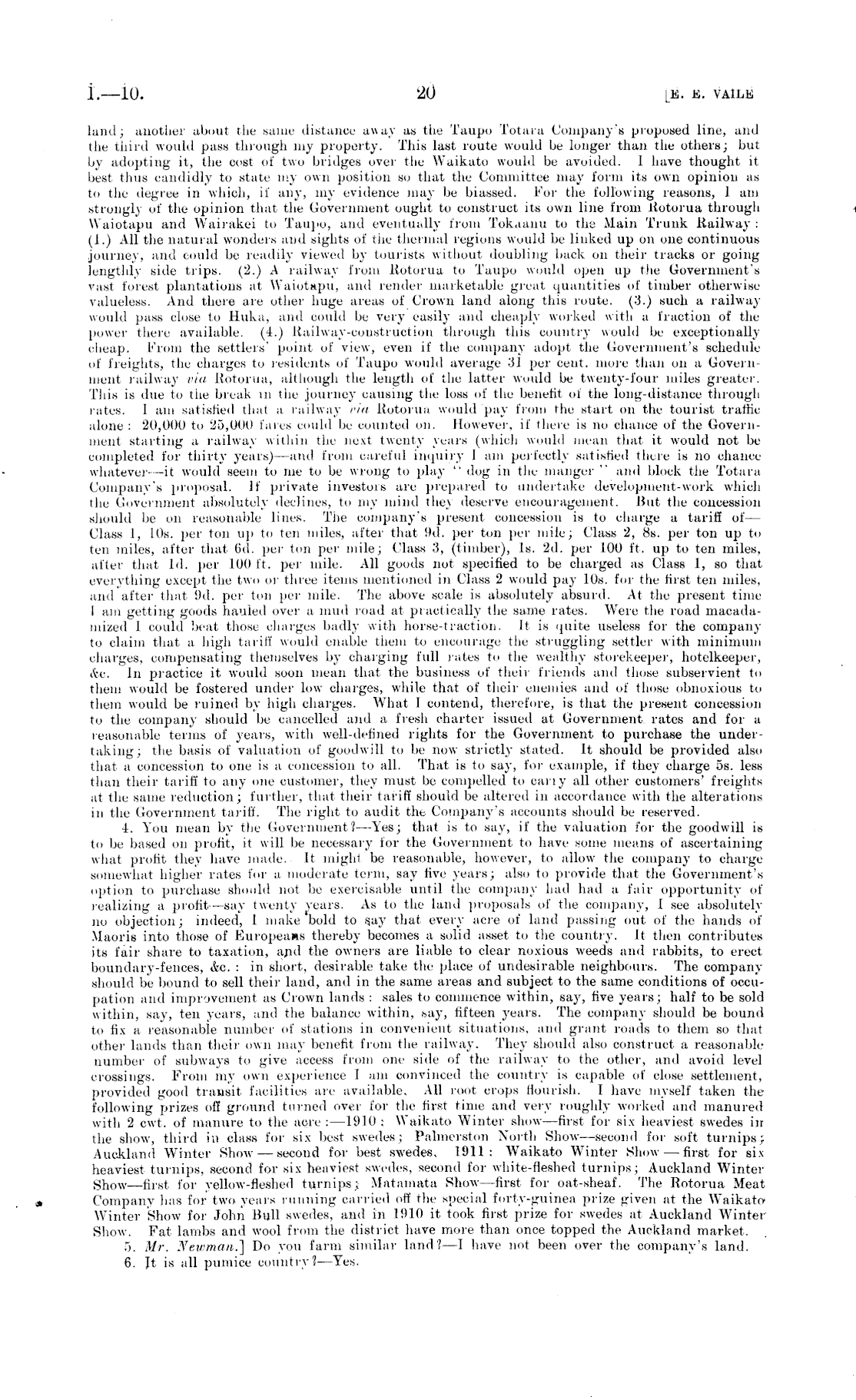 land; another about the same distance away us the Taupo Totara Company's proposed line, and the third would pass through my property. This last route would be longer than the others; but by adopting it, the ooet of two bridges over the Waikato would be avoided. 1 have thought it best thus candidly to stale mj own position so that the Committee may form its own opinion as to the degree in which, if any, my evidence may be biassed. For the following reasons, 1 am strongly of the opinion that the Government ought to construct its own line from J<otoruu through Waiotapu and Wairakei to Taupo, and eventually from Tokaanu to the Main Trunk Railway: (1.) All the natural wonders and sights of the thermal regions would be linked up on one continuous journey, and could be readily viewed b\ - tourists without doubling back on their tracks or going lengthly side trips. (2.) A railway from Rotorua to Taupo would open up the Government's vast finest plantations at Waiotapu, and lender marketable great quantities of timber otherwise valueless. And there are other huge areas of Crown land along this route. (3.) such a railway would pass close to Huka, and could be very easily and cheaply worked with a fraction of the power there available. (4.) Railway-construction through this country would be exceptionally cheap. From the settlers' point of view, even if the company adopt the Government's schedule of freights, the charges to residents of Taupo would average ■! I per cent, more than on a Government railway via Rotorua, although the length of the latter would be twenty-four miles greater. This is due lo tiie break in the journey causing the loss of the benefit c>l the long-distance through rales. I am satisfied that a railway via Rotorus would pay from the start on the tourist traffic alone : 20,(100 in 25,000 lares could be counted on. However, if there is no chance of the Government starting a railway within the next twenty years (which would mean that it would not be completed lor thirty years) -and from careful inquiry 1 am perfectly satisfied there is no chance whatever-—it would seem to me to be wrong to play " dog in the mangel , " and block the Totara Company's proposal. If private investors arc prepared to undertake development-work which the Government absolutely declines, to my mind thej deserve encouragement. But the concession should be on reasonable lines. The company's present concession is to charge a tariff of— Class I, 10s. per toll up to ten miles, after that 9d. per toll per mile; Class 2, per ton up to ten miles, after that (id. per ton per mile; Class :!, (timber), Is. 2d. per 100 ft. up to ten miles, after that Id. per 100 ft. per mile. All goods not specified to be charged as Class 1, so that everything except the two or three items mentioned in Class 2 would pay 10s. for the first ten miles, and after that 9d. per ton per mile. The above scale is absolutely absurd. At the jH'esent time lam getting goods hauled over a mud road at practically the same rates. Were the road macadamized 1 could beat those charges badly with horse-traction. It is quite useless for the eompain to claim that a high tariff would enable them to encourage the struggling settler with minimum charges, compensating themselves by charging full rates to the wealthy storekeeper, hotelkeeper, ive. In practice it would soon mean that the business of their friends and those subservient to them would lie fostered under low charges, while that of their enemies and of those obnoxious to them would be ruined by high charges. What I contend, therefore, is that the present concession to the company should be cancelled and a fresh charter issued at Government rates and for a reasonable terms of years, with well-defined rights for the Government to purchase the undertaking; the basis of valuation of goodwill to be now strictly stated. It should be provided also that a concession to one is a concession to all. That is to say, for example, if they charge ss. less than their tariff to any one customer, they must be compelled to cany all other customers' freights at the same reduction; further, that their tariff should be altered in accordance with the alterations in the Government tariff. The right to audit the Company's accounts should be reserved. 4. You mean by the Government ( —Yes; that is to say, if the valuation for the goodwill is to be based on profit, it will be necessary for the Government to have some means of ascertaining what profit they have made. It might be reasonable, however, to allow the company to charge somewhat higher rates for a moderate term, say five years; also to provide that the Government's option to purchase should not be exercisable until the company had had a fair opportunity of realizing a profit —say twenty years. As to the land proposals of the company, 1 see absolutely no objection; indeed, I make bold to say that every acre of land passing out of the hands of Maoris into those of Europeans thereby becomes a solid asset to the country. It then contributes its fair share to taxation, and the owners are liable to clear noxious weeds and rabbits, to erect boundary-fences, Ac. : in short, desirable take the place of undesirable neighbours. The company should be bound to sell their land, and in the same areas and subject to the same conditions of occupation anil improvement as Crown lands : sales to commence within, say, five years ; half to be sold within, saw ten years, and the balance within, say, fifteen years. The company should be bound to fix a reasonable number of stations in convenient situations, and grant roads to them so that other lands than their own may benefit from the railway. They should also construct a reasonable number of subways to give access from one side of the railway to the other, and avoid level crossings. From my own experience I am convinced the country is capable of close settlement, provided good transit facilities are available. All root crops flourish