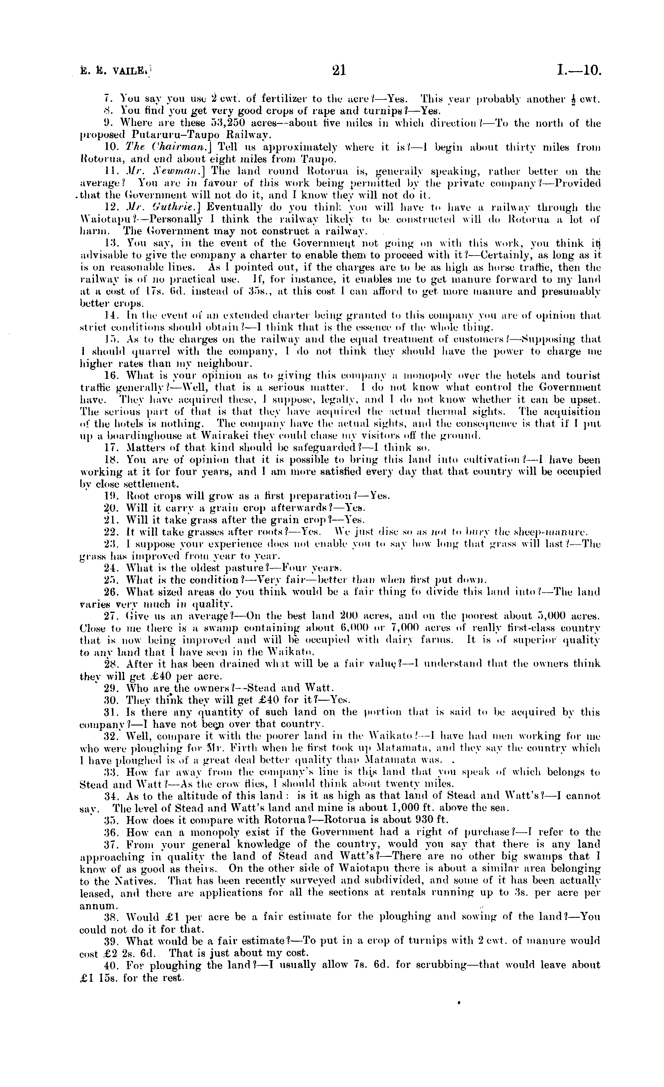 7. You say you Use 2 ewt'. of fertilizer to the acrel — Yes. This year probably another A owt, •-<. You find you get very good crops of rape and turnips I—Yes.1 —Yes. '.). Where ale these 53,250 acres- about live miles in which direction? 'I'd the north of tho proposed Putaruru—Taupo Railway. 10. The Chairman.] Tell us approximately where it is?- I begin about thirty miles from liotorua, and end about eight miles from Taupo. 11. .1//-. Newman.] The land round Kotorun is, generally speaking, rather better on the average? Yon are in favour of this work being permitted by the private company J— Provided that the Government will not do it, and I know they will not do it. 12. Mr. Guthrie.] Eventually do you think you will have to have a railway through the Waiotapu? Personally I think the railway likeh to he constructed will do Liotorua ;i lot of harm. The Government may not construct a railway. 18. You say, in tin 1 event of the Government not going on with this work, you think itj advisable to give the company a chattel- to enable them to proceed with it [- Certainly, as long as ii is on reasonable lines. As I pointed out, if 11 it? charges are to be as high as horse traffic, then the railway is of no practical use. If, for instance, it enables mi' to get manure Forward to my land at a cost of 17s. (id. instead of .'(."is., at this cost I can afford to get more manure and presumably 1 letter crops. 14. In the event of an extended charter being granted to this company you are of opinion that strict conditions should obtain f— 1 think that is the essence of the whole thing. l.">. As to the charges on the railway and the equal treatment of customers! —Supposing that I should quarrel with the company, I do not think they should have the power to charge me higher rates than my neighbour. 16. What is your opinion as to giving this company a monopoly over the hotels and tourist traffic generally.' —Well, that is a serious matter. I do not know what control the Government have. They have acquired these. I suppose, legally, and I do not know whether it can be upset. The serious part of that is that they have acquired the actual thermal sights. The acquisition of tile hotels is nothing. The company have the actual sights, and the consequence is that if I put up a boardinghouee at Wairakei they could chase my visitors oft' the ground. 17. Matters of that kind should be safeguarded? —I think so. I}-!. Vim are of opinion that it is possible to bring this land into cultivation.'' I have been working at it for four years, and I am more satisfied every day that thai country will be occupied by close settlement. li). Hoot crops will glow as a first preparation!- Yen. 20. Will it carry a grain crop afterwards.' Vis. 21. Will it take grass after the grain crop?— Yes. 22. It will take grasses after routs? Yes. We just disc so as not to bury the sheep-manure. 23. I suppose your experience does not enable you to say how long that grass will last?— The grass has improved from year to year. 24. What is the oldest pasture?— Four years. 2.~>. What is the condition .'--Very fail , — better than when first put down. 26. What sized areas do you think would be a fair thing to divide this land into (--The land varies very much in quality. 27. Give us an average?—On the best land 200 acres, and on the poorest about 5,000 acres. Close to me there is a swamp containing about 6,000 or 7,0(10 acres of really first-class country that is now being improved and will be occupied with dair\ farms. It is of superior quality to any land that I have seen in the Waikato; 2)"t. After it has been drained whit will lie a fair value?--I understand that the owners think they will get £-10 per acre. 29. Who are the owners.' Stead and Watt. 30. They think they will get £40 for it?— Yes. 31. Is there any quantity of such land on the portion that is said to be acquired by this company? — I have not beyi over that country. 32. Well, Compare it with the poorer land in the Waikato?- —I have had men working for me who were ploughing for Mr. Firth when he first took up Matamata, and they say the country which I have ploughed is .if a great deal better quality than Matamata was. . 33. How far away from the company's line is this land that you speak r>f which belongs to Stead and Watt? —As the crow tlies, ! should think about twenty miles. 34. As to the altitude of this land : is it as high as that land of Stead ami Watt's?--! cannot say. The level of Stead and Watt's land and mine is about 1,000 ft. above the sea. 3."). How does it compare with Rotorua? —Rotorua is about 930 ft. 36. How can a monopoly exist if the Government had a right of purchase? I refer to the 37. From your general knowledge of the country, would you say that there is any land approaching in quality the land of Stead and Watt's? —There are no other big swamps that I know of as good as theirs. On the other side of Waiotapu there is about a similar area belonging to the Natives. That has been recently surveyed and subdivided, and sonic of it has been actually leased, and there are applications for all the sections at rentals running up to .'is. per acre per annum. 38. Would £1 per acre be a fair estimate for the ploughing and sowing of the land?— You could not do it for that. 39. What would be a fair estimate? —To put in a crop of turnips with 2 cwt. of manure would cost £2 2s. (id. That is just about my cost. 40. For ploughing the land? —I usually allow 7s. 6d. for scrubbing—that would leave about .£1 15s. for the rest