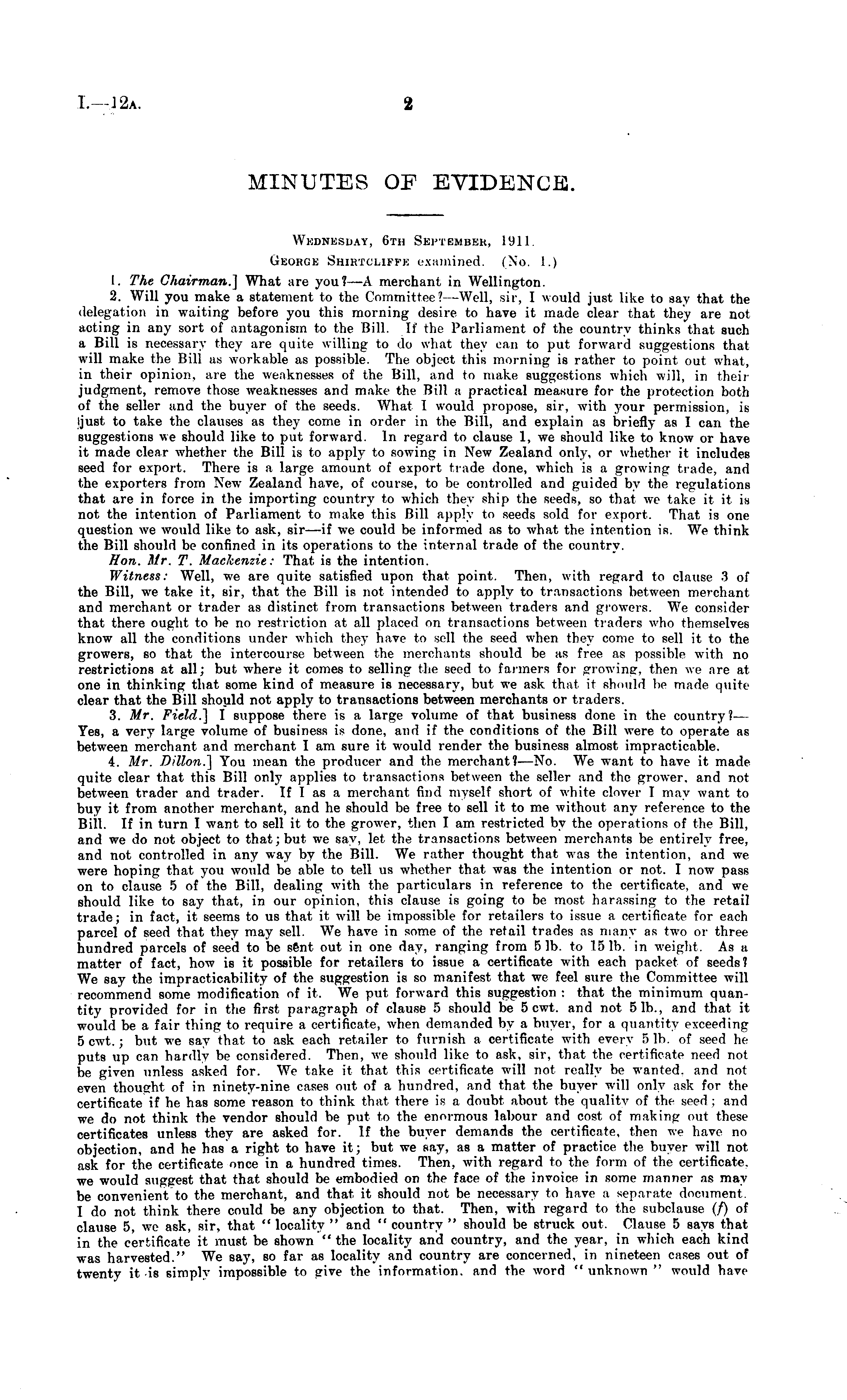 MINUTES OF EVIDENCE. Wkdnksuay, 6th September, 1911. George Shietcliffb examined. (No. 1.) 1. The Chairman.] What are you? —A merchant in Wellington. 2. Will you make a statement to the Committee? —Well, sir, I would just like to say that the delegation in waiting before you this morning desire to have it made clear that they are not acting in any sort of antagonism to the Bill. If the Parliament of the country thinks that such a Bill is necessary they are quite willing to do what they can to put forward suggestions that will make the Bill as workable as possible. The object this morning is rather to point out what, in their opinion, are the weaknesses of the Bill, and to make suggestions which will, in their judgment, remove those weaknesses and make the Bill a practical measure for the protection both of the seller and the buyer of the seeds. What I would propose, sir, with your permission, is ljust to take the clauses as they come in order in the Bill, and explain as briefly as I can the suggestions we should like to put forward. In regard to clause 1, we should like to know or have it made clear whether the Bill is to apply to sowing in New Zealand only, or whether it includes seed for export. There is a large amount of export trade done, which is a growing trade, and the exporters from New Zealand have, of course, to be controlled and guided by the regulations that are in force in the importing country to which they ship the seeds, so that we take it it is not the intention of Parliament to make this Bill apply to seeds sold for export. That is one question we would like to ask, sir—if we could be informed as to what the intention is. We think the Bill should be confined in its operations to the internal trade of the country. Hon. Mr. T. Mackenzie: That is the intention. Witness: Well, we are quite satisfied upon that point. Then, with regard to clause 3 of the Bill, we take it, sir, that the Bill is not intended to apply to transactions between merchant and merchant or trader as distinct from transactions between traders and growers. We consider that there ought to be no restriction at all placed on transactions between traders who themselves know all the conditions under which they have to sell the seed when they come to sell it to the growers, so that the intercourse between the merchants should be as free as possible with no restrictions at all; but where it comes to selling the seed to farmers for growing, then we are at one in thinking that some kind of measure is necessary, but we ask that it should be made quite clear that the Bill shoyld not apply to transactions between merchants or traders. 3. Mr. Field.] I suppose there is a large volume of that business done in the country?— Yes, a very large volume of business is done, and if the conditions of the Bill were to operate as between merchant and merchant I am sure it would render the business almost impracticable. 4. Mr. Dillon.] You mean the producer and the merchant?— No. We want to have it made quite clear that this Bill only applies to transactions between the seller and the grower, and not between trader and trader. If I as a merchant find myself short of white clover I may want to buy it from another merchant, and he should be free to sell it to me without any reference to the Bill. If in turn I want to sell it to the grower, then I am restricted by the operations of the Bill, and we do not object to that; but we say, let the transactions between merchants be entirely free, and not controlled in any way by the Bill. We rather thought that was the intention, and we were hoping that you would be able to tell us whether that was the intention or not. I now pass on to clause 5 of the Bill, dealing with the particulars in reference to the certificate, and we should like to say that, in our opinion, this clause is going to be most harassing to the retail trade; in fact, it seems to us that it will be impossible for retailers to issue a certificate for each parcel of seed that they may sell. We have in some of the retail trades as many as two or three hundred parcels of seed to be sent out in one day, ranging from 51b. to 15 Ib. in weight. As a matter of fact, how is it possible for retailers to issue a certificate with each packet of seeds? We say the impracticability of the suggestion is so manifest that we feel sure the Committee will recommend some modification of it. We put forward this suggestion : that the minimum quantity provided for in the first paragraph of clause 5 should be 5 cwt. and not 51b., and that it would be a fair thing to require a certificate, when demanded by a buyer, for a quantity exceeding 5 cwt.; but we say that to ask each retailer to furnish a certificate with every 5 Ib. of seed he puts up can hardly be considered. Then, we should like to ask, sir, that the certificate need not be given unless asked for. We take it that this certificate will not really be wanted, and not even thoucrht of in ninety-nine cases out of a hundred, and that the buyer will only ask for the certificate if he has some reason to think that there is a doubt about the quality of the seed; and we do not think the vendor should be put to the enormous labour and cost of making out these certificates unless they are asked for. If the buyer demands the certificate, then we have no objection, and he has a right to have it; but we say, as a matter of practice the buyer will not ask for the certificate once in a hundred times. Then, with regard to the form of the certificate, we would suggest that that should be embodied on the face of the invoice in some manner as may be convenient to the merchant, and that it should not be necessary to have a separate document. I do not think there could be any objection to that. Then, with regard to the subclause (/) of clause 5, we ask, sir, that " locality " and " country " should be struck out. Clause 5 says that in the certificate it must be shown " the locality and country, and 
