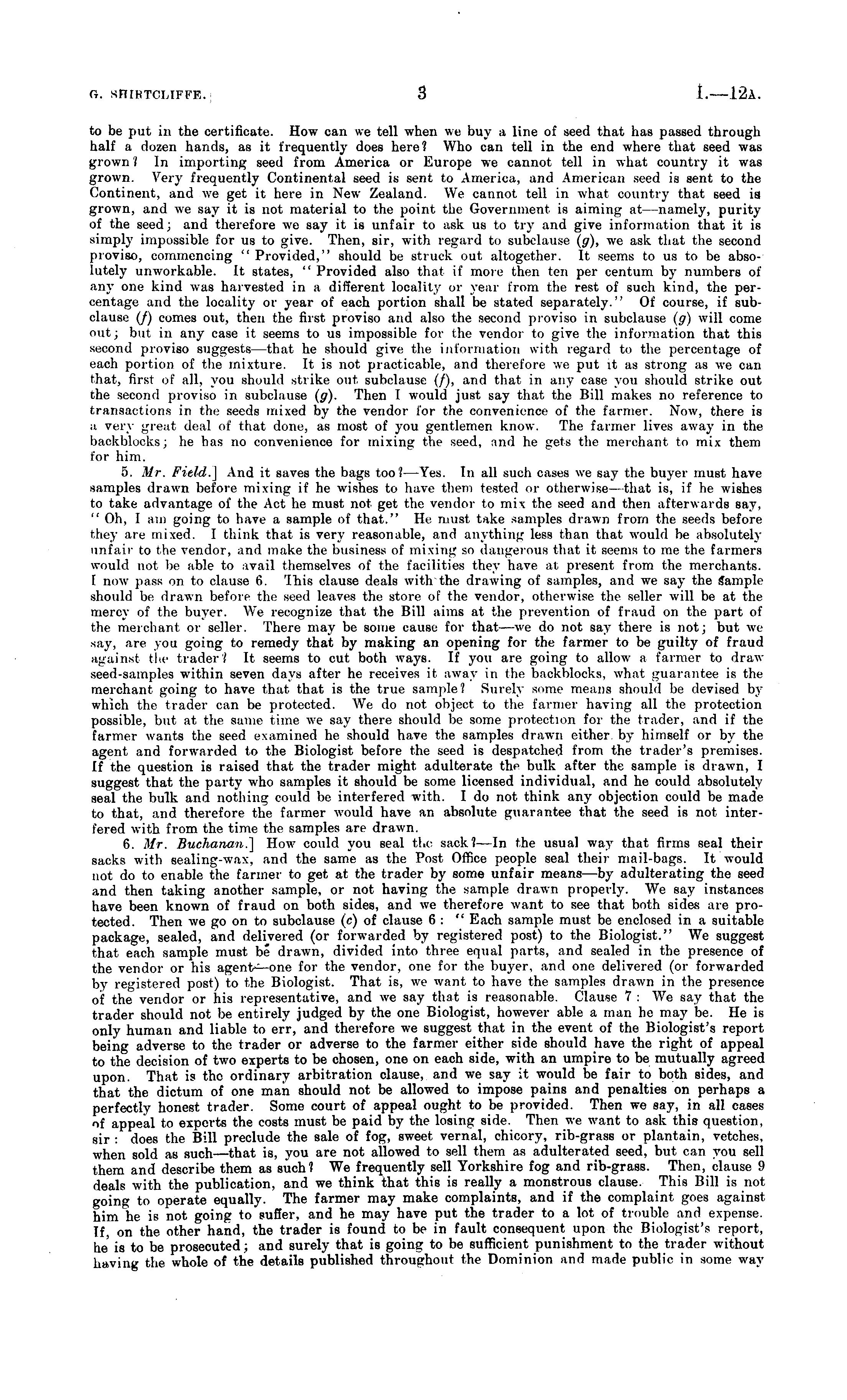 to be put in the certificate. How can we tell when we buy a line of seed that has passed through half a dozen hands, as it frequently does here? Who can tell in the end where that seed was grown 1 In importing seed from America or Europe we cannot tell in what country it was grown. Very frequently Continental seed is sent to America, and American seed is sent to the Continent, and we get it here in New Zealand. We cannot tell in what country that seed ia grown, and we say it is not material to the point the Government is aiming at —namely, purity of the seed; and therefore we say it is unfair to ask us to try and give information that it is simply impossible for us to give. Then, sir, with regard to subelause (g), we ask that the second proviso, commencing " Provided," should be struck out altogether. It seems to us to be absolutely unworkable. It states, " Provided also that if more then ten per centum by numbers of any one kind was harvested in a different locality or year t'rom the rest of such kind, the percentage and the locality or year of each portion shall be stated separately." Of course, if subclause (/) comes out, then the first proviso and also the second proviso in subclause (g) will come out; but in any case it seems to us impossible for the vendor to give the information that this second proviso suggests —that he should give the information with regard to the percentage of each portion of the mixture. It is not practicable, and therefore we put it as strong as we can that, first of all, you should strike out. subclause (/), and that in any case you should strike out the second proviso in subcluuse (g). Then I would just say that the Bill makes no reference to transactions in the seeds mixed by the vendor for the convenience of the farmer. Now, there is a very great deal of that done, as most of you gentlemen know. The farmer lives away in the backblocks; he has no convenience for mixing the seed, and he gets the merchant to mix them for him. 5. Mr. Field.] And it saves the bags too?— Yes. In all such cases we say the buyer must have samples drawn before niixinp if he wishes to have then) tested or otherwise —that is, if he wishes to take advantage of the Act he must not get the vendor to mix the seed and then afterwards say, " Oh, I am going to have a sample of that." He must take samples drawn from the seeds before they are mixed. I think that is very reasonable, and anything less than that would be absolutely unfair to the vendor, and make the business of mixing so dangerous that it seems to me the farmers would not be able to avail themselves of the facilities they have at present from the merchants. [ now pass on to clause 6. This clause deals with the drawing of samples, and we say the Sample should be drawn before the seed leaves the store of the vendor, otherwise the seller will be at the mercy of the buyer. We recognize that the Bill aims at the prevention of fraud on the part of the merchant or seller. There may be some cause for that —we do not say there is not; but we say, are you going to remedy that by making an opening for the farmer to be guilty of fraud against the trader? It seems to cut both ways. If you are going to allow a farmer to draw seed-samples within seven days after he receives it away in the backblocks, what guarantee is the merchant going to have that that is the true sample? Surely some means should be devised by which the trader can be protected. We do not object to the farmer having all the protection possible, but at the same time we say there should be some protection for the trader, and if the farmer wants the seed examined he should have the samples drawn either by himself or by the agent and forwarded to the Biologist before the seed is despatched from the trader's premises. If the question is raised that the trader might, adulterate the bulk after the sample is drawn, I suggest that the party who samples it should be some licensed individual, and he could absolutely seal the bulk and nothing could be interfered with. I do not think any objection could be made to that, and therefore the farmer would have an absolute guarantee that the seed is not interfered with from the time the samples are drawn. 6. Mr. Buchanan.] How could you seal the sack? —In the usual way that firms seal their sacks with sealing-wax, and the same as the Post Office people seal their mail-bags. It would not do to enable the farmer to get at the trader by some unfair means —by adulterating the seed and then taking another sample, or not having the sample drawn properly. We say instances have been known of fraud on both sides, and we therefore want to see that both sides are protected. Then we go on to subclause (c) of clause 6: " Each sample must be enclosed in a suitable package, sealed, and delivered (or forwarded by registered post) to the Biologist." We suggest that each sample must be drawn, divided into three equal parts, and sealed in the presence of the vendor or his agent- I—one1—one for the vendor, one for the buyer, and one delivered (or forwarded by registered post) to the Biologist. That is, we want to have the samples drawn in the presence of the vendor or his representative, and we say that is reasonable. Clause 7: We say that the trader should not be entirely judged by the one Biologist, however able a man he may be. He is only human and liable to err, and therefore we suggest that in the event of the Biologist's report being adverse to the trader or adverse to the farmer either side should have the right of appeal to the decision of two experts to be chosen, one on each side, with an umpire to be mutually agreed upon. That is the ordinary arbitration clause, and we say it would be fair to both sides, and that the dictum of one man should not be allowed to impose pains and penalties on perhaps a perfectly honest trader. Some court of appeal ought to be provided. Then we say, in all cases of appeal to experts the costs must be paid