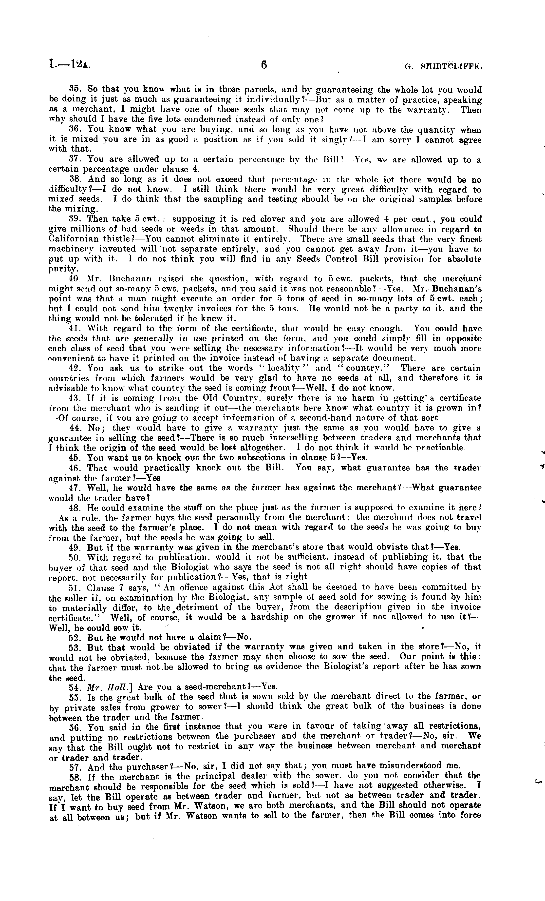 35. So that you know what is in those parcels, and by guaranteeing the whole lot you would be doing it just as much as guaranteeing it individually?— But as a matter of practice, speaking as a merchant, I might have one of those seeds that may not come up to the warranty. Then why should I have the five lots condemned instead of only one 1 36. You know what you are buying, and so long as you hare nut above the quantity when it is mixed you are in as good a position as it' you sold it singly I -I am sorry I cannot agree with that. 37. You are allowed up to a certain percentage by the It i 11 ? -Yes, we are allowed up to a certain percentage under clause 4. 38. And so long as it does net exceed that percentage in the whole lot there would be no difficulty? —I do not know. I still think there would be very great difficulty with regard to mixed seeds. I do think that the sampling and testing should be on the original samples before the mixing. 39. Then take 5 cwt. : supposing it is red clover and you are allowed 4 per cent., you could give millions of bad seeds or weeds in that amount. Should there be any allowance in regard to Californian thistle? —You cannot eliminate it entirely. There are small seeds that the very finest machinery invented will not separate entirely, and you cannot get away from it- —you have to put up with it. I do not think you will find in any Seeds Control Bill provision for absolute purity. 40. Mr. Buchanan raised the question, with regard to sowt. packets, that the merchant might send out so-many 5 cwt. packets, and you said it was not reasonable?— Yes. Mr. Buchanan's point was that a man might execute an order for 5 tons of seed in so-many lots of 5 cwt. each; but I could not send him twenty invoices for the 5 tons. He would not be a party to it, and the thing would not be tolerated if he knew it. 41. With regard to the form of the certificate, that would be easy enough. You could have the seeds that are generally in use printed on the form, and you could simply fill in opposite each class of seed that you were selling the necessary information !— lt would be very much more convenient to have it printed on the invoice instead of having a separate document. 42. You ask us to strike out the words "locality" and "country." There are certain countries from which farmers would be very glad to have no seeds at all, and therefore it is advisable to know what country the seed is coming from? —-Well, I do not know. 43. If it is coming from the Old Country, surely there is no harm in getting' a certificate from the merchant who is sending it out —the merchants here know what, country it is grown inf —Of course, if you are going to accept information of a second-hand nature of that sort. 44. No; they would have to give a warranty just the same as you would have to give h guarantee in selling the seed? —There is so much interselling between traders and merchants that I think the origin of the seed would be lost altogether. Ido not think it would be practicable. 45. You want us to knock out the two subsections in clause s?—Yes. 46. That would practically knock out the Bill. You say. what guarantee has the trader "* against the farmer?— Yes. 47. Well, he would have the same as the farmer has against the merchant? —What guarantee would thi' trader have? 48. He could examine the stuff on the place just as the farmer is supposed to examine it here? —As a rule, the farmer buys the seed personally from the merchant; the merchant does not travel with the seed to the farmer's place. I do not mean with regard to the seeds he was going to buy from the farmer, but the seeds he was going to sell. 49. But if the warranty was given in the merchant's store that would obviate that? —Yes. 50. With regard to publication, would it not he sufficient, instead of publishing it, that the buyer of that seed and the Biologist who says the seed is not all right should have copies of that report, not necessarily for publication? —Yes, that is right. 51. Clause 7 says, "An offence against this Act shall be deemed to have been committed by the seller if, on examination by the Biologist, any sample of seed sold for sowing is found by him to materially differ, to of the buyer, from the description given in the invoice certificate."'" Well, of course, it would be a hardship on the grower if not allowed to use it?— Well, he could sow it. 52. But he would not have a claim? —No. 53. But that would be obviated if the warranty was given and taken in the store?—No, it would not be obviated, because the farmer may then choose to sow the seed. Our point is this : that the farmer must not.be allowed to bring as evidence the Biologist's report after he has sown the seed. 54. Mr. Hall.] Are you a seed-merchant? —Yes. 55. Is the great bulk of the seed that is sown sold by the merchant direct to the farmer, or by private sales from grower to sower? —I should think the great bulk of the business is done between the trader and the farmer. 56. You said in the first instance that you were in favour of taking away all restrictions, and putting no restrictions between the purchaser and the merchant or trader? —No, sir. We say that the Bill ought not to restrict in any way the business between merchant and merchant or trader and trader. 57. And the purchaser? —No, sir, 1 did not say that; you must have misunderstood me. 58. If the merchant is the principal dealer with the sower, do you not consider that the merchant should be responsible for the seed which is sold? —I have not suggested otherwise. T say, let the Bill operate as between trader and farmer, but not as between trader and trader. If I want to buy seed from Mr. Watson, we are both merchants, and the Bill should not operate at all between us; but if Mr. Watson wants to sell to the farmer, then the Bill comes into force