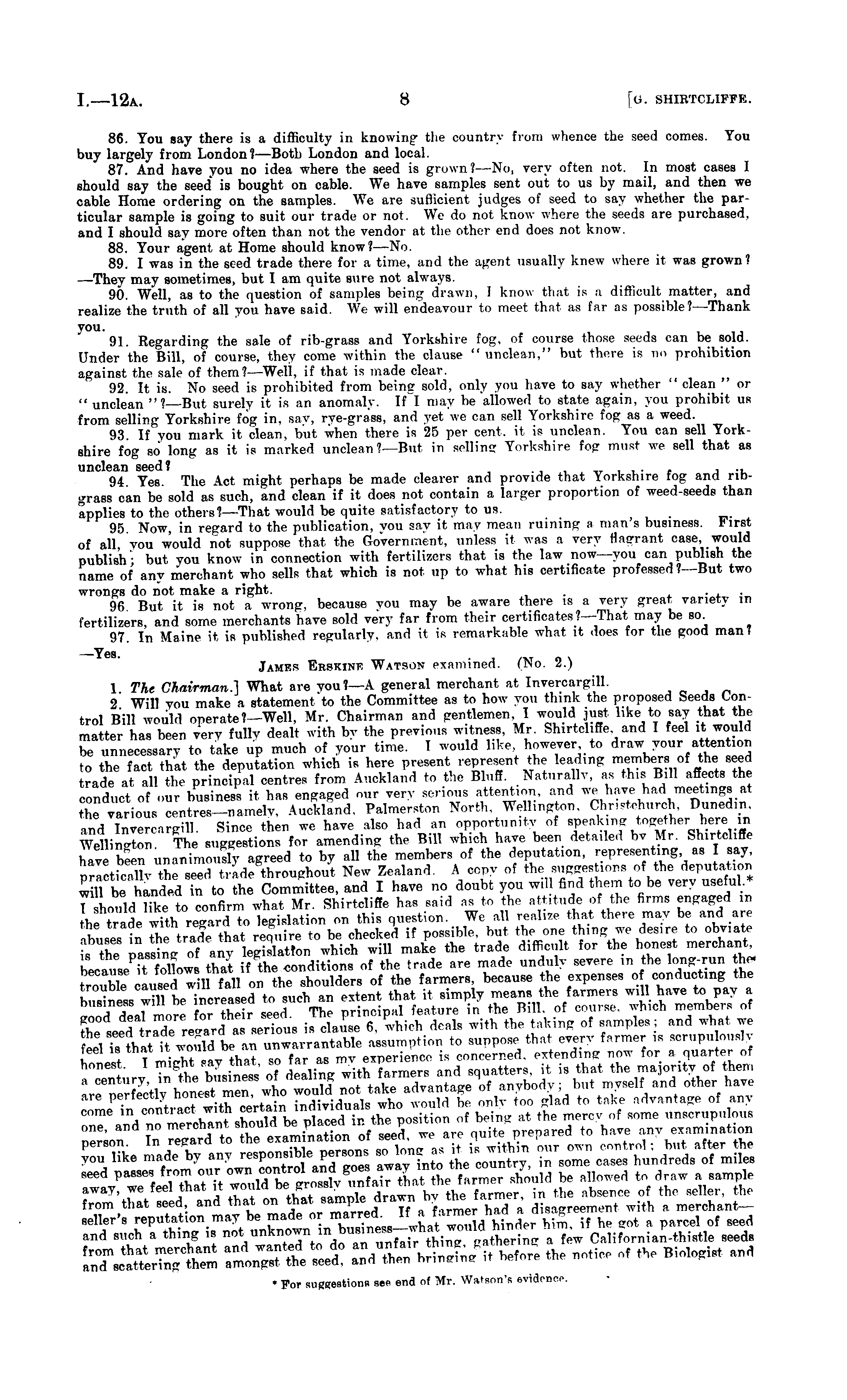 86. You say there is a difficulty in knowing , the country from whence the seed comes. You buy largely from London? —Both London and local. 87. And have you no idea where the seed is grown?—No, very often not. In most cases I should say the seed is bought on cable. We have samples sent out to us by mail, and then we cable Home ordering on the samples. We are sufficient judges of seed to say whether the particular sample is going to suit our trade or not. We do not know where the seeds are purchased, and I should say more often than not the vendor at the other end does not know. 88. Your agent at Home should know? —No. 89. I was in the seed trade there for a time, and the agent usually knew where it was grown? —They may sometimes, but I am quite sure not always. 90. Well, as to the question of samples being drawn, 1 know that is a difficult matter, and realize the truth of all you have said. We will endeavour to meet that as far as possible?— Thank you. 91. Regarding the sale of rib-grass and Yorkshire fog, of course those seeds can be sold. Under the Bill, of course, they come within the clause "unclean," but there is no prohibition against the sale of them? — Well, if that is made clear. 92. It is. No seed is prohibited from being sold, only you have to say whether " clean " or " unclean "I —But surely it is an anomaly. If I may be allowed to state again, you prohibit ur from selling Yorkshire fog in, say, rye-grass, and yet we can sell Yorkshire fog as a weed. 93. If you mark it clean, but when there is 25 per cent, it is unclean. You can sell Yorkshire fog so long as it is marked unclean? —But in soiling Yorkshire fog must we sell that as unclean seed? , ~ 94 Yes. The Act might perhaps be made clearer and provide that Yorkshire fog and ribgrass can be sold as such, and clean if it does not contain a larger proportion of weed-seeds than applies to the others ?—That would be quite satisfactory to us. 95. Now, in regard to the publication, you say it may mean ruining a man s business. First of all you would not suppose that the Government, unless it was a very nacrant case, would publish- but you know in connection with fertilizers that is the law now—you can publish the name of any merchant who sells that which is not up to what his certificate professed ?—But two wrongs do not make a right. . . 96 But it is not a wrong, because you may be aware there is a very great variety in fertilizers and some merchants have sold very far from their certificates?— That may be so 97. In Maine it is published regularly, and it is remarkable what it does for the good man? Jamks Erskinf Watson examined. (No. 2.) 1 The Chairman.'] What are you?—A general merchant at Invercargill. 2 Will you make a statement'to the Committee as to how you think the proposed Seeds Control Bill would operate?— Well, Mr. Chairman and gentlemen, I would just like to say that the matter has been very fully dealt with by the previous witness, Mr. Shirtcliffe and I feel it would be unnecessary to take up much of your time. I would like, however to draw your attention to the fact that the deputation which is here present represent the leading members of the seed trade at all the principal centres from Auckland to the Bluff. Naturally, as tins. 8,11 affects the conduct of our business it has engaged our very serious attention, and we have had meetings at the various centres— namely, Auckland, Palmerston North. Wellington, Chnstchurch, Dunedin. and Invercargill. Since then we have also had an opportunity of speaking together^herein Welling The suggestions for amending the Bill which have been detailed by Mr. Shirtcliffe have been unanimously agreed to by all the members of the deputation, representing as I say, prZtioSr the seed trade throughout New Zealand. A copy of the suggestions of the deputation will be handed i n to the Committee, and I have no doubt you will find them to be very useful.* :;r» b ,tr:t™ SSfiS* stCSs/s ess l z*. i s: M*. J • For suggestions sen end of Mr. Watson's evidenoe.