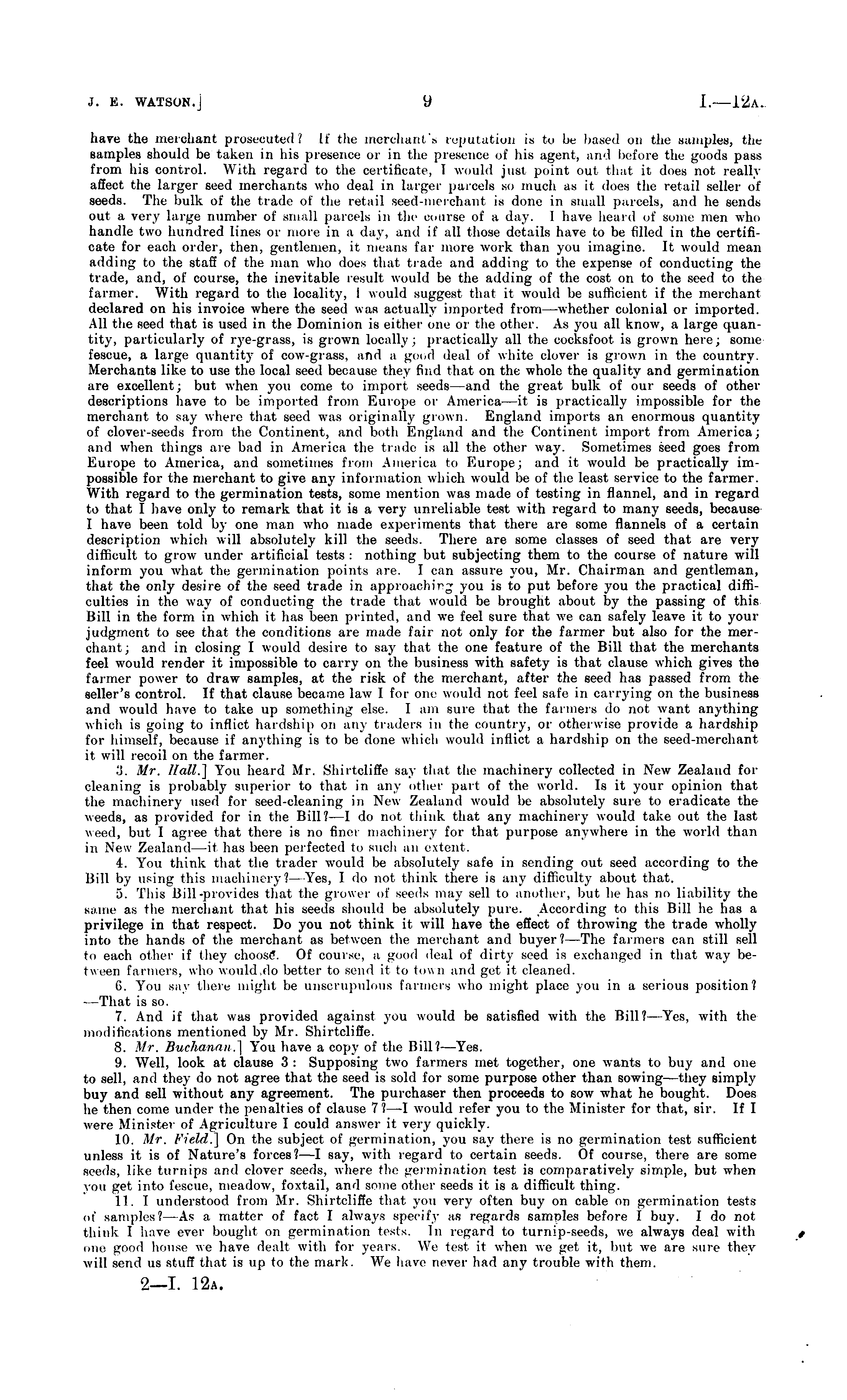 have the merchant prosecuted? If the merchant's reputation is to be based on the samples, the samples should be taken in his presence or in the presence of his agent, and before the goods pass from his control. With regard to the certificate, I would just point out that it does not really affect the larger seed merchants who deal in Larger parcels so much as it does the retail seller of seeds. The bulk of the trade of the retail seed-merchant is done in small parcels, and he sends out a very large number of .small parcels in the course of a day. 1 have heard of some men win. handle two hundred lines or more in a day, and if all those details have to be filled in the certificate for each order, then, gentlemen, ii means far more work than you imagine. It would mean adding to the staff of the man who does that trade and adding to the expense of conducting the trade, and, of course, the inevitable result would be. the adding of the cost on to the seed to the farmer. With regard to the locality, I would suggest thai it would be sufficient if the merchant declared on his invoice where the seed was actually imported from—whether colonial or imported. All the seed that is used in the Dominion i.s either one or the other. As you all know, a large quantity, particularly of rye-grass, is grown locally; practically all the cocksfoot i.s grown here; som< fescue, a large quantity of cow-grass, and a good deal of white clover is grown in the country. Merchants like to use the local seed because they find t hat on the whole the quality and germination are excellent; but when you come to import seeds—and the great bulk of our seeds of other descriptions have to be imported from Europe or America—it is practically impossible for the merchant to say where that seed was originally grown. England imports an enormous quantity of clover-seeds from the Continent, and both England and the Continent import from America; and when things are bad in America the trade is all the other way. Sometimes seed goes from Europe to America, and sometimes from America to Europe; and it would be practically impossible for the merchant to give any information which would be of the least service to the farmer. With regard to the germination tests, some mention was made of testing in flannel, and in regard to that I have only to remark that it is a very unreliable test with regard to many seeds, because I have been told by one man who made experiments that there are some flannels of a certain description which will absolutely kill the seeds. There are some classes of seed that are very difficult to grow under artificial tests : nothing but subjecting them to the course of nature will inform you what the germination points are. I can assure you, Mr. Chairman and gentleman, that the only desire of the seed trade in approachirg you is to put before you the practical difficulties in the way of conducting the trade that would be brought about by the passing of this Hill in the form in which it lias been printed, and we feel sure that we can safely leave it to your judgment to see that the conditions are made lair not only for the farmer but also for the merchant; and in closing I would desire to say that the one feature of the Bill that the merchants feel would render it impossible to carry on the business with safety is that clause which gives the farmer power to draw samples, at the risk of the merchant, after the seed has passed from the seller's control. If that clause became law I for one would not feel safe in carrying on the business and would have to take up something else. I am sure that the farmers do not want anything which is going to inflict hardship on any traders in the country, or otherwise provide a hardship for himself, because if anything is to be done which would inflict a hardship on the seed-merchant it will recoil on the farmer. •i. Mr. //all.] You heard Mr. Shirtcliffe say that the machinery collected in New Zealand for cleaning is probably superior to that in any other pari of the world. Is it your opinion that the machinery used for seed-cleaning in New Zealand would be absolutely sure to eradicate the weeds, as provided for in the Bill? —I do not think that any machinery would take out the last weed, but I agree that there is no finer machinery lor that purpose anywhere in the world than in New Zealand —it has been perfected to such an extent. 4. You think that the trader would be absolutely safe in sending out seed according to the Jiill by using this machinery?— Yes, I do not think there is any difficulty about that. 5. This Bill-provides that the grower of seo;ls may sell to another, but he has no liability the same as the merchant that his seeds should be absolutely pure. According to this Bill he has a privilege in that respect. Do you not think it will have the effect of throwing the trade wholly into the hands of the merchant as between (lie merchant and buyer?— The farmers can still sell to each other if they choose. Of course, a good deal of dirt}- seed is exchanged in that way between farmers, who would do better to send it to town and get it cleaned. 6. You say there might be unscrupulous Farmers who might place you in a serious position? —That is so. 7. And if that was provided against you would be satisfied with the Bill?— Yes, with the modifications mentioned by Mr. Shirtcliffe. 8. Mr. Buchanan.] You have a copy of the Bill? —Yes. 9. Well, look at clause 3 : Supposing two farmers met together, one wants to buy and one to sell, and they do not agree that the seed is sold for some purpose other than sowing—they simply buy and sell without any agreement. The purchaser then proceeds to sow what he bought. Does he then come under the penalties of clause 7? —I would refer you to the Minister for that, sir. If I were Minister of Agriculture I could answer it very quickly. 10. Mr. Field] On the subject of germination, you say there is no germination test sufficient unless it 