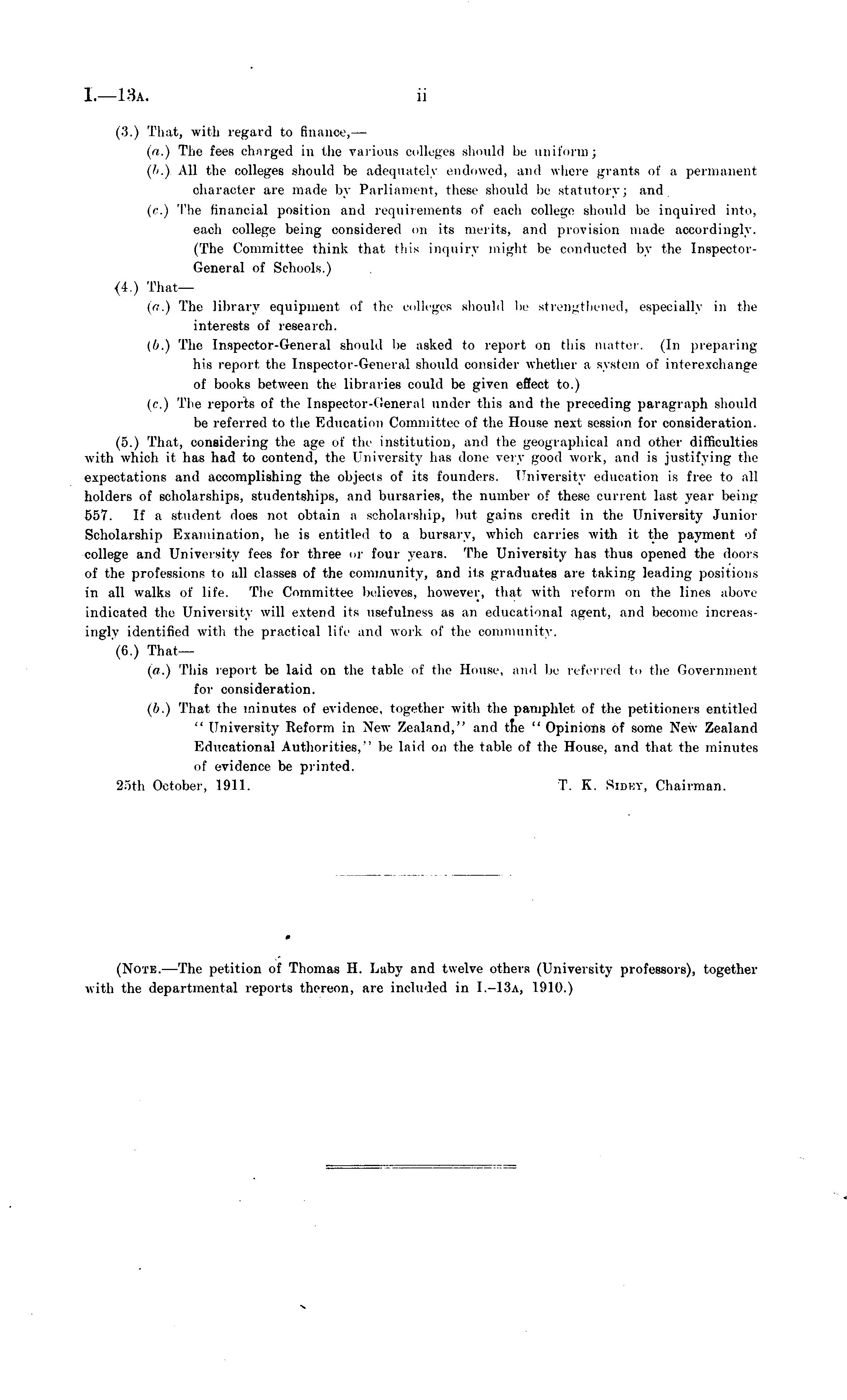 (•'!.) That, with regard to finance, — (a.) The fees charged in the various colleges should be uniform; (l>.) All the colleges should be adequately endowed, ami where grants of a permanent character are made by Parliament, these should be statutory; and (c.) 'Hie financial position and requirements of each college should lie inquired into, each college being considered en its merits, and provision made accordingly. (The Committee think that this inquiry might be conducted by the InspectorGeneral of Schools.) <4.) That— (a.) The library equipment of the colleges should be strengthened, especially in the interests of research. (b.) The Inspector-General should be asked to report on this matter. (In preparing his report the Inspector-Genera] should oonsider whether a system of interexchange of books between the libraries could be given effect to.) (c.) The reports of the Inspector-General under this and the preceding paragraph should be referred to the Education Committee of the House next session for consideration. (5.) That, considering the age of the institution, and the geographical and other difficulties with which it has had to contend, the University has done very good work, and is justifying the expectations and accomplishing the objects of its founders. University education is free to all holders of scholarships, studentships, and bursaries, the number of these current last year being 557. If a student does not obtain a scholarship, but gains credit in the University Junior Scholarship Examination, he is entitled to a bursary, which carries with it the payment of college and University fees for three or four years. The University has thus opened the doors of the professions to all classes of the community, and iis graduates are taking leading positions in all walks of life. The Committee believes, however, that with reform on the lines above indicated the University will extend its usefulness as an educational agent, and become increas ingly identified with the practical life and work of the community. (6.) That— {<i.) This report be laid on the table of the House, and be referred to the Government for consideration. (l>.) That the minutes of evidence, together with the pamphlet of the petitioners entitled "University Reform in New Zealand," and trie "Opinions of some Xew Zealand Educational Authorities,' , be laid on the table of the House, and that the minutes of evidence be printed. 25th October, 1911. T. K. Sidky, Chairman.
