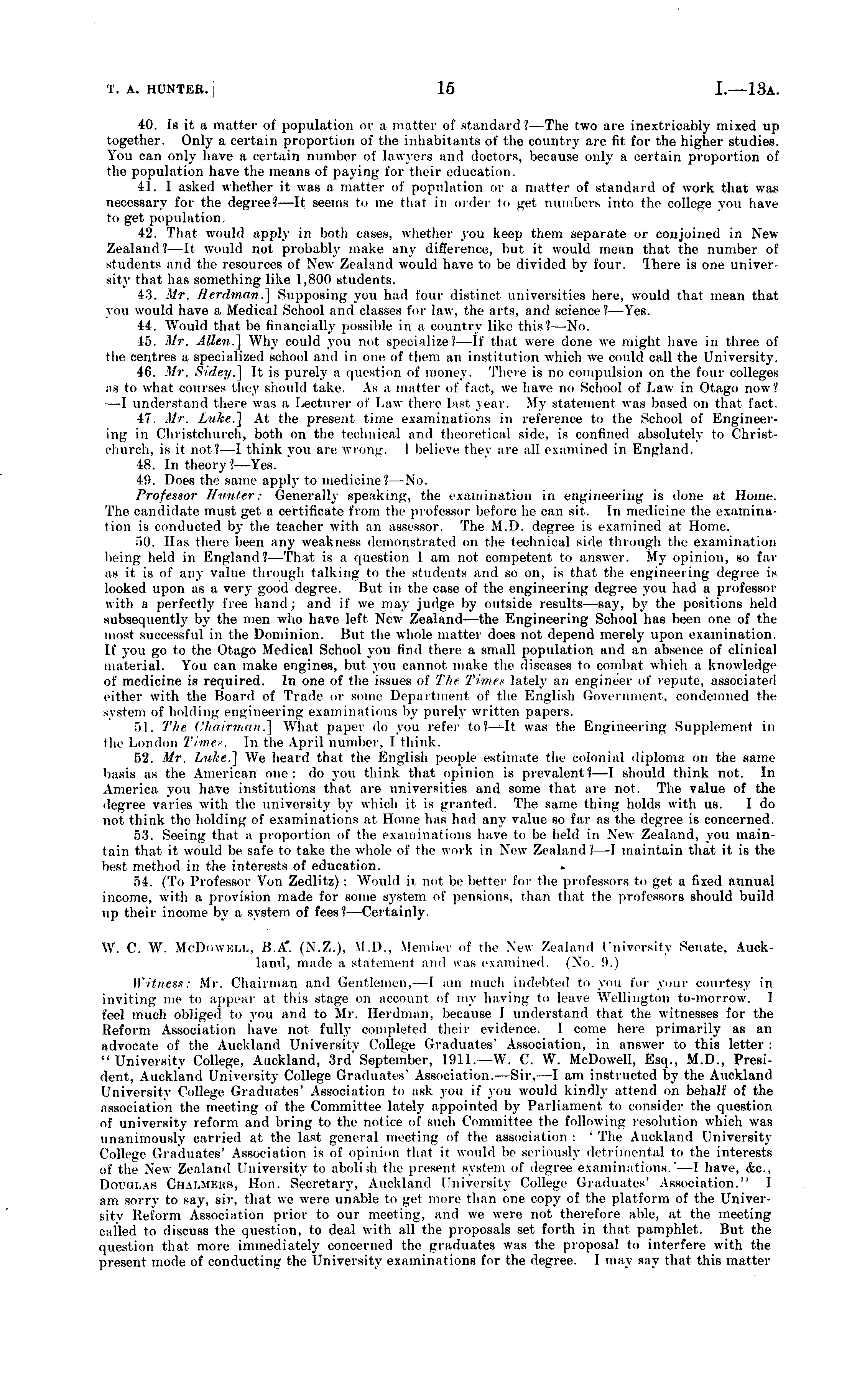 40. Is it a matter of population or a matter of standard ! —The two are inextricably mixed up together. Only a certain proportion of the inhabit ants of the country are fit for the higher studies. You can only have a certain number of lawyers and doctors, because only a certain proportion of the population have the means of paying for their education. 41. I asked whether it was a matter of population or a matter of standard of work that was necessary for the degree?—lt seems to me that in order to get numbers into the college you have to get population 42. That would apply in both cases, whether you keep them separate or conjoined in New Zealand? —It would not probably make any difference, but it would mean that the number of students and the resources of New Zealand would have to be divided by four. There is one university that has something like 1,800 students. 43. Mr. tleriliiutn . ] Supposing you had four distinct universities here, would that mean that you would have a Medical School and classes for law. the arts, and science? —Yes. 44. Would that be financially possible in a country like this J —No. 15. Mr. Allen.] Why could you not specialize?—lf that were done we might have in three of the centres a specialized school and in one of them an institution which we could call the University. 46. Mr. Si/ley.] It is purely a question of money. There is no compulsion on the four colleges as to what courses they should take. As a matter of fact, we have no School of Law in Otago now? — I understand there was a Lecturer of Law (here list year. My statement was based on that fact. 47. Mr. Luke.] At the present time examinations in reference to the School of Engineering in Christohurch, both on the technical and theoretical side, is confined absolutely to Christchurch, is it not? — I think you are wrong. I believe they are all examined in England. 48. In theory i —Yes. 1!). Does the same apply to medicine?— No. Professor HwUer: Generally speaking, the examination in engineering is done at Home. The candidate must get a certificate from the professor before he can sit. In medicine the examination is conducted by the teacher with an assessor. The M.D. degree is examined at Home. 50. Has there been any weakness demonstrated on the technical side through the examination being held in England) — That is a question lam not competent to answer. My opinion, so far as it is of any value through talking to the students and so on, is that the engineering degree is looked upon as a very good degree. Hut in the case of the engineering degree you had a professor with a perfectly free hand; and if we may judge by outside results—say, by the positions held subsequently by the men who have left New Zealand —the Engineering School has been one of the most successful in the Dominion. But the whole matter does not depend merely upon examination. If you go to the Otago Medical School you find there a small population and an absence of clinical material. You can make engines, but you cannot make the diseases to combat which a knowledge of medicine is required. In one of the issues of The Times lately an engineer of repute, associated either with the Hoard of Trade or some Department of the English Government, condemned the system of holding engineering examinations by purely written papers. ."> I. The Chairman.] What paper do you refer to?—lt was the Engineering Supplement in the London Times. In the April number, I think. 52. Mr. Luke.] We heard that the English people estimate the colonial diploma on the same basis as the American one: do you think that opinion is prevalent?—l should think not. In America you have institutions that are universities and some that are not. The value of the degree varies with the university by which it is granted. The same thing holds with us. Ido not think the holding of examinations at Home has had any value so tar as the degree is concerned. 53. Seeing that a proportion of the examinations have to be held in New Zealand, you maintain that it would be safe to take the whole of the work in New Zealand?—l maintain that it is the best method in the interests of education. 54. (To Professor Yon Zedlitz) : Would ii not be better for the professors to get a fixed annual income, with a provision made for some system of pensions, than that the professors should build up their income by a system of fees? —Certainly. \V. ('. W. McDowell, H.A. (N.Z.), M.D., Member of the New Zealand University Senate, Auckland, made a statement and was examined. (No. !).) Witness: Mr. Chairman and Gentlemen, —I am much indebted to you for your courtesy in inviting me to appear at this stage on account of my having to leave Wellington to-morrow. I feel much obliged to you and to Mr. Herdman, because I understand that the witnesses for the Reform Association have not I'ullv completed their evidence. I come here primarily as an advocate of the Auckland University College Graduates' Association, in answer to this letter: "University College, Auckland, 3rd' September, 1911.— W. C. W. McDowell, Esq., M.D., President, Auckland University College Graduates' Association. —Sir, —I am instructed by the Auckland University College Graduates' Association to ask you if you would kindly attend on behalf of the association the meeting of the Committee lately appointed by Parliament to consider the question of university reform and bring to the notice of such Committee the following resolution which was unanimously carried at the last general meeting of the association : ' The Auckland University College Graduates' Association is of opinion that it would be seriously detrimental to the interests of the New Zealand University to abolish the present system of degree examinations.'—l have, &c, DOUGLAS CHALMERS, Hon. Secretary, Auckland University College Graduates' Association." 1 am sorry to say, sir, that we were unable to get more than one copy of the platform of the University R