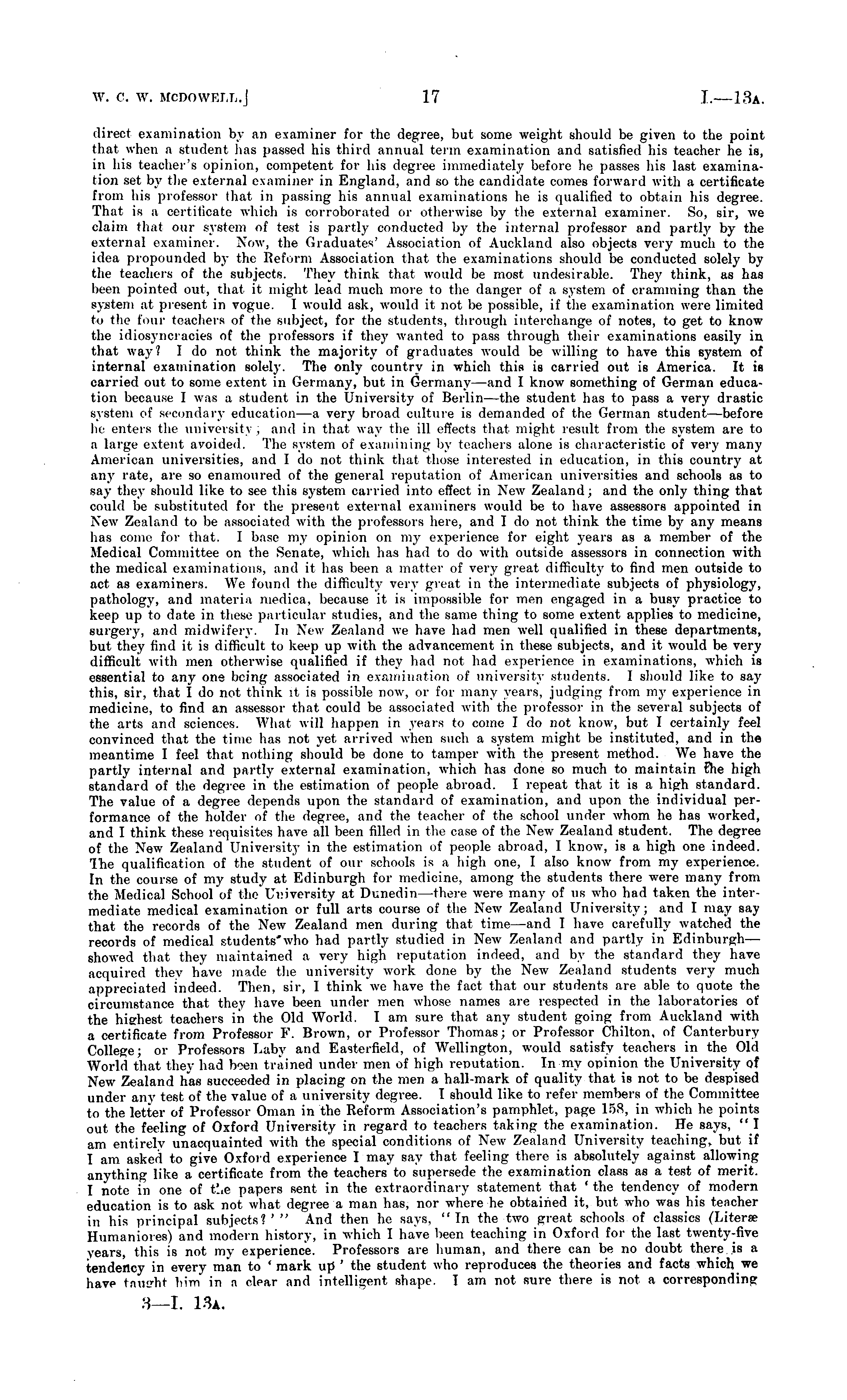 direct examination by an examiner for the degree, but some weight should be given to the point that when a student has passed his third annual term examination and satisfied his teacher he is, irr his teacher's opinion, competent for his degree immediately before he passes his last examination set by the external examiner in England, and so the candidate comes forward xvith a certificate from his professor that in passing his annual examinations he is qualified to obtain his degree. That is a certificate xvhich is corroborated or otherwise by the external examiner. So, sir, xve claim that our system of test is partly conducted by the internal professor and partly by the external examiner. Noxv, the Graduates' Association of Auckland also objects very much to the idea propounded by the Reform Association that the examinations should be conducted solely by the teachers of the subjects. They think that xvould be most undesirable. They think, as has been pointed out, that it might lead much more to the danger of a system of cramming than the system at present in vogue. I xvould ask, xvould it not be possible, if the examination were limited to the four teachers of the subject, for the students, through interchange of notes, to get to knoxv the idiosyncracies of the professors if they xvanted to pass through their examinations easily in that way? I do not think the majority of graduates xvould be xvilling to have this system of internal examination solely. The only country in which this is carried out is America. It is carried out to some extent in Germany, but in Germany—and I knoxv something of German education because 1 was a student in the University of Berlin —the student has to pass a very drastic system of secondary education—a very broad culture is demanded of the German student—before he enters the university , and in that xvay the ill effects that might result from the system are to a large extent avoided. The system of examining by teachers alone is characteristic of very many American universities, and I do not think that those interested in education, in this country at any rate, are so enamoured of the general reputation of American universities and schools as to say they should like to see this system carried into effect in Nexv Zealand; and the only thing that could be substituted for the present external examiners would be to have assessors appointed in Nexv Zealand to be associated with the professors here, and I do not think the time by any means has come for that. I base my opinion on my experience for eight years as a member of the Medical Committee on the Senate, xvhich has had to do with outside assessors in connection with the medical examinations, and it has been a matter of very great difficulty to find men outside to act as examiners. We found the difficulty very great in the intermediate subjects of physiology, pathology, and materia ruedica, because it is impossible for men engaged in a busy practice to keep up to date in these particular studies, and the same thing to some extent applies to medicine, surgery, and midwifery. In Nexv Zealand xve have had men well qualified in these departments, but they find it is difficult to keep up xvith the advancement in these subjects, and it would be very difficult with men otherwise qualified if they had not had experience in examinations, xx'hich is essential to any one being associated in examination of university students. I should like to say this, sir, that I do not think it is possible noxv, or for many years, judging from my experience in medicine, to find an assessor- that could be associated xvith the professor in the several subjects of the arts and sciences. What xvill happen in years to come I do not know, but I certainly feel convinced that the time has not yet arrived when such a system might be instituted, and in the meantime I feel that nothing should be done to tamper xvith the present method. We have the partly internal and partly external examination, which has done so much to maintain file high standard of the degree in the estimation of people abroad. I repeat that it is a high standard. The value of a degree depends upon the standard of examination, and upon the individual performance of the holder of the degree, and the teacher of the school under whom he has xvorked, and I think these requisites have all been filled in the case of the New Zealand student. The degree of the New Zealand University in the estimation of people abroad, I knoxv, is a high one indeed. Ihe qualification of the student of our schools is a high one, I also know from my experience. In the course of my study at Edinburgh for medicine, among the students there xx'ere many from the Medical School of the University at Dunedin—there xvere many of us who had taken the intermediate medical examination or full arts course of the New Zealand University; and I may say that the records of the Nexv Zealand men during that time—and T have carefully xvatched the records of medical students'xvho had partly studied in Nexv Zealand and partly in Edinburgh— showed that they maintained a very high reputation indeed, and by the standard they have acquired they have made the university xvork done by the New Zealand students very much appreciated indeed. Then, sir, I think xve have the fact that our students are able to quote the circumstance that they have been under men xvhose names are respected irr the laboratories of the highest teachers in the Old World. I am sure that any student going from Auckland with a certificate from Professor F. Broxvn, or Professor Thomas; or Professor Chilton, of Canterbury College; or Professors baby and Easterfield, of Wellington, xvould satisfy teachers in the Old World that they had been trained under men of high reputation. In my opinion the University of New Zealand has succeeded in placing on the men a hall-mark of quality that is not to be despised under any test of the value of a university deg