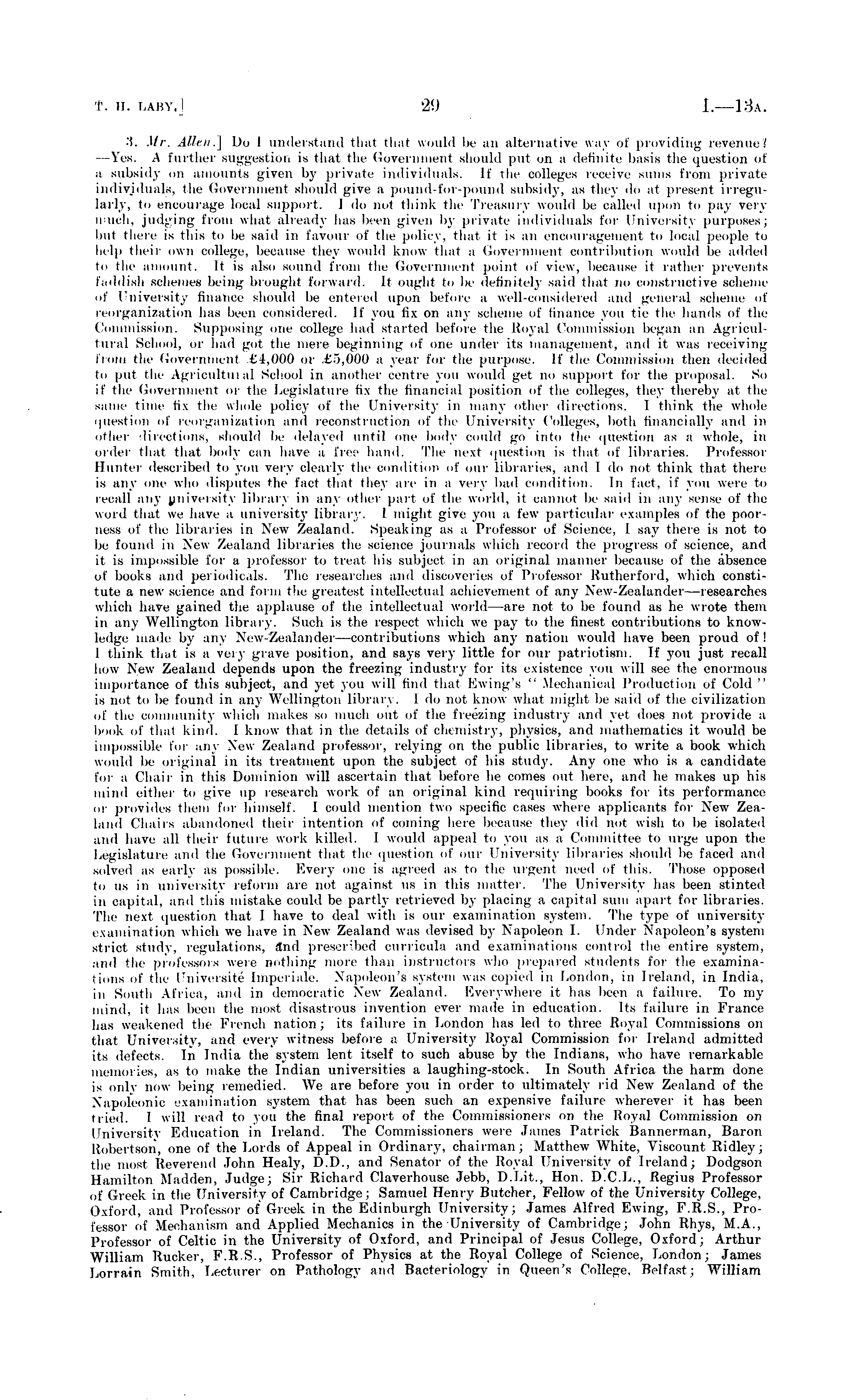 3. Mr. Allen. ] Do I understand that that would be an alternative way of providing revenue.' es. A further suggestion is that the Government should put on a definite basis the question of a subsidy on amounts given by private individuals. If ihe colleges receive sums from private individuals, the Government should give a pound-for-pound subsidy, as they do at present irregularly, to encourage local support. I do not think the Treasury would be called upon to pay very much, judging from what already has been given by private individuals for University purpi but there is this to be said in favour of the policy, that it is an encouragement to local people to help their own college, because they would know that a Government contribution would be added to the amount. It is also sound from the Government point of view, because it rather prevents faddish schemes being brought forward. It ought to be definitely said that no constructive scheme of University finance should be entered upon before a well-considered and general scheme of reorganization has been considered. If you fix on any scheme of finance miii tie the hands of the Commission. Supposing one college had started before the Royal Commission began an Agricultural School, or had gut the mere beginning of one under its management, and it was receiving 11 urn the Government £4,000 or £5,000 a year for the purpose. If the Commission then decided io put ihe Agricidtill al School in another centre you would get no support for the proposal. So if the Government or the Legislature fix the financial position ol' the colleges, they thereby al the same time fix the whole policy of the University in many other directions. I think the whole question of reorganization and reconstruction of the University Colleges, both financially and ill other directions, should be delayed until one body could go into the question as a whole, in order that that body can have a free hand. The next question is that of libraries. Professor Hunter described to you very clearly the condition of our libraries, and I do not think that there is any one who disputes the fact that they are in a \rvy bad condition. 11l fact, if you were to recall any univeisity librar\ in any other pari of ihe world, it cannot he said in any sense of the word that we have a university library. I might give you a few particular examples of the poor uess of the libraries in New Zealand. Speaking as a Professor of Science, I say there is not to be found in New Zealand libraries the science journals which record the progress of science, and it is impossible for a professor to treat his subject in an original manner because of tin' absence of books and periodicals. The researches and discoveries of Professor Rutherford, which constitute a new science and form the greatest intellectual achievement of any New-Zealander researches which have gained the applause of the intellectual world —are not to be found as he wrote them in any Wellington library. Such is the respect which we pay to the finest contributions to knowledge made by any New-Zealander—contributions which any nation would have been proud of! 1 think that is a very grave position, and says very little for our patriotism. If ymi just recall how New Zealand depends upon the freezing industry for its existence you will see Ihe enormous Importance of this subject, and yet you will find that Ewing's " Mechanical Production of Cold is not to be found in any Wellington library. I do not know what might be said of the civilization of the community which makes so much out of the freezing industry and yet does not provide a hook of thai kind. 1 know that in the details of chemistry, physics, and mathematics it would be impossible for any New Zealand professor, relying on the public libraries, to write a book which would be original in its treatment upon the subject of his study. Any one who is a candidate for a Chair in this Dominion will ascertain that before he comes out here, and he makes up his mind either to give up research work of an original kind requiring books for its performance or provides them for himself. I could mention two specific cases where applicants for New Zealand Chairs abandoned their intention of coining here because they did not wish to be isolated and have all their future work killed. I would appeal to ymi as a Committee to urge upon the Legislature and the Government that the question of our University libraries should be faced and solved as early as possible. Every one is agreed as to the urgent need of this. Those opposed to us iii university reform are not against us in this matter. The University has been stinted in capita], and this mistake could be partly retrieved b\ placing a capital sum apart for libraries. The next question that I have to deal with is our examination system. The type of university examination which we have in New Zealand was devised by Napoleon 1. Under Napoleon's system strict study, regulations, and prescribed curricula and examinations control the entire system. and the professors were nothing more than instructors who prepared students for the examinations of the Universite [mperiale. Napoleon's system was copied in London, in Ireland, in India, in Smith Africa, and in democratic New Zealand. Everywhere it has been a failure. To my mind, it has been the most disastrous invention ever made in education. Its failure in France has weakened the French nation ; its failure in London has led to three Royal Commissions on thai University, ami every witness before a University Royal Commission for Ireland admitted its defects. In India the system lent itself to such abuse by the Indians, who have remarkable memories, as to make the Indian universities a laughing-stock. In South Africa the harm done is only now being remedied. We are before you in order to ultimately rid New Zealand of the Napoleonic examination system that has been such an expensive failure wherever it has been l lied. I wi